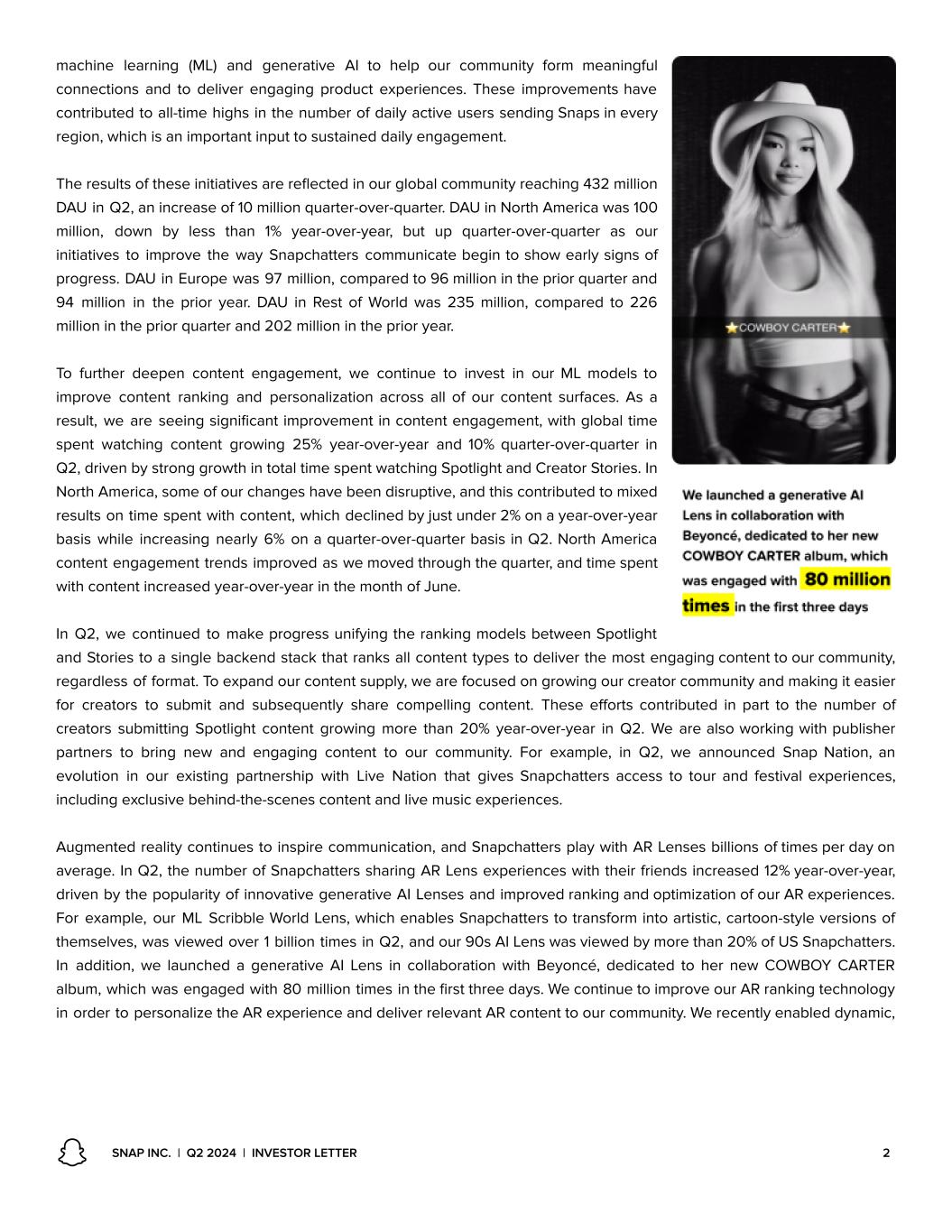 machine learning (ML) and generative AI to help our community form meaningful connections and to deliver engaging product experiences. These improvements have contributed to all-time highs in the number of daily active users sending Snaps in every region, which is an important input to sustained daily engagement. The results of these initiatives are reflected in our global community reaching 432 million DAU in Q2, an increase of 10 million quarter-over-quarter. DAU in North America was 100 million, down by less than 1% year-over-year, but up quarter-over-quarter as our initiatives to improve the way Snapchatters communicate begin to show early signs of progress. DAU in Europe was 97 million, compared to 96 million in the prior quarter and 94 million in the prior year. DAU in Rest of World was 235 million, compared to 226 million in the prior quarter and 202 million in the prior year. To further deepen content engagement, we continue to invest in our ML models to improve content ranking and personalization across all of our content surfaces. As a result, we are seeing significant improvement in content engagement, with global time spent watching content growing 25% year-over-year and 10% quarter-over-quarter in Q2, driven by strong growth in total time spent watching Spotlight and Creator Stories. In North America, some of our changes have been disruptive, and this contributed to mixed results on time spent with content, which declined by just under 2% on a year-over-year basis while increasing nearly 6% on a quarter-over-quarter basis in Q2. North America content engagement trends improved as we moved through the quarter, and time spent with content increased year-over-year in the month of June. In Q2, we continued to make progress unifying the ranking models between Spotlight and Stories to a single backend stack that ranks all content types to deliver the most engaging content to our community, regardless of format. To expand our content supply, we are focused on growing our creator community and making it easier for creators to submit and subsequently share compelling content. These efforts contributed in part to the number of creators submitting Spotlight content growing more than 20% year-over-year in Q2. We are also working with publisher partners to bring new and engaging content to our community. For example, in Q2, we announced Snap Nation, an evolution in our existing partnership with Live Nation that gives Snapchatters access to tour and festival experiences, including exclusive behind-the-scenes content and live music experiences. Augmented reality continues to inspire communication, and Snapchatters play with AR Lenses billions of times per day on average. In Q2, the number of Snapchatters sharing AR Lens experiences with their friends increased 12% year-over-year, driven by the popularity of innovative generative AI Lenses and improved ranking and optimization of our AR experiences. For example, our ML Scribble World Lens, which enables Snapchatters to transform into artistic, cartoon-style versions of themselves, was viewed over 1 billion times in Q2, and our 90s AI Lens was viewed by more than 20% of US Snapchatters. In addition, we launched a generative AI Lens in collaboration with Beyoncé, dedicated to her new COWBOY CARTER album, which was engaged with 80 million times in the first three days. We continue to improve our AR ranking technology in order to personalize the AR experience and deliver relevant AR content to our community. We recently enabled dynamic, SNAP INC. | Q2 2024 | INVESTOR LETTER 2