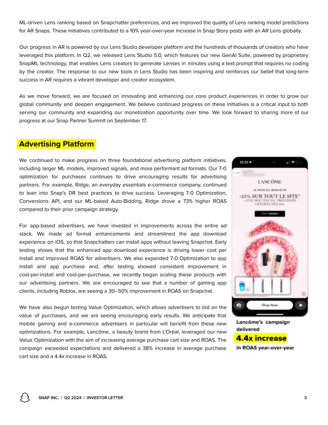 ML-driven Lens ranking based on Snapchatter preferences, and we improved the quality of Lens ranking model predictions for AR Snaps. These initiatives contributed to a 10% year-over-year increase in Snap Story posts with an AR Lens globally. Our progress in AR is powered by our Lens Studio developer platform and the hundreds of thousands of creators who have leveraged this platform. In Q2, we released Lens Studio 5.0, which features our new GenAI Suite, powered by proprietary SnapML technology, that enables Lens creators to generate Lenses in minutes using a text prompt that requires no coding by the creator. The response to our new tools in Lens Studio has been inspiring and reinforces our belief that long-term success in AR requires a vibrant developer and creator ecosystem. As we move forward, we are focused on innovating and enhancing our core product experiences in order to grow our global community and deepen engagement. We believe continued progress on these initiatives is a critical input to both serving our community and expanding our monetization opportunity over time. We look forward to sharing more of our progress at our Snap Partner Summit on September 17.  Advertising Platform  We continued to make progress on three foundational advertising platform initiatives, including larger ML models, improved signals, and more performant ad formats. Our 7-0 optimization for purchases continues to drive encouraging results for advertising partners. For example, Ridge, an everyday essentials e-commerce company, continued to lean into Snap’s DR best practices to drive success. Leveraging 7-0 Optimization, Conversions API, and our ML-based Auto-Bidding, Ridge drove a 73% higher ROAS compared to their prior campaign strategy. For app-based advertisers, we have invested in improvements across the entire ad stack. We made ad format enhancements and streamlined the app download experience on iOS, so that Snapchatters can install apps without leaving Snapchat. Early testing shows that the enhanced app download experience is driving lower cost per install and improved ROAS for advertisers. We also expanded 7-0 Optimization to app install and app purchase and, after testing showed consistent improvement in cost-per-install and cost-per-purchase, we recently began scaling these products with our advertising partners. We are encouraged to see that a number of gaming app clients, including Roblox, are seeing a 30–50% improvement in ROAS on Snapchat. We have also begun testing Value Optimization, which allows advertisers to bid on the value of purchases, and we are seeing encouraging early results. We anticipate that mobile gaming and e-commerce advertisers in particular will benefit from these new optimizations. For example, Lancôme, a beauty brand from L’Oréal, leveraged our new Value Optimization with the aim of increasing average purchase cart size and ROAS. The campaign exceeded expectations and delivered a 38% increase in average purchase cart size and a 4.4x increase in ROAS. SNAP INC. | Q2 2024 | INVESTOR LETTER 3