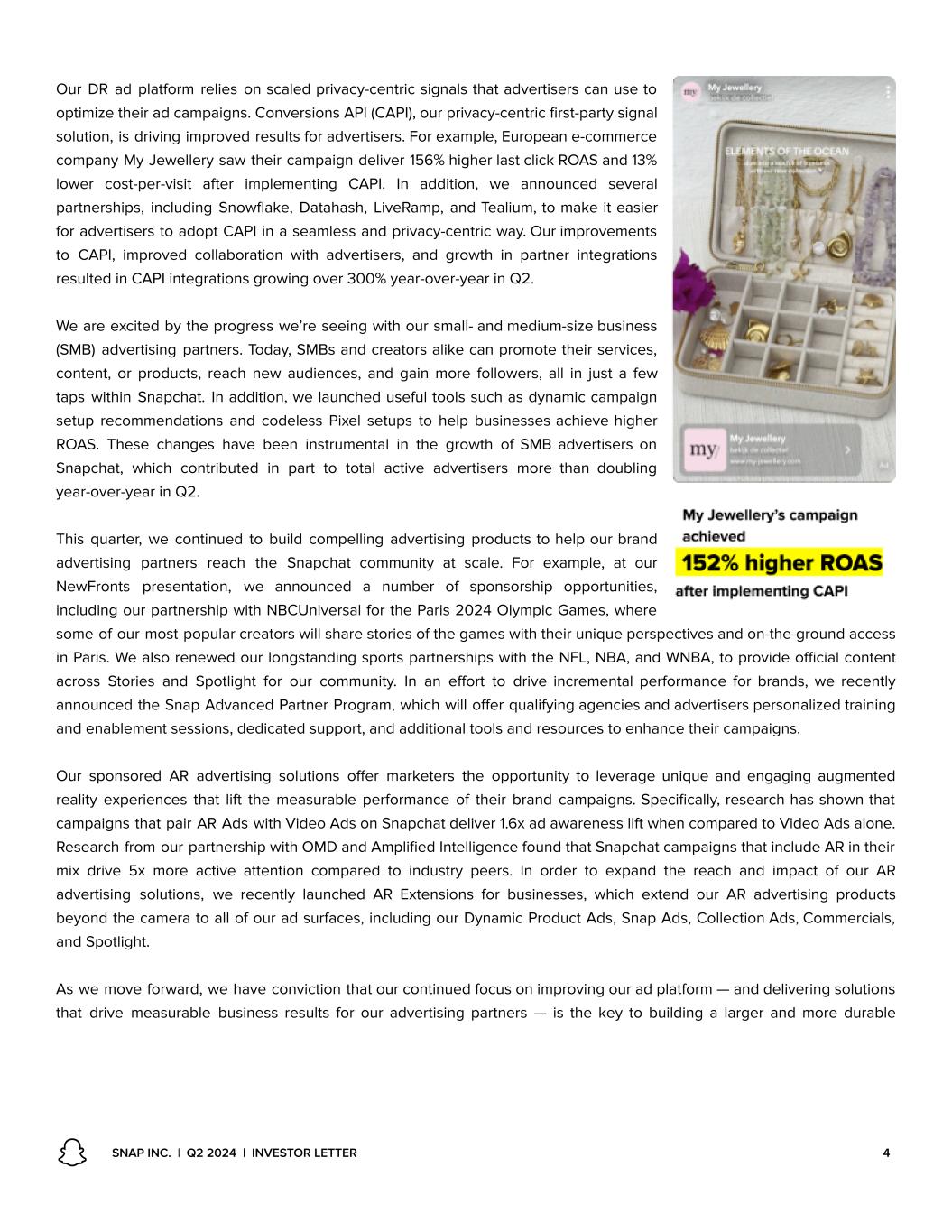 Our DR ad platform relies on scaled privacy-centric signals that advertisers can use to optimize their ad campaigns. Conversions API (CAPI), our privacy-centric first-party signal solution, is driving improved results for advertisers. For example, European e-commerce company My Jewellery saw their campaign deliver 156% higher last click ROAS and 13% lower cost-per-visit after implementing CAPI. In addition, we announced several partnerships, including Snowflake, Datahash, LiveRamp, and Tealium, to make it easier for advertisers to adopt CAPI in a seamless and privacy-centric way. Our improvements to CAPI, improved collaboration with advertisers, and growth in partner integrations resulted in CAPI integrations growing over 300% year-over-year in Q2. We are excited by the progress we’re seeing with our small- and medium-size business (SMB) advertising partners. Today, SMBs and creators alike can promote their services, content, or products, reach new audiences, and gain more followers, all in just a few taps within Snapchat. In addition, we launched useful tools such as dynamic campaign setup recommendations and codeless Pixel setups to help businesses achieve higher ROAS. These changes have been instrumental in the growth of SMB advertisers on Snapchat, which contributed in part to total active advertisers more than doubling year-over-year in Q2. This quarter, we continued to build compelling advertising products to help our brand advertising partners reach the Snapchat community at scale. For example, at our NewFronts presentation, we announced a number of sponsorship opportunities, including our partnership with NBCUniversal for the Paris 2024 Olympic Games, where some of our most popular creators will share stories of the games with their unique perspectives and on-the-ground access in Paris. We also renewed our longstanding sports partnerships with the NFL, NBA, and WNBA, to provide official content across Stories and Spotlight for our community. In an effort to drive incremental performance for brands, we recently announced the Snap Advanced Partner Program, which will offer qualifying agencies and advertisers personalized training and enablement sessions, dedicated support, and additional tools and resources to enhance their campaigns. Our sponsored AR advertising solutions offer marketers the opportunity to leverage unique and engaging augmented reality experiences that lift the measurable performance of their brand campaigns. Specifically, research has shown that campaigns that pair AR Ads with Video Ads on Snapchat deliver 1.6x ad awareness lift when compared to Video Ads alone. Research from our partnership with OMD and Amplified Intelligence found that Snapchat campaigns that include AR in their mix drive 5x more active attention compared to industry peers. In order to expand the reach and impact of our AR advertising solutions, we recently launched AR Extensions for businesses, which extend our AR advertising products beyond the camera to all of our ad surfaces, including our Dynamic Product Ads, Snap Ads, Collection Ads, Commercials, and Spotlight. As we move forward, we have conviction that our continued focus on improving our ad platform — and delivering solutions that drive measurable business results for our advertising partners — is the key to building a larger and more durable SNAP INC. | Q2 2024 | INVESTOR LETTER 4
