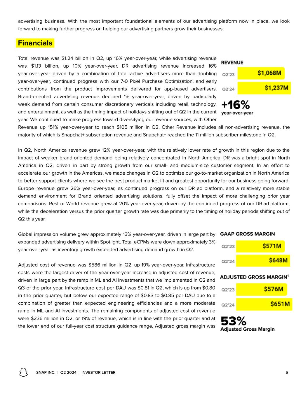 advertising business. With the most important foundational elements of our advertising platform now in place, we look forward to making further progress on helping our advertising partners grow their businesses.  Financials  Total revenue was $1.24 billion in Q2, up 16% year-over-year, while advertising revenue was $1.13 billion, up 10% year-over-year. DR advertising revenue increased 16% year-over-year driven by a combination of total active advertisers more than doubling year-over-year, continued progress with our 7-0 Pixel Purchase Optimization, and early contributions from the product improvements delivered for app-based advertisers. Brand-oriented advertising revenue declined 1% year-over-year, driven by particularly weak demand from certain consumer discretionary verticals including retail, technology, and entertainment, as well as the timing impact of holidays shifting out of Q2 in the current year. We continued to make progress toward diversifying our revenue sources, with Other Revenue up 151% year-over-year to reach $105 million in Q2. Other Revenue includes all non-advertising revenue, the majority of which is Snapchat+ subscription revenue and Snapchat+ reached the 11 million subscriber milestone in Q2. In Q2, North America revenue grew 12% year-over-year, with the relatively lower rate of growth in this region due to the impact of weaker brand-oriented demand being relatively concentrated in North America. DR was a bright spot in North America in Q2, driven in part by strong growth from our small- and medium-size customer segment. In an effort to accelerate our growth in the Americas, we made changes in Q2 to optimize our go-to-market organization in North America to better support clients where we see the best product market fit and greatest opportunity for our business going forward. Europe revenue grew 26% year-over-year, as continued progress on our DR ad platform, and a relatively more stable demand environment for Brand oriented advertising solutions, fully offset the impact of more challenging prior year comparisons. Rest of World revenue grew at 20% year-over-year, driven by the continued progress of our DR ad platform, while the deceleration versus the prior quarter growth rate was due primarily to the timing of holiday periods shifting out of Q2 this year. Global impression volume grew approximately 13% year-over-year, driven in large part by expanded advertising delivery within Spotlight. Total eCPMs were down approximately 3% year-over-year as inventory growth exceeded advertising demand growth in Q2. Adjusted cost of revenue was $586 million in Q2, up 19% year-over-year. Infrastructure costs were the largest driver of the year-over-year increase in adjusted cost of revenue, driven in large part by the ramp in ML and AI investments that we implemented in Q2 and Q3 of the prior year. Infrastructure cost per DAU was $0.81 in Q2, which is up from $0.80 in the prior quarter, but below our expected range of $0.83 to $0.85 per DAU due to a combination of greater than expected engineering efficiencies and a more moderate ramp in ML and AI investments. The remaining components of adjusted cost of revenue were $236 million in Q2, or 19% of revenue, which is in line with the prior quarter and at the lower end of our full-year cost structure guidance range. Adjusted gross margin was SNAP INC. | Q2 2024 | INVESTOR LETTER 5