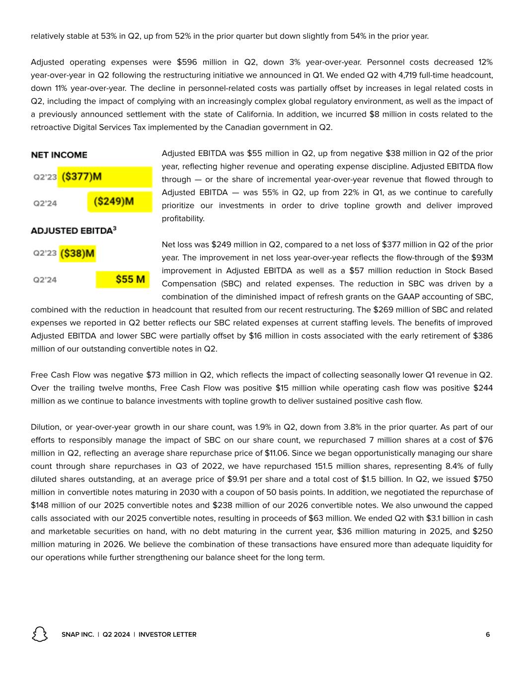 relatively stable at 53% in Q2, up from 52% in the prior quarter but down slightly from 54% in the prior year. Adjusted operating expenses were $596 million in Q2, down 3% year-over-year. Personnel costs decreased 12% year-over-year in Q2 following the restructuring initiative we announced in Q1. We ended Q2 with 4,719 full-time headcount, down 11% year-over-year. The decline in personnel-related costs was partially offset by increases in legal related costs in Q2, including the impact of complying with an increasingly complex global regulatory environment, as well as the impact of a previously announced settlement with the state of California. In addition, we incurred $8 million in costs related to the retroactive Digital Services Tax implemented by the Canadian government in Q2. Adjusted EBITDA was $55 million in Q2, up from negative $38 million in Q2 of the prior year, reflecting higher revenue and operating expense discipline. Adjusted EBITDA flow through — or the share of incremental year-over-year revenue that flowed through to Adjusted EBITDA — was 55% in Q2, up from 22% in Q1, as we continue to carefully prioritize our investments in order to drive topline growth and deliver improved profitability. Net loss was $249 million in Q2, compared to a net loss of $377 million in Q2 of the prior year. The improvement in net loss year-over-year reflects the flow-through of the $93M improvement in Adjusted EBITDA as well as a $57 million reduction in Stock Based Compensation (SBC) and related expenses. The reduction in SBC was driven by a combination of the diminished impact of refresh grants on the GAAP accounting of SBC, combined with the reduction in headcount that resulted from our recent restructuring. The $269 million of SBC and related expenses we reported in Q2 better reflects our SBC related expenses at current staffing levels. The benefits of improved Adjusted EBITDA and lower SBC were partially offset by $16 million in costs associated with the early retirement of $386 million of our outstanding convertible notes in Q2. Free Cash Flow was negative $73 million in Q2, which reflects the impact of collecting seasonally lower Q1 revenue in Q2. Over the trailing twelve months, Free Cash Flow was positive $15 million while operating cash flow was positive $244 million as we continue to balance investments with topline growth to deliver sustained positive cash flow. Dilution, or year-over-year growth in our share count, was 1.9% in Q2, down from 3.8% in the prior quarter. As part of our efforts to responsibly manage the impact of SBC on our share count, we repurchased 7 million shares at a cost of $76 million in Q2, reflecting an average share repurchase price of $11.06. Since we began opportunistically managing our share count through share repurchases in Q3 of 2022, we have repurchased 151.5 million shares, representing 8.4% of fully diluted shares outstanding, at an average price of $9.91 per share and a total cost of $1.5 billion. In Q2, we issued $750 million in convertible notes maturing in 2030 with a coupon of 50 basis points. In addition, we negotiated the repurchase of $148 million of our 2025 convertible notes and $238 million of our 2026 convertible notes. We also unwound the capped calls associated with our 2025 convertible notes, resulting in proceeds of $63 million. We ended Q2 with $3.1 billion in cash and marketable securities on hand, with no debt maturing in the current year, $36 million maturing in 2025, and $250 million maturing in 2026. We believe the combination of these transactions have ensured more than adequate liquidity for our operations while further strengthening our balance sheet for the long term. SNAP INC. | Q2 2024 | INVESTOR LETTER 6