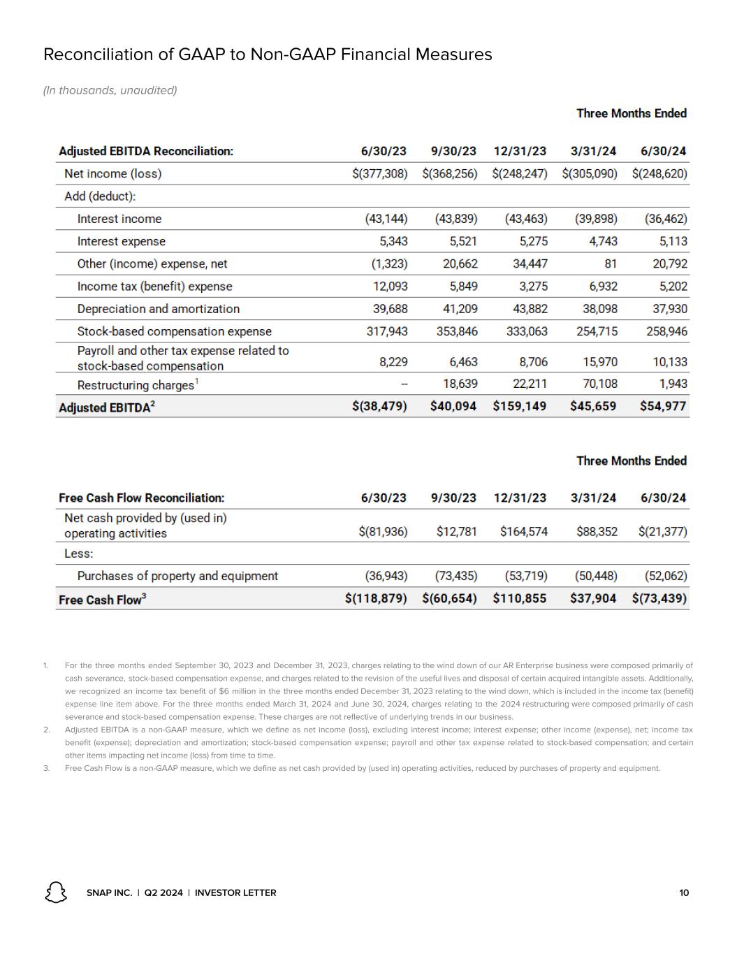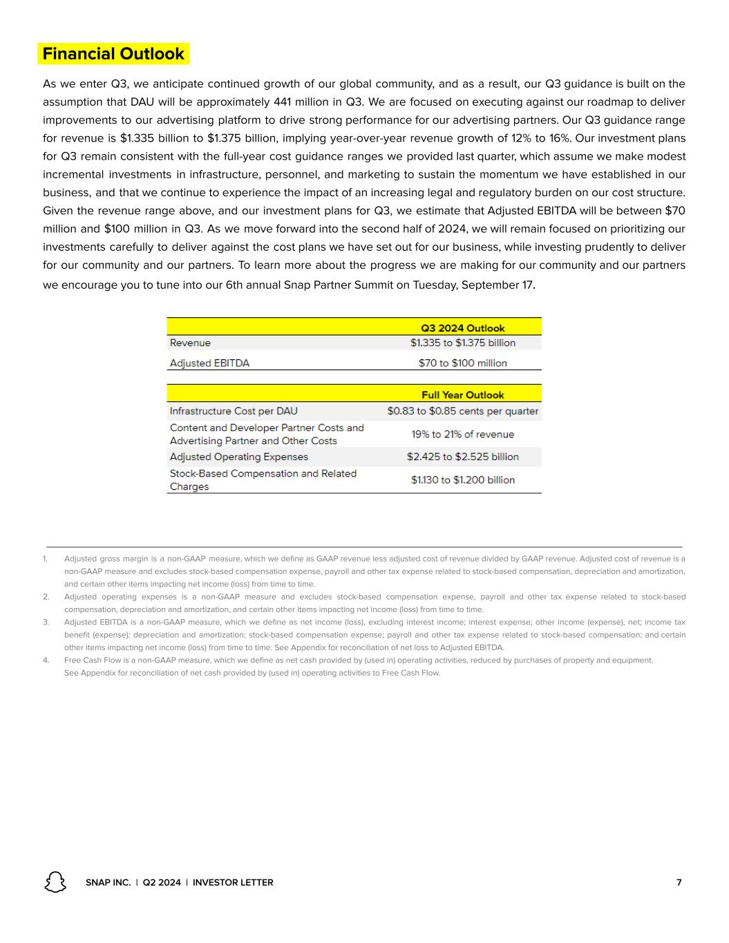 Financial Outlook  As we enter Q3, we anticipate continued growth of our global community, and as a result, our Q3 guidance is built on the assumption that DAU will be approximately 441 million in Q3. We are focused on executing against our roadmap to deliver improvements to our advertising platform to drive strong performance for our advertising partners. Our Q3 guidance range for revenue is $1.335 billion to $1.375 billion, implying year-over-year revenue growth of 12% to 16%. Our investment plans for Q3 remain consistent with the full-year cost guidance ranges we provided last quarter, which assume we make modest incremental investments in infrastructure, personnel, and marketing to sustain the momentum we have established in our business, and that we continue to experience the impact of an increasing legal and regulatory burden on our cost structure. Given the revenue range above, and our investment plans for Q3, we estimate that Adjusted EBITDA will be between $70 million and $100 million in Q3. As we move forward into the second half of 2024, we will remain focused on prioritizing our investments carefully to deliver against the cost plans we have set out for our business, while investing prudently to deliver for our community and our partners. To learn more about the progress we are making for our community and our partners we encourage you to tune into our 6th annual Snap Partner Summit on Tuesday, September 17. 1. Adjusted gross margin is a non-GAAP measure, which we define as GAAP revenue less adjusted cost of revenue divided by GAAP revenue. Adjusted cost of revenue is a non-GAAP measure and excludes stock-based compensation expense, payroll and other tax expense related to stock-based compensation, depreciation and amortization, and certain other items impacting net income (loss) from time to time. 2. Adjusted operating expenses is a non-GAAP measure and excludes stock-based compensation expense, payroll and other tax expense related to stock-based compensation, depreciation and amortization, and certain other items impacting net income (loss) from time to time. 3. Adjusted EBITDA is a non-GAAP measure, which we define as net income (loss), excluding interest income; interest expense; other income (expense), net; income tax benefit (expense); depreciation and amortization; stock-based compensation expense; payroll and other tax expense related to stock-based compensation; and certain other items impacting net income (loss) from time to time. See Appendix for reconciliation of net loss to Adjusted EBITDA. 4. Free Cash Flow is a non-GAAP measure, which we define as net cash provided by (used in) operating activities, reduced by purchases of property and equipment. See Appendix for reconciliation of net cash provided by (used in) operating activities to Free Cash Flow. SNAP INC. | Q2 2024 | INVESTOR LETTER 7