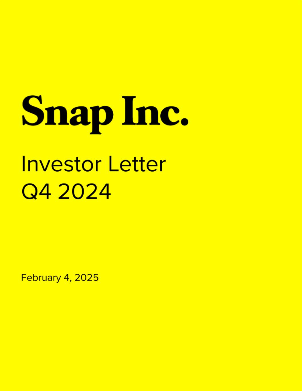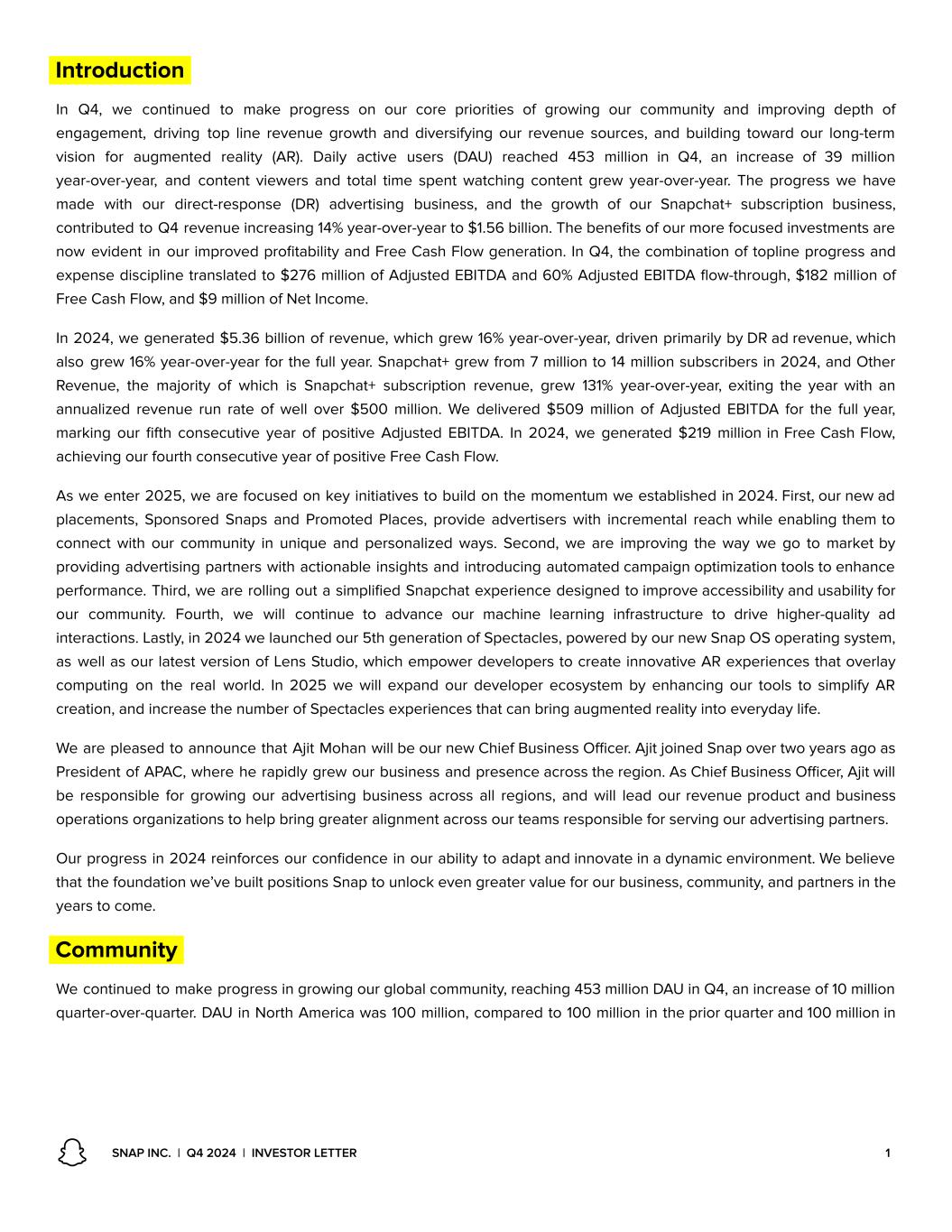 Introduction  In Q4, we continued to make progress on our core priorities of growing our community and improving depth of engagement, driving top line revenue growth and diversifying our revenue sources, and building toward our long-term vision for augmented reality (AR). Daily active users (DAU) reached 453 million in Q4, an increase of 39 million year-over-year, and content viewers and total time spent watching content grew year-over-year. The progress we have made with our direct-response (DR) advertising business, and the growth of our Snapchat+ subscription business, contributed to Q4 revenue increasing 14% year-over-year to $1.56 billion. The benefits of our more focused investments are now evident in our improved profitability and Free Cash Flow generation. In Q4, the combination of topline progress and expense discipline translated to $276 million of Adjusted EBITDA and 60% Adjusted EBITDA flow-through, $182 million of Free Cash Flow, and $9 million of Net Income. In 2024, we generated $5.36 billion of revenue, which grew 16% year-over-year, driven primarily by DR ad revenue, which also grew 16% year-over-year for the full year. Snapchat+ grew from 7 million to 14 million subscribers in 2024, and Other Revenue, the majority of which is Snapchat+ subscription revenue, grew 131% year-over-year, exiting the year with an annualized revenue run rate of well over $500 million. We delivered $509 million of Adjusted EBITDA for the full year, marking our fifth consecutive year of positive Adjusted EBITDA. In 2024, we generated $219 million in Free Cash Flow, achieving our fourth consecutive year of positive Free Cash Flow. As we enter 2025, we are focused on key initiatives to build on the momentum we established in 2024. First, our new ad placements, Sponsored Snaps and Promoted Places, provide advertisers with incremental reach while enabling them to connect with our community in unique and personalized ways. Second, we are improving the way we go to market by providing advertising partners with actionable insights and introducing automated campaign optimization tools to enhance performance. Third, we are rolling out a simplified Snapchat experience designed to improve accessibility and usability for our community. Fourth, we will continue to advance our machine learning infrastructure to drive higher-quality ad interactions. Lastly, in 2024 we launched our 5th generation of Spectacles, powered by our new Snap OS operating system, as well as our latest version of Lens Studio, which empower developers to create innovative AR experiences that overlay computing on the real world. In 2025 we will expand our developer ecosystem by enhancing our tools to simplify AR creation, and increase the number of Spectacles experiences that can bring augmented reality into everyday life. We are pleased to announce that Ajit Mohan will be our new Chief Business Officer. Ajit joined Snap over two years ago as President of APAC, where he rapidly grew our business and presence across the region. As Chief Business Officer, Ajit will be responsible for growing our advertising business across all regions, and will lead our revenue product and business operations organizations to help bring greater alignment across our teams responsible for serving our advertising partners. Our progress in 2024 reinforces our confidence in our ability to adapt and innovate in a dynamic environment. We believe that the foundation we’ve built positions Snap to unlock even greater value for our business, community, and partners in the years to come.  Community  We continued to make progress in growing our global community, reaching 453 million DAU in Q4, an increase of 10 million quarter-over-quarter. DAU in North America was 100 million, compared to 100 million in the prior quarter and 100 million in SNAP INC. | Q4 2024 | INVESTOR LETTER 1