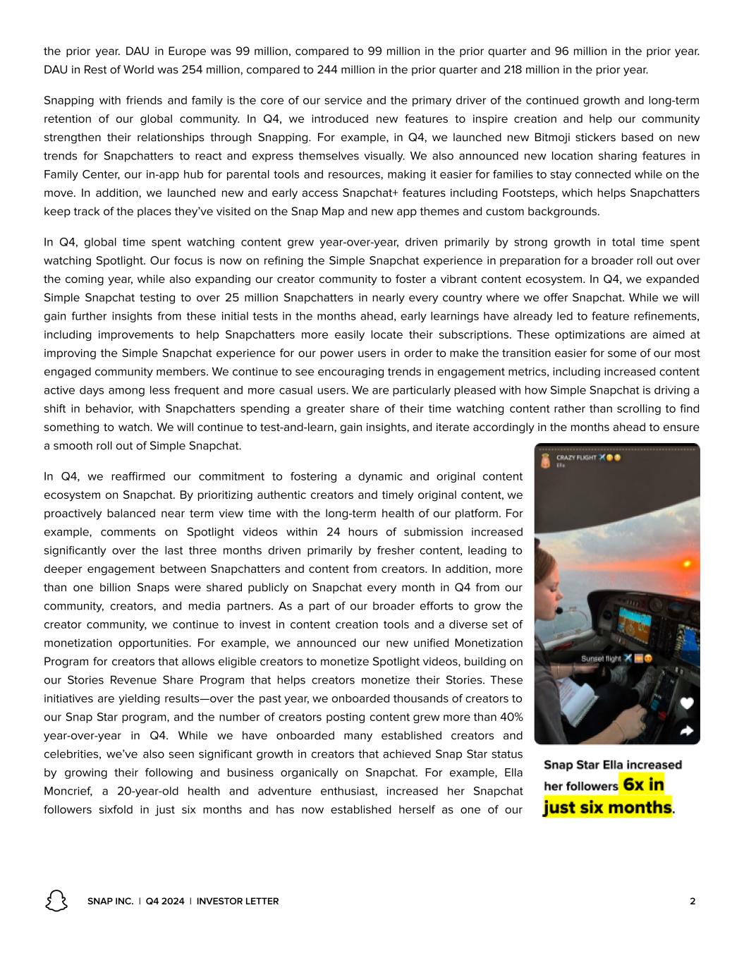the prior year. DAU in Europe was 99 million, compared to 99 million in the prior quarter and 96 million in the prior year. DAU in Rest of World was 254 million, compared to 244 million in the prior quarter and 218 million in the prior year. Snapping with friends and family is the core of our service and the primary driver of the continued growth and long-term retention of our global community. In Q4, we introduced new features to inspire creation and help our community strengthen their relationships through Snapping. For example, in Q4, we launched new Bitmoji stickers based on new trends for Snapchatters to react and express themselves visually. We also announced new location sharing features in Family Center, our in-app hub for parental tools and resources, making it easier for families to stay connected while on the move. In addition, we launched new and early access Snapchat+ features including Footsteps, which helps Snapchatters keep track of the places they’ve visited on the Snap Map and new app themes and custom backgrounds. In Q4, global time spent watching content grew year-over-year, driven primarily by strong growth in total time spent watching Spotlight. Our focus is now on refining the Simple Snapchat experience in preparation for a broader roll out over the coming year, while also expanding our creator community to foster a vibrant content ecosystem. In Q4, we expanded Simple Snapchat testing to over 25 million Snapchatters in nearly every country where we offer Snapchat. While we will gain further insights from these initial tests in the months ahead, early learnings have already led to feature refinements, including improvements to help Snapchatters more easily locate their subscriptions. These optimizations are aimed at improving the Simple Snapchat experience for our power users in order to make the transition easier for some of our most engaged community members. We continue to see encouraging trends in engagement metrics, including increased content active days among less frequent and more casual users. We are particularly pleased with how Simple Snapchat is driving a shift in behavior, with Snapchatters spending a greater share of their time watching content rather than scrolling to find something to watch. We will continue to test-and-learn, gain insights, and iterate accordingly in the months ahead to ensure a smooth roll out of Simple Snapchat. In Q4, we reaffirmed our commitment to fostering a dynamic and original content ecosystem on Snapchat. By prioritizing authentic creators and timely original content, we proactively balanced near term view time with the long-term health of our platform. For example, comments on Spotlight videos within 24 hours of submission increased significantly over the last three months driven primarily by fresher content, leading to deeper engagement between Snapchatters and content from creators. In addition, more than one billion Snaps were shared publicly on Snapchat every month in Q4 from our community, creators, and media partners. As a part of our broader efforts to grow the creator community, we continue to invest in content creation tools and a diverse set of monetization opportunities. For example, we announced our new unified Monetization Program for creators that allows eligible creators to monetize Spotlight videos, building on our Stories Revenue Share Program that helps creators monetize their Stories. These initiatives are yielding results—over the past year, we onboarded thousands of creators to our Snap Star program, and the number of creators posting content grew more than 40% year-over-year in Q4. While we have onboarded many established creators and celebrities, we’ve also seen significant growth in creators that achieved Snap Star status by growing their following and business organically on Snapchat. For example, Ella Moncrief, a 20-year-old health and adventure enthusiast, increased her Snapchat followers sixfold in just six months and has now established herself as one of our SNAP INC. | Q4 2024 | INVESTOR LETTER 2