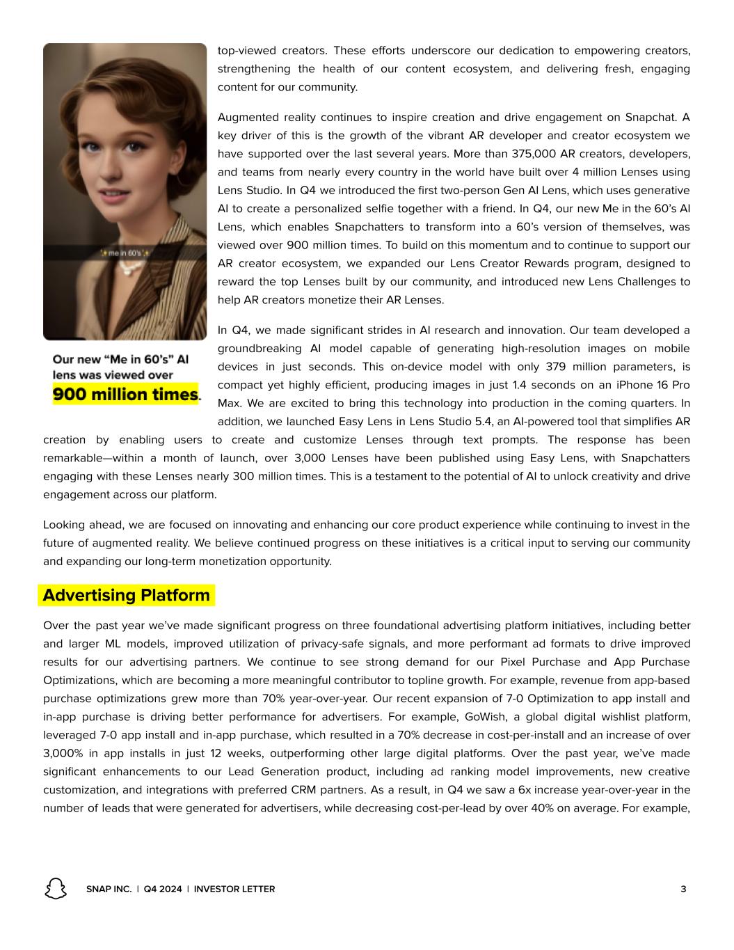 top-viewed creators. These efforts underscore our dedication to empowering creators, strengthening the health of our content ecosystem, and delivering fresh, engaging content for our community. Augmented reality continues to inspire creation and drive engagement on Snapchat. A key driver of this is the growth of the vibrant AR developer and creator ecosystem we have supported over the last several years. More than 375,000 AR creators, developers, and teams from nearly every country in the world have built over 4 million Lenses using Lens Studio. In Q4 we introduced the first two-person Gen AI Lens, which uses generative AI to create a personalized selfie together with a friend. In Q4, our new Me in the 60’s AI Lens, which enables Snapchatters to transform into a 60’s version of themselves, was viewed over 900 million times. To build on this momentum and to continue to support our AR creator ecosystem, we expanded our Lens Creator Rewards program, designed to reward the top Lenses built by our community, and introduced new Lens Challenges to help AR creators monetize their AR Lenses. In Q4, we made significant strides in AI research and innovation. Our team developed a groundbreaking AI model capable of generating high-resolution images on mobile devices in just seconds. This on-device model with only 379 million parameters, is compact yet highly efficient, producing images in just 1.4 seconds on an iPhone 16 Pro Max. We are excited to bring this technology into production in the coming quarters. In addition, we launched Easy Lens in Lens Studio 5.4, an AI-powered tool that simplifies AR creation by enabling users to create and customize Lenses through text prompts. The response has been remarkable—within a month of launch, over 3,000 Lenses have been published using Easy Lens, with Snapchatters engaging with these Lenses nearly 300 million times. This is a testament to the potential of AI to unlock creativity and drive engagement across our platform. Looking ahead, we are focused on innovating and enhancing our core product experience while continuing to invest in the future of augmented reality. We believe continued progress on these initiatives is a critical input to serving our community and expanding our long-term monetization opportunity.  Advertising Platform  Over the past year we’ve made significant progress on three foundational advertising platform initiatives, including better and larger ML models, improved utilization of privacy-safe signals, and more performant ad formats to drive improved results for our advertising partners. We continue to see strong demand for our Pixel Purchase and App Purchase Optimizations, which are becoming a more meaningful contributor to topline growth. For example, revenue from app-based purchase optimizations grew more than 70% year-over-year. Our recent expansion of 7-0 Optimization to app install and in-app purchase is driving better performance for advertisers. For example, GoWish, a global digital wishlist platform, leveraged 7-0 app install and in-app purchase, which resulted in a 70% decrease in cost-per-install and an increase of over 3,000% in app installs in just 12 weeks, outperforming other large digital platforms. Over the past year, we’ve made significant enhancements to our Lead Generation product, including ad ranking model improvements, new creative customization, and integrations with preferred CRM partners. As a result, in Q4 we saw a 6x increase year-over-year in the number of leads that were generated for advertisers, while decreasing cost-per-lead by over 40% on average. For example, SNAP INC. | Q4 2024 | INVESTOR LETTER 3