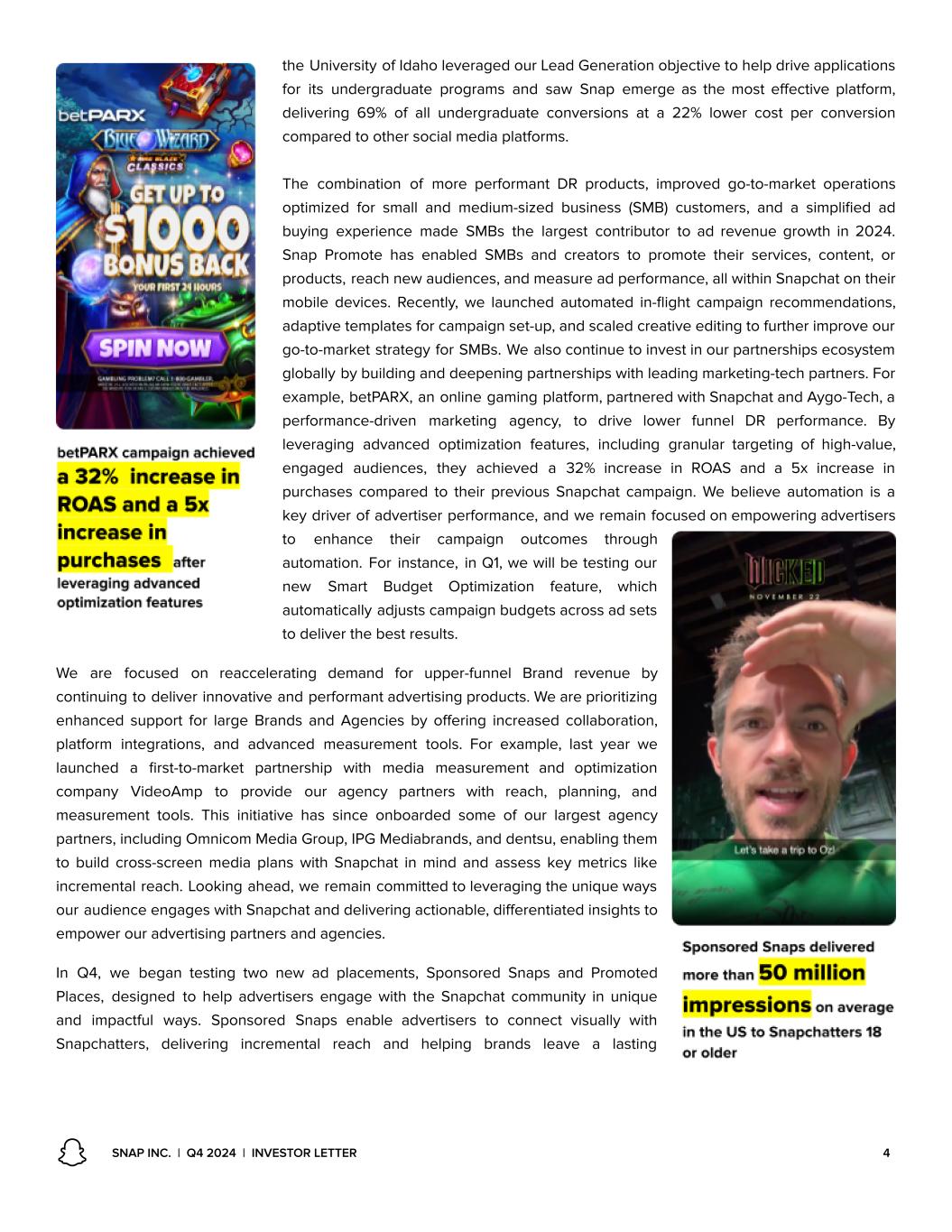 the University of Idaho leveraged our Lead Generation objective to help drive applications for its undergraduate programs and saw Snap emerge as the most effective platform, delivering 69% of all undergraduate conversions at a 22% lower cost per conversion compared to other social media platforms. The combination of more performant DR products, improved go-to-market operations optimized for small and medium-sized business (SMB) customers, and a simplified ad buying experience made SMBs the largest contributor to ad revenue growth in 2024. Snap Promote has enabled SMBs and creators to promote their services, content, or products, reach new audiences, and measure ad performance, all within Snapchat on their mobile devices. Recently, we launched automated in-flight campaign recommendations, adaptive templates for campaign set-up, and scaled creative editing to further improve our go-to-market strategy for SMBs. We also continue to invest in our partnerships ecosystem globally by building and deepening partnerships with leading marketing-tech partners. For example, betPARX, an online gaming platform, partnered with Snapchat and Aygo-Tech, a performance-driven marketing agency, to drive lower funnel DR performance. By leveraging advanced optimization features, including granular targeting of high-value, engaged audiences, they achieved a 32% increase in ROAS and a 5x increase in purchases compared to their previous Snapchat campaign. We believe automation is a key driver of advertiser performance, and we remain focused on empowering advertisers to enhance their campaign outcomes through automation. For instance, in Q1, we will be testing our new Smart Budget Optimization feature, which automatically adjusts campaign budgets across ad sets to deliver the best results. We are focused on reaccelerating demand for upper-funnel Brand revenue by continuing to deliver innovative and performant advertising products. We are prioritizing enhanced support for large Brands and Agencies by offering increased collaboration, platform integrations, and advanced measurement tools. For example, last year we launched a first-to-market partnership with media measurement and optimization company VideoAmp to provide our agency partners with reach, planning, and measurement tools. This initiative has since onboarded some of our largest agency partners, including Omnicom Media Group, IPG Mediabrands, and dentsu, enabling them to build cross-screen media plans with Snapchat in mind and assess key metrics like incremental reach. Looking ahead, we remain committed to leveraging the unique ways our audience engages with Snapchat and delivering actionable, differentiated insights to empower our advertising partners and agencies. In Q4, we began testing two new ad placements, Sponsored Snaps and Promoted Places, designed to help advertisers engage with the Snapchat community in unique and impactful ways. Sponsored Snaps enable advertisers to connect visually with Snapchatters, delivering incremental reach and helping brands leave a lasting SNAP INC. | Q4 2024 | INVESTOR LETTER 4