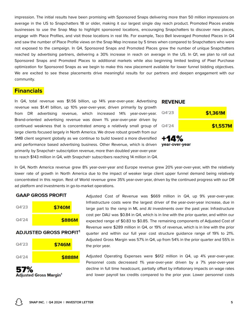 impression. The initial results have been promising with Sponsored Snaps delivering more than 50 million impressions on average in the US to Snapchatters 18 or older, making it our largest single day reach product. Promoted Places enable businesses to use the Snap Map to highlight sponsored locations, encouraging Snapchatters to discover new places, engage with Place Profiles, and visit those locations in real life. For example, Taco Bell leveraged Promoted Places in Q4 and saw the number of Place Profile views on the Snap Map increase by 5 times when compared to Snapchatters who were not exposed to the campaign. In Q4, Sponsored Snaps and Promoted Places grew the number of unique Snapchatters reached by advertising partners, delivering a 30% increase in reach on average in the US. In Q1, we plan to roll out Sponsored Snaps and Promoted Places to additional markets while also beginning limited testing of Pixel Purchase optimization for Sponsored Snaps as we begin to make this new placement available for lower funnel bidding objectives. We are excited to see these placements drive meaningful results for our partners and deepen engagement with our community.  Financials  In Q4, total revenue was $1.56 billion, up 14% year-over-year. Advertising revenue was $1.41 billion, up 10% year-over-year, driven primarily by growth from DR advertising revenue, which increased 14% year-over-year. Brand-oriented advertising revenue was down 1% year-over-year driven by continued weakness that is concentrated among a relatively small group of large clients focused largely in North America. We drove robust growth from our SMB client segment globally as we continue to build toward a more diversified and performance based advertising business. Other Revenue, which is driven primarily by Snapchat+ subscription revenue, more than doubled year-over-year to reach $143 million in Q4, with Snapchat+ subscribers reaching 14 million in Q4. In Q4, North America revenue grew 8% year-over-year and Europe revenue grew 20% year-over-year, with the relatively lower rate of growth in North America due to the impact of weaker large client upper funnel demand being relatively concentrated in this region. Rest of World revenue grew 35% year-over-year, driven by the continued progress with our DR ad platform and investments in go-to-market operations. Adjusted Cost of Revenue was $669 million in Q4, up 9% year-over-year. Infrastructure costs were the largest driver of the year-over-year increase, due in large part to the ramp in ML and AI investments over the past year. Infrastructure cost per DAU was $0.84 in Q4, which is in line with the prior quarter, and within our expected range of $0.83 to $0.85. The remaining components of Adjusted Cost of Revenue were $289 million in Q4, or 19% of revenue, which is in line with the prior quarter and within our full year cost structure guidance range of 19% to 21%. Adjusted Gross Margin was 57% in Q4, up from 54% in the prior quarter and 55% in the prior year. Adjusted Operating Expenses were $612 million in Q4, up 4% year-over-year. Personnel costs decreased 1% year-over-year driven by a 7% year-over-year decline in full time headcount, partially offset by inflationary impacts on wage rates and lower payroll tax credits compared to the prior year. Lower personnel costs SNAP INC. | Q4 2024 | INVESTOR LETTER 5