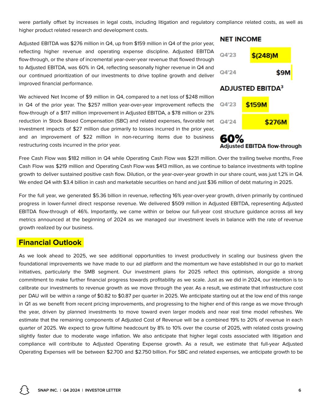 were partially offset by increases in legal costs, including litigation and regulatory compliance related costs, as well as higher product related research and development costs. Adjusted EBITDA was $276 million in Q4, up from $159 million in Q4 of the prior year, reflecting higher revenue and operating expense discipline. Adjusted EBITDA flow-through, or the share of incremental year-over-year revenue that flowed through to Adjusted EBITDA, was 60% in Q4, reflecting seasonally higher revenue in Q4 and our continued prioritization of our investments to drive topline growth and deliver improved financial performance. We achieved Net Income of $9 million in Q4, compared to a net loss of $248 million in Q4 of the prior year. The $257 million year-over-year improvement reflects the flow-through of a $117 million improvement in Adjusted EBITDA, a $78 million or 23% reduction in Stock Based Compensation (SBC) and related expenses, favorable net investment impacts of $27 million due primarily to losses incurred in the prior year, and an improvement of $22 million in non-recurring items due to business restructuring costs incurred in the prior year. Free Cash Flow was $182 million in Q4 while Operating Cash Flow was $231 million. Over the trailing twelve months, Free Cash Flow was $219 million and Operating Cash Flow was $413 million, as we continue to balance investments with topline growth to deliver sustained positive cash flow. Dilution, or the year-over-year growth in our share count, was just 1.2% in Q4. We ended Q4 with $3.4 billion in cash and marketable securities on hand and just $36 million of debt maturing in 2025. For the full year, we generated $5.36 billion in revenue, reflecting 16% year-over-year growth, driven primarily by continued progress in lower-funnel direct response revenue. We delivered $509 million in Adjusted EBITDA, representing Adjusted EBITDA flow-through of 46%. Importantly, we came within or below our full-year cost structure guidance across all key metrics announced at the beginning of 2024 as we managed our investment levels in balance with the rate of revenue growth realized by our business.  Financial Outlook  As we look ahead to 2025, we see additional opportunities to invest productively in scaling our business given the foundational improvements we have made to our ad platform and the momentum we have established in our go to market initiatives, particularly the SMB segment. Our investment plans for 2025 reflect this optimism, alongside a strong commitment to make further financial progress towards profitability as we scale. Just as we did in 2024, our intention is to calibrate our investments to revenue growth as we move through the year. As a result, we estimate that infrastructure cost per DAU will be within a range of $0.82 to $0.87 per quarter in 2025. We anticipate starting out at the low end of this range in Q1 as we benefit from recent pricing improvements, and progressing to the higher end of this range as we move through the year, driven by planned investments to move toward even larger models and near real time model refreshes. We estimate that the remaining components of Adjusted Cost of Revenue will be a combined 19% to 20% of revenue in each quarter of 2025. We expect to grow fulltime headcount by 8% to 10% over the course of 2025, with related costs growing slightly faster due to moderate wage inflation. We also anticipate that higher legal costs associated with litigation and compliance will contribute to Adjusted Operating Expense growth. As a result, we estimate that full-year Adjusted Operating Expenses will be between $2.700 and $2.750 billion. For SBC and related expenses, we anticipate growth to be SNAP INC. | Q4 2024 | INVESTOR LETTER 6