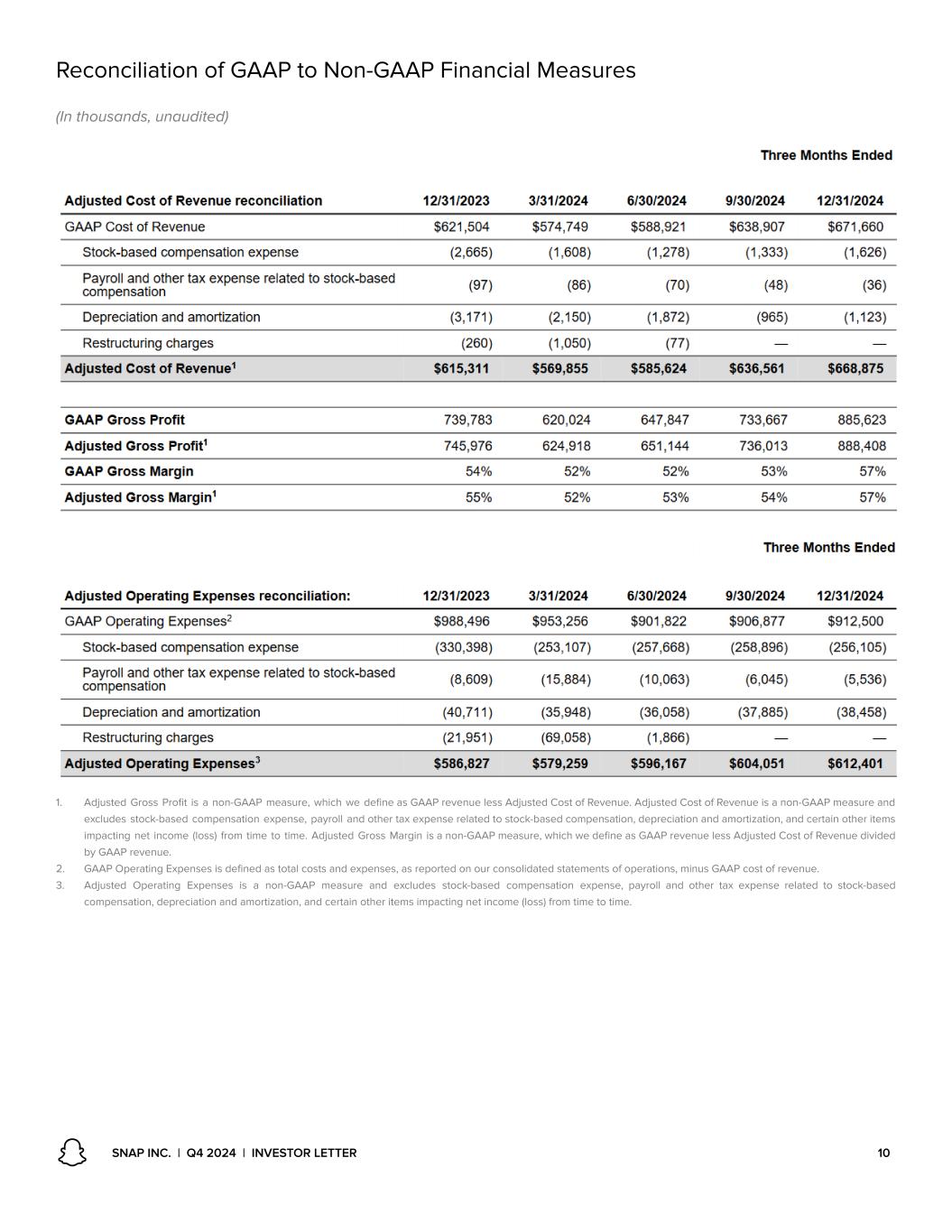 Forward Looking Statements This letter contains forward-looking statements within the meaning of Section 27A of the Securities Act of 1933, as amended, or the Securities Act, and Section 21E of the Securities Exchange Act of 1934, as amended, or the Exchange Act about us and our industry that involve substantial risks and uncertainties. All statements other than statements of historical facts contained in this letter, including statements regarding guidance, our future results of operations or financial condition, future stock repurchase programs or stock dividends, business strategy and plans, user growth and engagement, product initiatives, objectives of management for future operations, and advertiser and partner offerings, are forward-looking statements. In some cases, you can identify forward-looking statements because they contain words such as “anticipate,” “believe,” “contemplate,” “continue,” “could,” “estimate,” “expect,” “going to,” “intend,” “may,” “plan,” “potential,” “predict,” “project,” “should,” “target,” “will,” or “would” or the negative of these words or other similar terms or expressions. We caution you that the foregoing may not include all of the forward-looking statements made in this letter. You should not rely on forward-looking statements as predictions of future events. We have based the forward-looking statements contained in this letter primarily on our current expectations and projections about future events and trends, including our financial outlook, macroeconomic uncertainty, and geo-political events and conflicts, that we believe may continue to affect our business, financial condition, results of operations, and prospects. These forward-looking statements are subject to risks and uncertainties related to: our financial performance; our ability to attain and sustain profitability; our ability to generate and sustain positive cash flow; our ability to attract and retain users, partners, and advertisers; competition and new market entrants; managing our growth and future expenses; compliance with new laws, regulations, and executive actions; our ability to maintain, protect, and enhance our intellectual property; our ability to succeed in existing and new market segments; our ability to attract and retain qualified team members and key personnel; our ability to repay or refinance outstanding debt, or to access additional financing; future acquisitions, divestitures, or investments; and the potential adverse impact of climate change, natural disasters, health epidemics, macroeconomic conditions, and war or other armed conflict, as well as risks, uncertainties, and other factors described in “Risk Factors” and elsewhere in our most recent periodic report filed with the U.S. Securities and Exchange Commission, or SEC, which is available on the SEC’s website at www.sec.gov. Additional information will be made available in Snap Inc.’s periodic report that will be filed with the SEC for the period covered by this letter and other filings that we make from time to time with the SEC. In addition, any forward-looking statements contained in this letter are based on assumptions that we believe to be reasonable as of this date. We undertake no obligation to update any forward-looking statements to reflect events or circumstances after the date of this letter or to reflect new information or the occurrence of unanticipated events, including future developments related to geo-political events and conflicts and macroeconomic conditions, except as required by law. Non-GAAP Financial Measures To supplement our consolidated financial statements, which are prepared and presented in accordance with GAAP, we use certain non-GAAP financial measures, as described below, to understand and evaluate our core operating performance. These non-GAAP financial measures, which may be different than similarly titled measures used by other companies, are presented to enhance investors’ overall understanding of our financial performance and should not be considered a substitute for, or superior to, the financial information prepared and presented in accordance with GAAP. We use the non-GAAP financial measure of Free Cash Flow, which is defined as net cash provided by (used in) operating activities, reduced by purchases of property and equipment. We believe Free Cash Flow is an important liquidity measure of the cash that is available, after capital expenditures, for operational expenses and investment in our business and is a key financial indicator used by management. Additionally, we believe that Free Cash Flow is an important measure since we use third-party infrastructure partners to host our services and therefore we do not incur significant capital expenditures to support revenue generating activities. Free Cash Flow is useful to investors as a liquidity measure because it measures our ability to generate or use cash. Once our business needs and obligations are met, cash can be used to maintain a strong balance sheet and invest in future growth. We use the non-GAAP financial measure of Adjusted EBITDA, which is defined as net income (loss), excluding interest income; interest expense; other income (expense), net; income tax benefit (expense); depreciation and amortization; stock-based compensation expense; payroll and other tax expense related to stock-based compensation; and certain other items impacting net income (loss) from time to time. We believe that Adjusted EBITDA helps identify underlying trends in our business that could otherwise be masked by the effect of the expenses that we exclude in Adjusted EBITDA. We use other non-GAAP financial measures such as Adjusted Cost of Revenue and Adjusted Operating Expenses. These measures are defined as their respective GAAP expense line items, excluding interest income; interest expense; other income (expense), net; income tax benefit (expense); deprecia