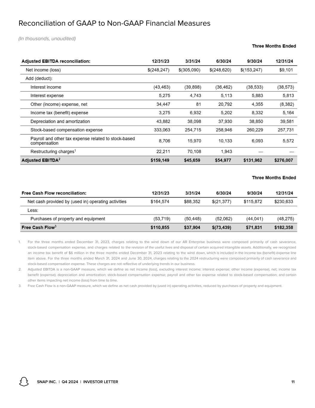 Reconciliation of GAAP to Non-GAAP Financial Measures (In thousands, unaudited) 1. Adjusted Gross Profit is a non-GAAP measure, which we define as GAAP revenue less Adjusted Cost of Revenue. Adjusted Cost of Revenue is a non-GAAP measure and excludes stock-based compensation expense, payroll and other tax expense related to stock-based compensation, depreciation and amortization, and certain other items impacting net income (loss) from time to time. Adjusted Gross Margin is a non-GAAP measure, which we define as GAAP revenue less Adjusted Cost of Revenue divided by GAAP revenue. 2. GAAP Operating Expenses is defined as total costs and expenses, as reported on our consolidated statements of operations, minus GAAP cost of revenue. 3. Adjusted Operating Expenses is a non-GAAP measure and excludes stock-based compensation expense, payroll and other tax expense related to stock-based compensation, depreciation and amortization, and certain other items impacting net income (loss) from time to time. SNAP INC. | Q4 2024 | INVESTOR LETTER 10