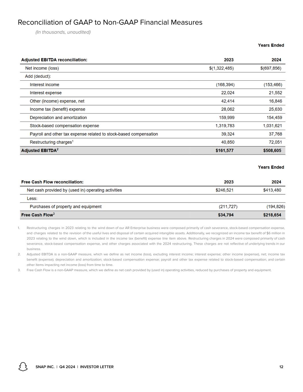Reconciliation of GAAP to Non-GAAP Financial Measures (In thousands, unaudited) 1. For the three months ended December 31, 2023, charges relating to the wind down of our AR Enterprise business were composed primarily of cash severance, stock-based compensation expense, and charges related to the revision of the useful lives and disposal of certain acquired intangible assets. Additionally, we recognized an income tax benefit of $6 million in the three months ended December 31, 2023 relating to the wind down, which is included in the income tax (benefit) expense line item above. For the three months ended March 31, 2024 and June 30, 2024, charges relating to the 2024 restructuring were composed primarily of cash severance and stock-based compensation expense. These charges are not reflective of underlying trends in our business. 2. Adjusted EBITDA is a non-GAAP measure, which we define as net income (loss), excluding interest income; interest expense; other income (expense), net; income tax benefit (expense); depreciation and amortization; stock-based compensation expense; payroll and other tax expense related to stock-based compensation; and certain other items impacting net income (loss) from time to time. 3. Free Cash Flow is a non-GAAP measure, which we define as net cash provided by (used in) operating activities, reduced by purchases of property and equipment. SNAP INC. | Q4 2024 | INVESTOR LETTER 11