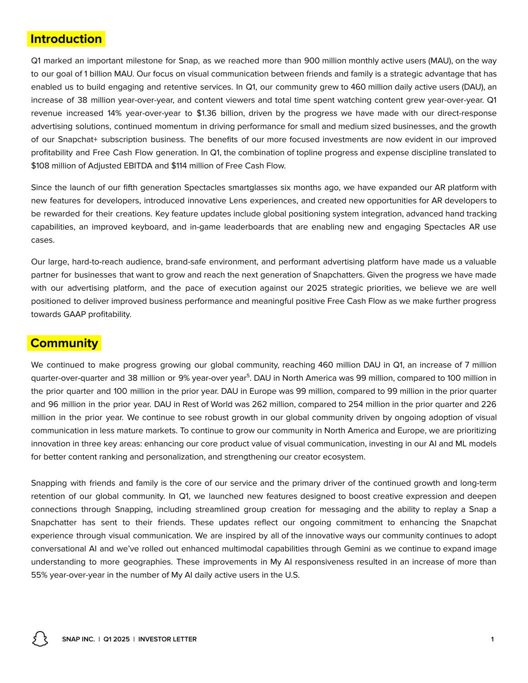 Introduction Q1 marked an important milestone for Snap, as we reached more than 900 million monthly active users (MAU), on the way to our goal of 1 billion MAU. Our focus on visual communication between friends and family is a strategic advantage that has enabled us to build engaging and retentive services. In Q1, our community grew to 460 million daily active users (DAU), an increase of 38 million year-over-year, and content viewers and total time spent watching content grew year-over-year. Q1 revenue increased 14% year-over-year to $1.36 billion, driven by the progress we have made with our direct-response advertising solutions, continued momentum in driving performance for small and medium sized businesses, and the growth of our Snapchat+ subscription business. The benefits of our more focused investments are now evident in our improved profitability and Free Cash Flow generation. In Q1, the combination of topline progress and expense discipline translated to $108 million of Adjusted EBITDA and $114 million of Free Cash Flow. Since the launch of our fifth generation Spectacles smartglasses six months ago, we have expanded our AR platform with new features for developers, introduced innovative Lens experiences, and created new opportunities for AR developers to be rewarded for their creations. Key feature updates include global positioning system integration, advanced hand tracking capabilities, an improved keyboard, and in-game leaderboards that are enabling new and engaging Spectacles AR use cases. Our large, hard-to-reach audience, brand-safe environment, and performant advertising platform have made us a valuable partner for businesses that want to grow and reach the next generation of Snapchatters. Given the progress we have made with our advertising platform, and the pace of execution against our 2025 strategic priorities, we believe we are well positioned to deliver improved business performance and meaningful positive Free Cash Flow as we make further progress towards GAAP profitability. Community We continued to make progress growing our global community, reaching 460 million DAU in Q1, an increase of 7 million quarter-over-quarter and 38 million or 9% year-over year 5 . DAU in North America was 99 million, compared to 100 million in the prior quarter and 100 million in the prior year. DAU in Europe was 99 million, compared to 99 million in the prior quarter and 96 million in the prior year. DAU in Rest of World was 262 million, compared to 254 million in the prior quarter and 226 million in the prior year. We continue to see robust growth in our global community driven by ongoing adoption of visual communication in less mature markets. To continue to grow our community in North America and Europe, we are prioritizing innovation in three key areas: enhancing our core product value of visual communication, investing in our AI and ML models for better content ranking and personalization, and strengthening our creator ecosystem. Snapping with friends and family is the core of our service and the primary driver of the continued growth and long-term retention of our global community. In Q1, we launched new features designed to boost creative expression and deepen connections through Snapping, including streamlined group creation for messaging and the ability to replay a Snap a Snapchatter has sent to their friends. These updates reflect our ongoing commitment to enhancing the Snapchat experience through visual communication. We are inspired by all of the innovative ways our community continues to adopt conversational AI and we’ve rolled out enhanced multimodal capabilities through Gemini as we continue to expand image understanding to more geographies. These improvements in My AI responsiveness resulted in an increase of more than 55% year-over-year in the number of My AI daily active users in the U.S. SNAP INC. | Q1 2025 | INVESTOR LETTER 1