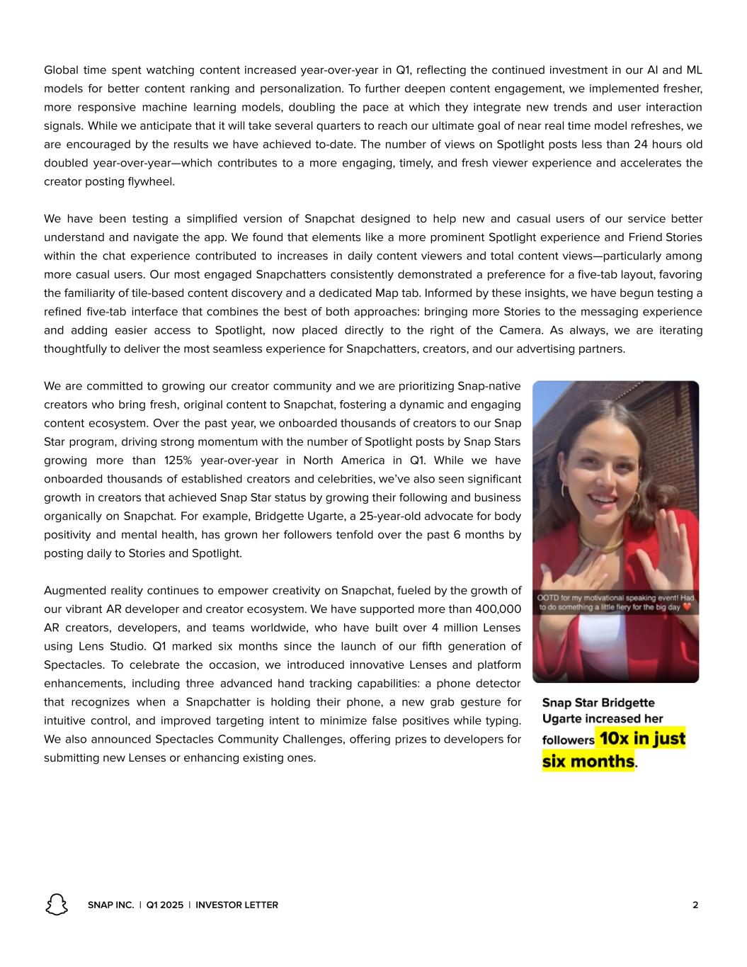 Global time spent watching content increased year-over-year in Q1, reflecting the continued investment in our AI and ML models for better content ranking and personalization. To further deepen content engagement, we implemented fresher, more responsive machine learning models, doubling the pace at which they integrate new trends and user interaction signals. While we anticipate that it will take several quarters to reach our ultimate goal of near real time model refreshes, we are encouraged by the results we have achieved to-date. The number of views on Spotlight posts less than 24 hours old doubled year-over-year—which contributes to a more engaging, timely, and fresh viewer experience and accelerates the creator posting flywheel. We have been testing a simplified version of Snapchat designed to help new and casual users of our service better understand and navigate the app. We found that elements like a more prominent Spotlight experience and Friend Stories within the chat experience contributed to increases in daily content viewers and total content views—particularly among more casual users. Our most engaged Snapchatters consistently demonstrated a preference for a five-tab layout, favoring the familiarity of tile-based content discovery and a dedicated Map tab. Informed by these insights, we have begun testing a refined five-tab interface that combines the best of both approaches: bringing more Stories to the messaging experience and adding easier access to Spotlight, now placed directly to the right of the Camera. As always, we are iterating thoughtfully to deliver the most seamless experience for Snapchatters, creators, and our advertising partners. We are committed to growing our creator community and we are prioritizing Snap-native creators who bring fresh, original content to Snapchat, fostering a dynamic and engaging content ecosystem. Over the past year, we onboarded thousands of creators to our Snap Star program, driving strong momentum with the number of Spotlight posts by Snap Stars growing more than 125% year-over-year in North America in Q1. While we have onboarded thousands of established creators and celebrities, we’ve also seen significant growth in creators that achieved Snap Star status by growing their following and business organically on Snapchat. For example, Bridgette Ugarte, a 25-year-old advocate for body positivity and mental health, has grown her followers tenfold over the past 6 months by posting daily to Stories and Spotlight. Augmented reality continues to empower creativity on Snapchat, fueled by the growth of our vibrant AR developer and creator ecosystem. We have supported more than 400,000 AR creators, developers, and teams worldwide, who have built over 4 million Lenses using Lens Studio. Q1 marked six months since the launch of our fifth generation of Spectacles. To celebrate the occasion, we introduced innovative Lenses and platform enhancements, including three advanced hand tracking capabilities: a phone detector that recognizes when a Snapchatter is holding their phone, a new grab gesture for intuitive control, and improved targeting intent to minimize false positives while typing. We also announced Spectacles Community Challenges, offering prizes to developers for submitting new Lenses or enhancing existing ones. SNAP INC. | Q1 2025 | INVESTOR LETTER 2