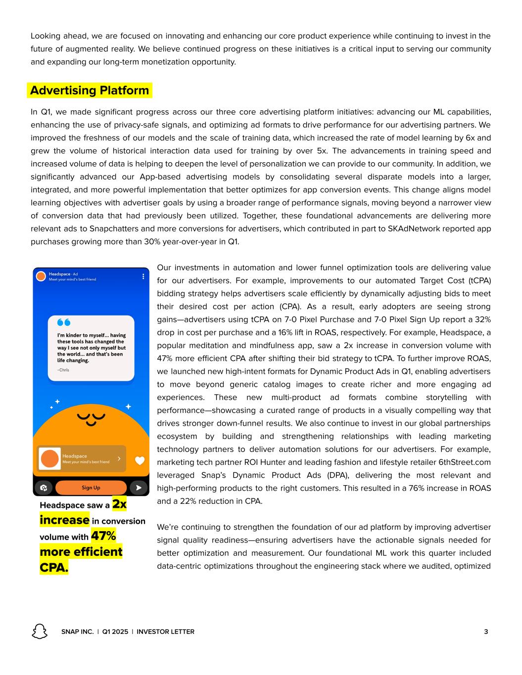 Looking ahead, we are focused on innovating and enhancing our core product experience while continuing to invest in the future of augmented reality. We believe continued progress on these initiatives is a critical input to serving our community and expanding our long-term monetization opportunity. Advertising Platform In Q1, we made significant progress across our three core advertising platform initiatives: advancing our ML capabilities, enhancing the use of privacy-safe signals, and optimizing ad formats to drive performance for our advertising partners. We improved the freshness of our models and the scale of training data, which increased the rate of model learning by 6x and grew the volume of historical interaction data used for training by over 5x. The advancements in training speed and increased volume of data is helping to deepen the level of personalization we can provide to our community. In addition, we significantly advanced our App-based advertising models by consolidating several disparate models into a larger, integrated, and more powerful implementation that better optimizes for app conversion events. This change aligns model learning objectives with advertiser goals by using a broader range of performance signals, moving beyond a narrower view of conversion data that had previously been utilized. Together, these foundational advancements are delivering more relevant ads to Snapchatters and more conversions for advertisers, which contributed in part to SKAdNetwork reported app purchases growing more than 30% year-over-year in Q1. Our investments in automation and lower funnel optimization tools are delivering value for our advertisers. For example, improvements to our automated Target Cost (tCPA) bidding strategy helps advertisers scale efficiently by dynamically adjusting bids to meet their desired cost per action (CPA). As a result, early adopters are seeing strong gains—advertisers using tCPA on 7-0 Pixel Purchase and 7-0 Pixel Sign Up report a 32% drop in cost per purchase and a 16% lift in ROAS, respectively. For example, Headspace, a popular meditation and mindfulness app, saw a 2x increase in conversion volume with 47% more efficient CPA after shifting their bid strategy to tCPA. To further improve ROAS, we launched new high-intent formats for Dynamic Product Ads in Q1, enabling advertisers to move beyond generic catalog images to create richer and more engaging ad experiences. These new multi-product ad formats combine storytelling with performance—showcasing a curated range of products in a visually compelling way that drives stronger down-funnel results. We also continue to invest in our global partnerships ecosystem by building and strengthening relationships with leading marketing technology partners to deliver automation solutions for our advertisers. For example, marketing tech partner ROI Hunter and leading fashion and lifestyle retailer 6thStreet.com leveraged Snap’s Dynamic Product Ads (DPA), delivering the most relevant and high-performing products to the right customers. This resulted in a 76% increase in ROAS and a 22% reduction in CPA. We’re continuing to strengthen the foundation of our ad platform by improving advertiser signal quality readiness—ensuring advertisers have the actionable signals needed for better optimization and measurement. Our foundational ML work this quarter included data-centric optimizations throughout the engineering stack where we audited, optimized SNAP INC. | Q1 2025 | INVESTOR LETTER 3