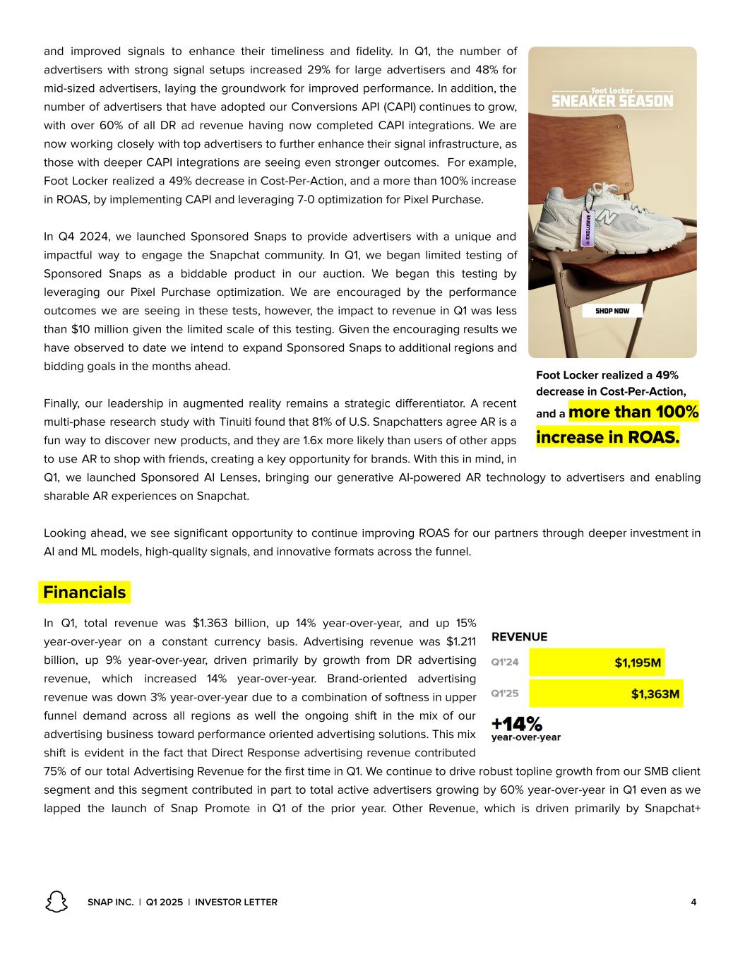 and improved signals to enhance their timeliness and fidelity. In Q1, the number of advertisers with strong signal setups increased 29% for large advertisers and 48% for mid-sized advertisers, laying the groundwork for improved performance. In addition, the number of advertisers that have adopted our Conversions API (CAPI) continues to grow, with over 60% of all DR ad revenue having now completed CAPI integrations. We are now working closely with top advertisers to further enhance their signal infrastructure, as those with deeper CAPI integrations are seeing even stronger outcomes. For example, Foot Locker realized a 49% decrease in Cost-Per-Action, and a more than 100% increase in ROAS, by implementing CAPI and leveraging 7-0 optimization for Pixel Purchase. In Q4 2024, we launched Sponsored Snaps to provide advertisers with a unique and impactful way to engage the Snapchat community. In Q1, we began limited testing of Sponsored Snaps as a biddable product in our auction. We began this testing by leveraging our Pixel Purchase optimization. We are encouraged by the performance outcomes we are seeing in these tests, however, the impact to revenue in Q1 was less than $10 million given the limited scale of this testing. Given the encouraging results we have observed to date we intend to expand Sponsored Snaps to additional regions and bidding goals in the months ahead. Finally, our leadership in augmented reality remains a strategic differentiator. A recent multi-phase research study with Tinuiti found that 81% of U.S. Snapchatters agree AR is a fun way to discover new products, and they are 1.6x more likely than users of other apps to use AR to shop with friends, creating a key opportunity for brands. With this in mind, in Q1, we launched Sponsored AI Lenses, bringing our generative AI-powered AR technology to advertisers and enabling sharable AR experiences on Snapchat. Looking ahead, we see significant opportunity to continue improving ROAS for our partners through deeper investment in AI and ML models, high-quality signals, and innovative formats across the funnel. Financials In Q1, total revenue was $1.363 billion, up 14% year-over-year, and up 15% year-over-year on a constant currency basis. Advertising revenue was $1.211 billion, up 9% year-over-year, driven primarily by growth from DR advertising revenue, which increased 14% year-over-year. Brand-oriented advertising revenue was down 3% year-over-year due to a combination of softness in upper funnel demand across all regions as well the ongoing shift in the mix of our advertising business toward performance oriented advertising solutions. This mix shift is evident in the fact that Direct Response advertising revenue contributed 75% of our total Advertising Revenue for the first time in Q1. We continue to drive robust topline growth from our SMB client segment and this segment contributed in part to total active advertisers growing by 60% year-over-year in Q1 even as we lapped the launch of Snap Promote in Q1 of the prior year. Other Revenue, which is driven primarily by Snapchat+ SNAP INC. | Q1 2025 | INVESTOR LETTER 4