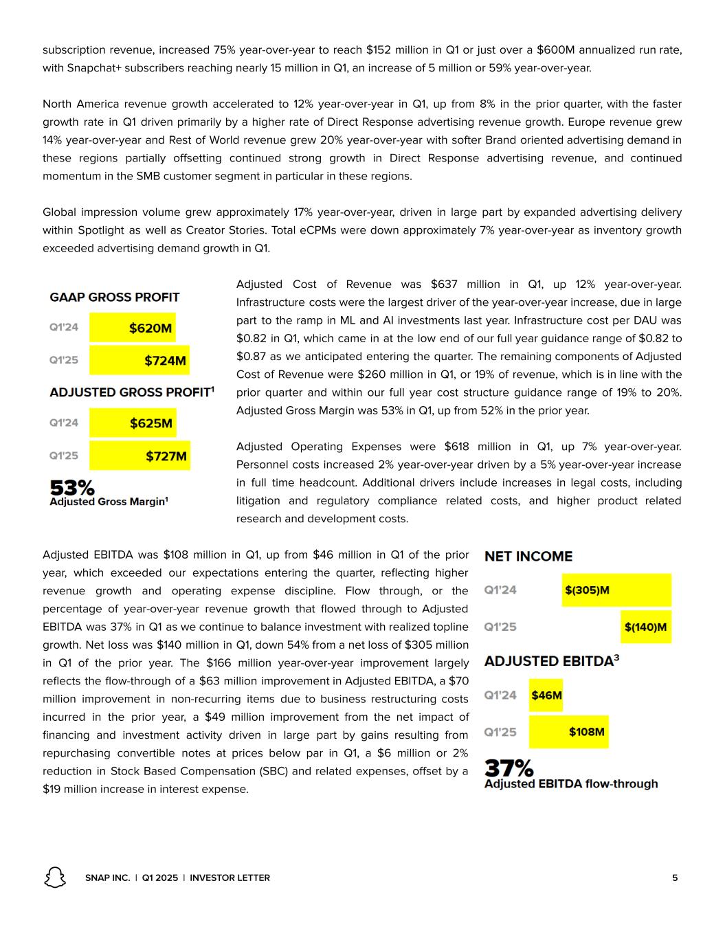 subscription revenue, increased 75% year-over-year to reach $152 million in Q1 or just over a $600M annualized run rate, with Snapchat+ subscribers reaching nearly 15 million in Q1, an increase of 5 million or 59% year-over-year. North America revenue growth accelerated to 12% year-over-year in Q1, up from 8% in the prior quarter, with the faster growth rate in Q1 driven primarily by a higher rate of Direct Response advertising revenue growth. Europe revenue grew 14% year-over-year and Rest of World revenue grew 20% year-over-year with softer Brand oriented advertising demand in these regions partially offsetting continued strong growth in Direct Response advertising revenue, and continued momentum in the SMB customer segment in particular in these regions. Global impression volume grew approximately 17% year-over-year, driven in large part by expanded advertising delivery within Spotlight as well as Creator Stories. Total eCPMs were down approximately 7% year-over-year as inventory growth exceeded advertising demand growth in Q1. Adjusted Cost of Revenue was $637 million in Q1, up 12% year-over-year. Infrastructure costs were the largest driver of the year-over-year increase, due in large part to the ramp in ML and AI investments last year. Infrastructure cost per DAU was $0.82 in Q1, which came in at the low end of our full year guidance range of $0.82 to $0.87 as we anticipated entering the quarter. The remaining components of Adjusted Cost of Revenue were $260 million in Q1, or 19% of revenue, which is in line with the prior quarter and within our full year cost structure guidance range of 19% to 20%. Adjusted Gross Margin was 53% in Q1, up from 52% in the prior year. Adjusted Operating Expenses were $618 million in Q1, up 7% year-over-year. Personnel costs increased 2% year-over-year driven by a 5% year-over-year increase in full time headcount. Additional drivers include increases in legal costs, including litigation and regulatory compliance related costs, and higher product related research and development costs. Adjusted EBITDA was $108 million in Q1, up from $46 million in Q1 of the prior year, which exceeded our expectations entering the quarter, reflecting higher revenue growth and operating expense discipline. Flow through, or the percentage of year-over-year revenue growth that flowed through to Adjusted EBITDA was 37% in Q1 as we continue to balance investment with realized topline growth. Net loss was $140 million in Q1, down 54% from a net loss of $305 million in Q1 of the prior year. The $166 million year-over-year improvement largely reflects the flow-through of a $63 million improvement in Adjusted EBITDA, a $70 million improvement in non-recurring items due to business restructuring costs incurred in the prior year, a $49 million improvement from the net impact of financing and investment activity driven in large part by gains resulting from repurchasing convertible notes at prices below par in Q1, a $6 million or 2% reduction in Stock Based Compensation (SBC) and related expenses, offset by a $19 million increase in interest expense. SNAP INC. | Q1 2025 | INVESTOR LETTER 5