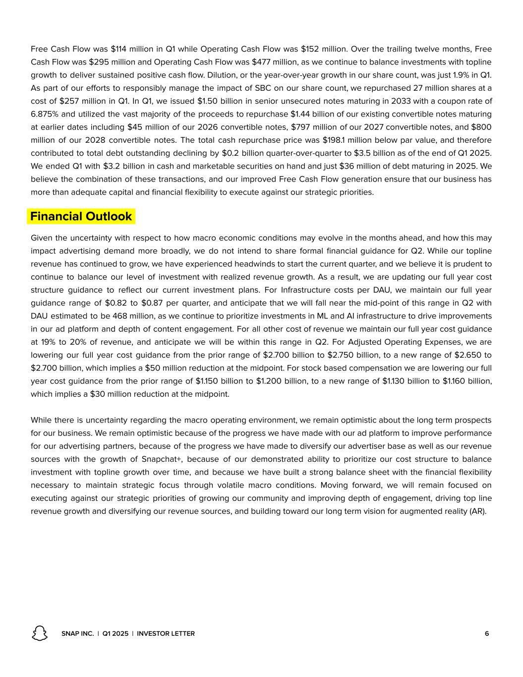 Free Cash Flow was $114 million in Q1 while Operating Cash Flow was $152 million. Over the trailing twelve months, Free Cash Flow was $295 million and Operating Cash Flow was $477 million, as we continue to balance investments with topline growth to deliver sustained positive cash flow. Dilution, or the year-over-year growth in our share count, was just 1.9% in Q1. As part of our efforts to responsibly manage the impact of SBC on our share count, we repurchased 27 million shares at a cost of $257 million in Q1. In Q1, we issued $1.50 billion in senior unsecured notes maturing in 2033 with a coupon rate of 6.875% and utilized the vast majority of the proceeds to repurchase $1.44 billion of our existing convertible notes maturing at earlier dates including $45 million of our 2026 convertible notes, $797 million of our 2027 convertible notes, and $800 million of our 2028 convertible notes. The total cash repurchase price was $198.1 million below par value, and therefore contributed to total debt outstanding declining by $0.2 billion quarter-over-quarter to $3.5 billion as of the end of Q1 2025. We ended Q1 with $3.2 billion in cash and marketable securities on hand and just $36 million of debt maturing in 2025. We believe the combination of these transactions, and our improved Free Cash Flow generation ensure that our business has more than adequate capital and financial flexibility to execute against our strategic priorities. Financial Outlook Given the uncertainty with respect to how macro economic conditions may evolve in the months ahead, and how this may impact advertising demand more broadly, we do not intend to share formal financial guidance for Q2. While our topline revenue has continued to grow, we have experienced headwinds to start the current quarter, and we believe it is prudent to continue to balance our level of investment with realized revenue growth. As a result, we are updating our full year cost structure guidance to reflect our current investment plans. For Infrastructure costs per DAU, we maintain our full year guidance range of $0.82 to $0.87 per quarter, and anticipate that we will fall near the mid-point of this range in Q2 with DAU estimated to be 468 million, as we continue to prioritize investments in ML and AI infrastructure to drive improvements in our ad platform and depth of content engagement. For all other cost of revenue we maintain our full year cost guidance at 19% to 20% of revenue, and anticipate we will be within this range in Q2. For Adjusted Operating Expenses, we are lowering our full year cost guidance from the prior range of $2.700 billion to $2.750 billion, to a new range of $2.650 to $2.700 billion, which implies a $50 million reduction at the midpoint. For stock based compensation we are lowering our full year cost guidance from the prior range of $1.150 billion to $1.200 billion, to a new range of $1.130 billion to $1.160 billion, which implies a $30 million reduction at the midpoint. While there is uncertainty regarding the macro operating environment, we remain optimistic about the long term prospects for our business. We remain optimistic because of the progress we have made with our ad platform to improve performance for our advertising partners, because of the progress we have made to diversify our advertiser base as well as our revenue sources with the growth of Snapchat+, because of our demonstrated ability to prioritize our cost structure to balance investment with topline growth over time, and because we have built a strong balance sheet with the financial flexibility necessary to maintain strategic focus through volatile macro conditions. Moving forward, we will remain focused on executing against our strategic priorities of growing our community and improving depth of engagement, driving top line revenue growth and diversifying our revenue sources, and building toward our long term vision for augmented reality (AR). SNAP INC. | Q1 2025 | INVESTOR LETTER 6