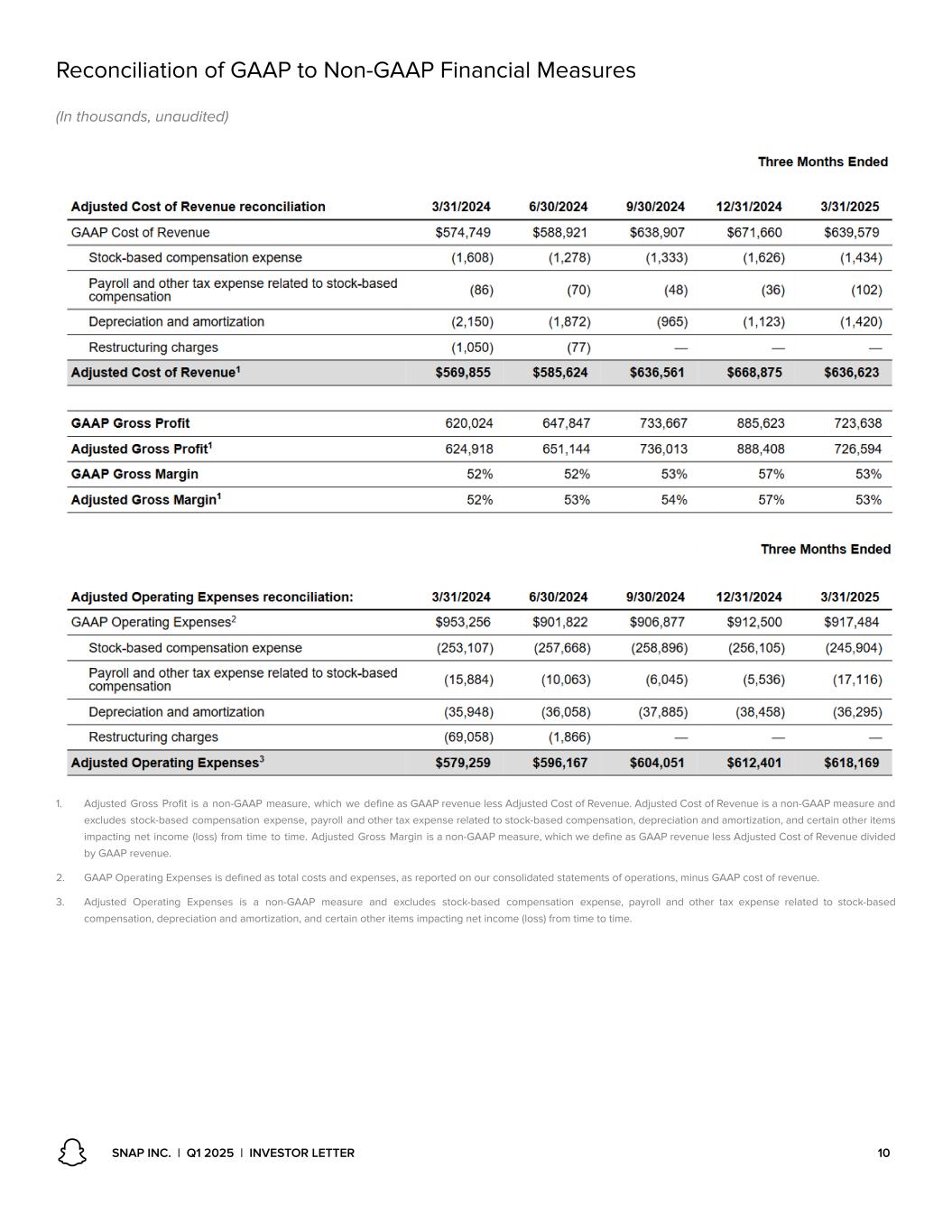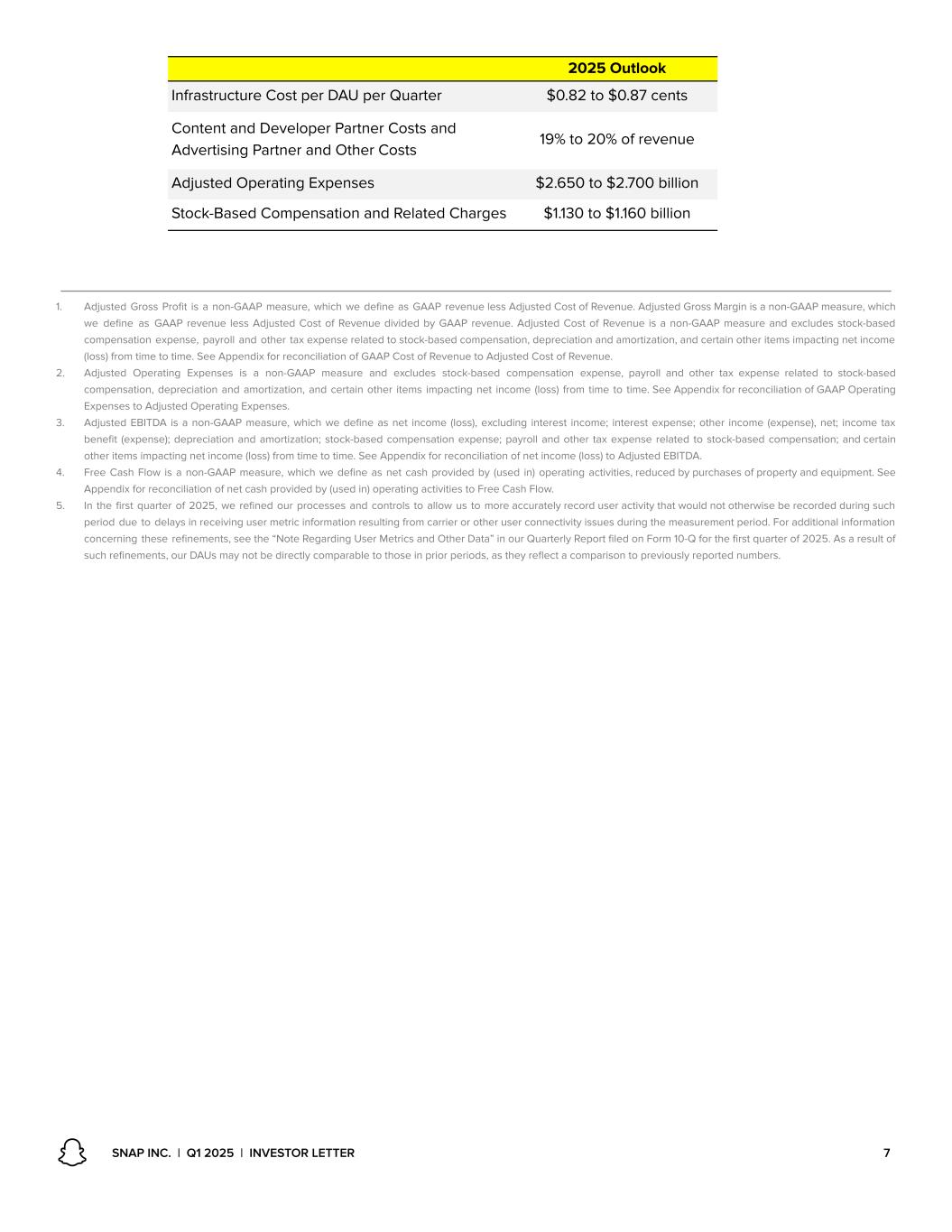 1. Adjusted Gross Profit is a non-GAAP measure, which we define as GAAP revenue less Adjusted Cost of Revenue. Adjusted Gross Margin is a non-GAAP measure, which we define as GAAP revenue less Adjusted Cost of Revenue divided by GAAP revenue. Adjusted Cost of Revenue is a non-GAAP measure and excludes stock-based compensation expense, payroll and other tax expense related to stock-based compensation, depreciation and amortization, and certain other items impacting net income (loss) from time to time. See Appendix for reconciliation of GAAP Cost of Revenue to Adjusted Cost of Revenue. 2. Adjusted Operating Expenses is a non-GAAP measure and excludes stock-based compensation expense, payroll and other tax expense related to stock-based compensation, depreciation and amortization, and certain other items impacting net income (loss) from time to time. See Appendix for reconciliation of GAAP Operating Expenses to Adjusted Operating Expenses. 3. Adjusted EBITDA is a non-GAAP measure, which we define as net income (loss), excluding interest income; interest expense; other income (expense), net; income tax benefit (expense); depreciation and amortization; stock-based compensation expense; payroll and other tax expense related to stock-based compensation; and certain other items impacting net income (loss) from time to time. See Appendix for reconciliation of net income (loss) to Adjusted EBITDA. 4. Free Cash Flow is a non-GAAP measure, which we define as net cash provided by (used in) operating activities, reduced by purchases of property and equipment. See Appendix for reconciliation of net cash provided by (used in) operating activities to Free Cash Flow. 5. In the first quarter of 2025, we refined our processes and controls to allow us to more accurately record user activity that would not otherwise be recorded during such period due to delays in receiving user metric information resulting from carrier or other user connectivity issues during the measurement period. For additional information concerning these refinements, see the “Note Regarding User Metrics and Other Data” in our Quarterly Report filed on Form 10-Q for the first quarter of 2025. As a result of such refinements, our DAUs may not be directly comparable to those in prior periods, as they reflect a comparison to previously reported numbers. SNAP INC. | Q1 2025 | INVESTOR LETTER 7 2025 Outlook Infrastructure Cost per DAU per Quarter $0.82 to $0.87 cents Content and Developer Partner Costs and Advertising Partner and Other Costs 19% to 20% of revenue Adjusted Operating Expenses $2.650 to $2.700 billion Stock-Based Compensation and Related Charges $1.130 to $1.160 billion