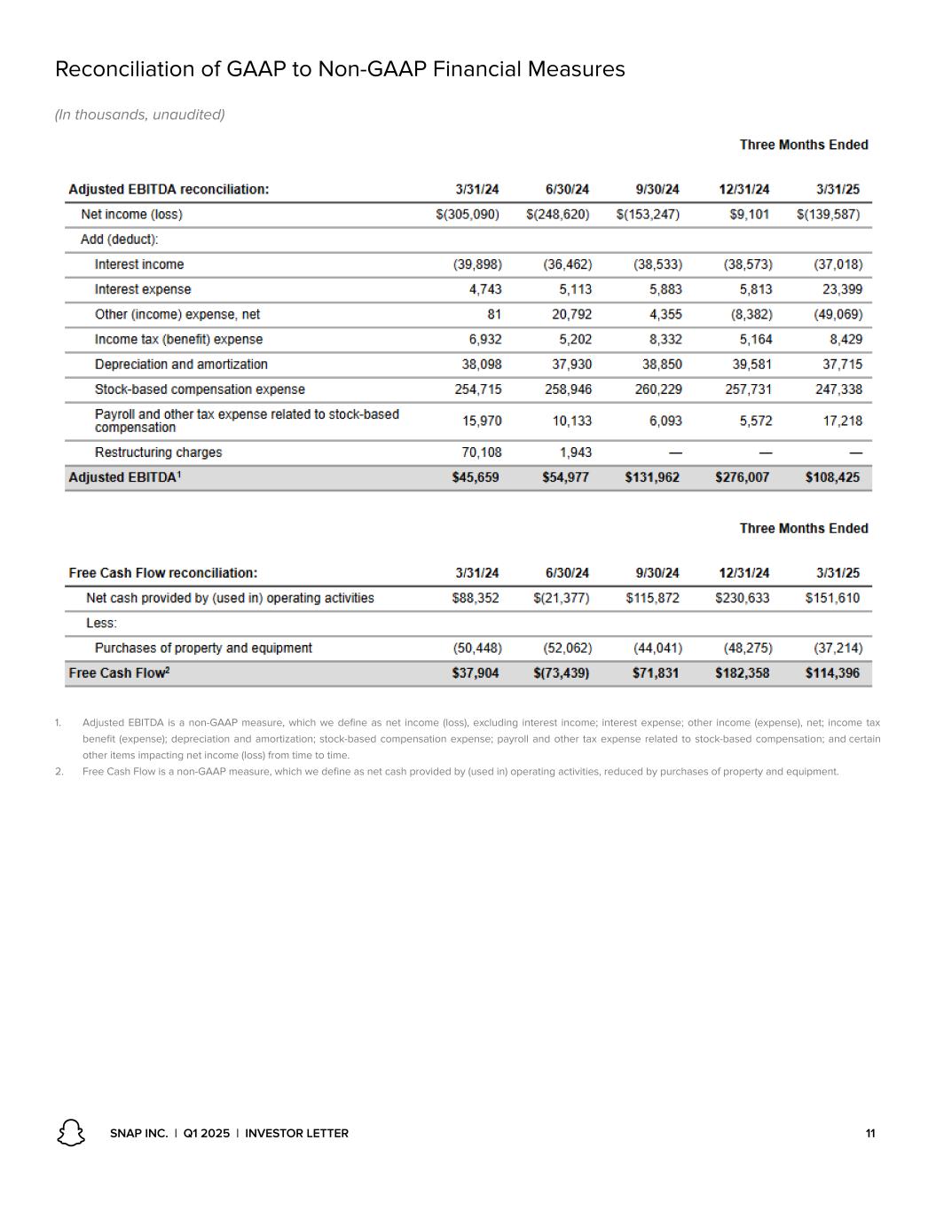 Reconciliation of GAAP to Non-GAAP Financial Measures (In thousands, unaudited) 1. Adjusted Gross Profit is a non-GAAP measure, which we define as GAAP revenue less Adjusted Cost of Revenue. Adjusted Cost of Revenue is a non-GAAP measure and excludes stock-based compensation expense, payroll and other tax expense related to stock-based compensation, depreciation and amortization, and certain other items impacting net income (loss) from time to time. Adjusted Gross Margin is a non-GAAP measure, which we define as GAAP revenue less Adjusted Cost of Revenue divided by GAAP revenue. 2. GAAP Operating Expenses is defined as total costs and expenses, as reported on our consolidated statements of operations, minus GAAP cost of revenue. 3. Adjusted Operating Expenses is a non-GAAP measure and excludes stock-based compensation expense, payroll and other tax expense related to stock-based compensation, depreciation and amortization, and certain other items impacting net income (loss) from time to time. SNAP INC. | Q1 2025 | INVESTOR LETTER 10