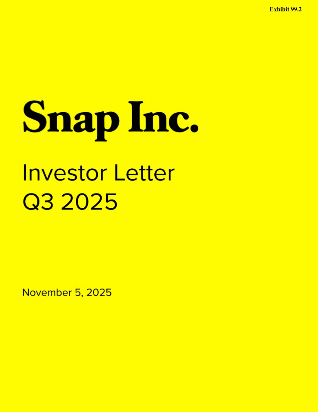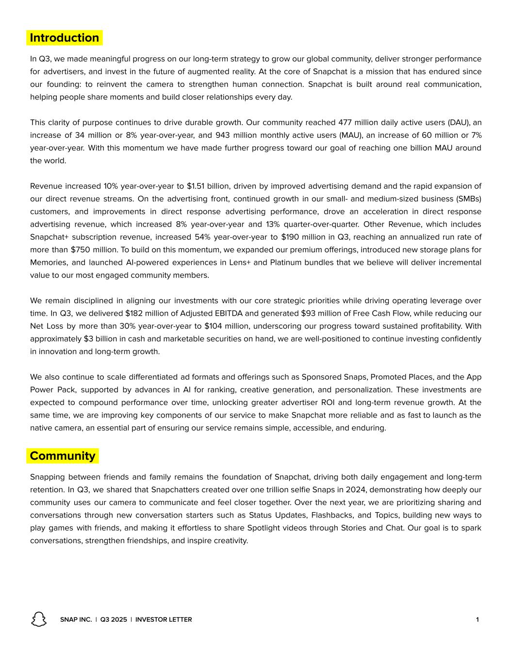 Introduction  In Q3, we made meaningful progress on our long-term strategy to grow our global community, deliver stronger performance for advertisers, and invest in the future of augmented reality. At the core of Snapchat is a mission that has endured since our founding: to reinvent the camera to strengthen human connection. Snapchat is built around real communication, helping people share moments and build closer relationships every day. This clarity of purpose continues to drive durable growth. Our community reached 477 million daily active users (DAU), an increase of 34 million or 8% year-over-year, and 943 million monthly active users (MAU), an increase of 60 million or 7% year-over-year. With this momentum we have made further progress toward our goal of reaching one billion MAU around the world. Revenue increased 10% year-over-year to $1.51 billion, driven by improved advertising demand and the rapid expansion of our direct revenue streams. On the advertising front, continued growth in our small- and medium-sized business (SMBs) customers, and improvements in direct response advertising performance, drove an acceleration in direct response advertising revenue, which increased 8% year-over-year and 13% quarter-over-quarter. Other Revenue, which includes Snapchat+ subscription revenue, increased 54% year-over-year to $190 million in Q3, reaching an annualized run rate of more than $750 million. To build on this momentum, we expanded our premium offerings, introduced new storage plans for Memories, and launched AI-powered experiences in Lens+ and Platinum bundles that we believe will deliver incremental value to our most engaged community members. We remain disciplined in aligning our investments with our core strategic priorities while driving operating leverage over time. In Q3, we delivered $182 million of Adjusted EBITDA and generated $93 million of Free Cash Flow, while reducing our Net Loss by more than 30% year-over-year to $104 million, underscoring our progress toward sustained profitability. With approximately $3 billion in cash and marketable securities on hand, we are well-positioned to continue investing confidently in innovation and long-term growth. We also continue to scale differentiated ad formats and offerings such as Sponsored Snaps, Promoted Places, and the App Power Pack, supported by advances in AI for ranking, creative generation, and personalization. These investments are expected to compound performance over time, unlocking greater advertiser ROI and long-term revenue growth. At the same time, we are improving key components of our service to make Snapchat more reliable and as fast to launch as the native camera, an essential part of ensuring our service remains simple, accessible, and enduring.  Community  Snapping between friends and family remains the foundation of Snapchat, driving both daily engagement and long-term retention. In Q3, we shared that Snapchatters created over one trillion selfie Snaps in 2024, demonstrating how deeply our community uses our camera to communicate and feel closer together. Over the next year, we are prioritizing sharing and conversations through new conversation starters such as Status Updates, Flashbacks, and Topics, building new ways to play games with friends, and making it effortless to share Spotlight videos through Stories and Chat. Our goal is to spark conversations, strengthen friendships, and inspire creativity. SNAP INC. | Q3 2025 | INVESTOR LETTER 1
