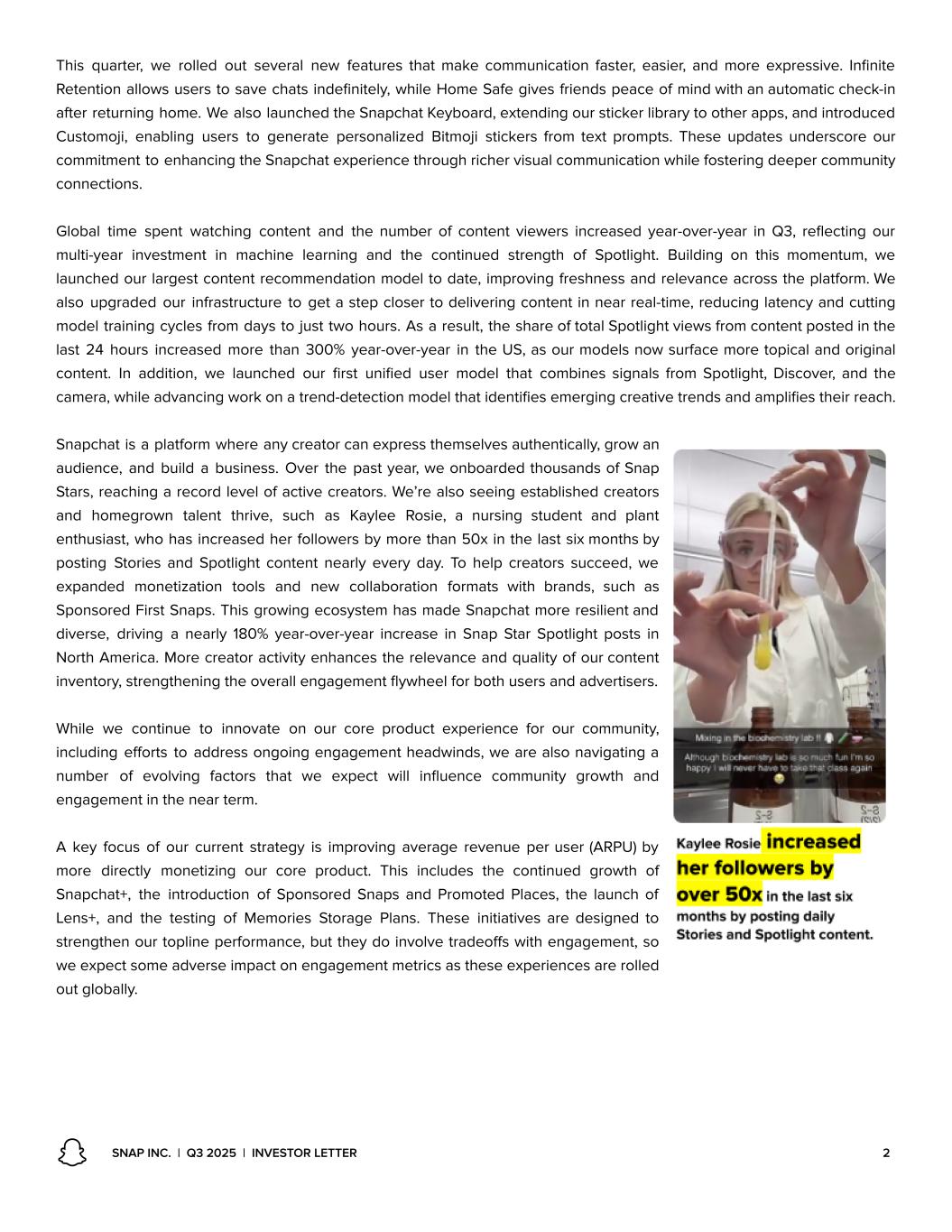 This quarter, we rolled out several new features that make communication faster, easier, and more expressive. Infinite Retention allows users to save chats indefinitely, while Home Safe gives friends peace of mind with an automatic check-in after returning home. We also launched the Snapchat Keyboard, extending our sticker library to other apps, and introduced Customoji, enabling users to generate personalized Bitmoji stickers from text prompts. These updates underscore our commitment to enhancing the Snapchat experience through richer visual communication while fostering deeper community connections. Global time spent watching content and the number of content viewers increased year-over-year in Q3, reflecting our multi-year investment in machine learning and the continued strength of Spotlight. Building on this momentum, we launched our largest content recommendation model to date, improving freshness and relevance across the platform. We also upgraded our infrastructure to get a step closer to delivering content in near real-time, reducing latency and cutting model training cycles from days to just two hours. As a result, the share of total Spotlight views from content posted in the last 24 hours increased more than 300% year-over-year in the US, as our models now surface more topical and original content. In addition, we launched our first unified user model that combines signals from Spotlight, Discover, and the camera, while advancing work on a trend-detection model that identifies emerging creative trends and amplifies their reach. Snapchat is a platform where any creator can express themselves authentically, grow an audience, and build a business. Over the past year, we onboarded thousands of Snap Stars, reaching a record level of active creators. We’re also seeing established creators and homegrown talent thrive, such as Kaylee Rosie, a nursing student and plant enthusiast, who has increased her followers by more than 50x in the last six months by posting Stories and Spotlight content nearly every day. To help creators succeed, we expanded monetization tools and new collaboration formats with brands, such as Sponsored First Snaps. This growing ecosystem has made Snapchat more resilient and diverse, driving a nearly 180% year-over-year increase in Snap Star Spotlight posts in North America. More creator activity enhances the relevance and quality of our content inventory, strengthening the overall engagement flywheel for both users and advertisers. While we continue to innovate on our core product experience for our community, including efforts to address ongoing engagement headwinds, we are also navigating a number of evolving factors that we expect will influence community growth and engagement in the near term. A key focus of our current strategy is improving average revenue per user (ARPU) by more directly monetizing our core product. This includes the continued growth of Snapchat+, the introduction of Sponsored Snaps and Promoted Places, the launch of Lens+, and the testing of Memories Storage Plans. These initiatives are designed to strengthen our topline performance, but they do involve tradeoffs with engagement, so we expect some adverse impact on engagement metrics as these experiences are rolled out globally. SNAP INC. | Q3 2025 | INVESTOR LETTER 2