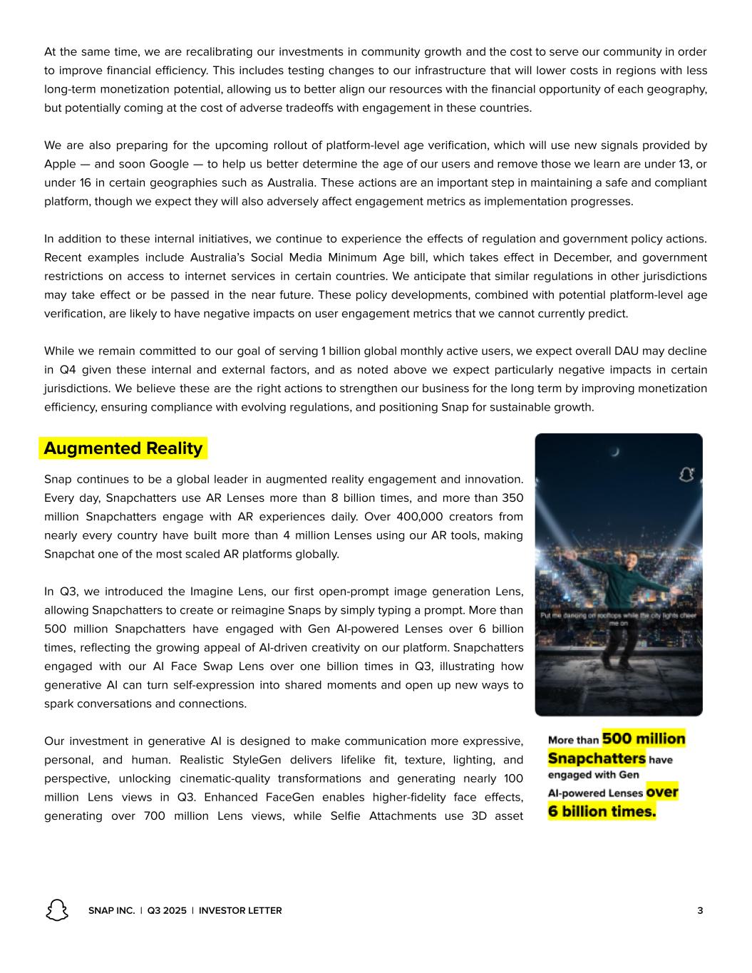 At the same time, we are recalibrating our investments in community growth and the cost to serve our community in order to improve financial efficiency. This includes testing changes to our infrastructure that will lower costs in regions with less long-term monetization potential, allowing us to better align our resources with the financial opportunity of each geography, but potentially coming at the cost of adverse tradeoffs with engagement in these countries. We are also preparing for the upcoming rollout of platform-level age verification, which will use new signals provided by Apple — and soon Google — to help us better determine the age of our users and remove those we learn are under 13, or under 16 in certain geographies such as Australia. These actions are an important step in maintaining a safe and compliant platform, though we expect they will also adversely affect engagement metrics as implementation progresses. In addition to these internal initiatives, we continue to experience the effects of regulation and government policy actions. Recent examples include Australia’s Social Media Minimum Age bill, which takes effect in December, and government restrictions on access to internet services in certain countries. We anticipate that similar regulations in other jurisdictions may take effect or be passed in the near future. These policy developments, combined with potential platform-level age verification, are likely to have negative impacts on user engagement metrics that we cannot currently predict. While we remain committed to our goal of serving 1 billion global monthly active users, we expect overall DAU may decline in Q4 given these internal and external factors, and as noted above we expect particularly negative impacts in certain jurisdictions. We believe these are the right actions to strengthen our business for the long term by improving monetization efficiency, ensuring compliance with evolving regulations, and positioning Snap for sustainable growth.  Augmented Reality  Snap continues to be a global leader in augmented reality engagement and innovation. Every day, Snapchatters use AR Lenses more than 8 billion times, and more than 350 million Snapchatters engage with AR experiences daily. Over 400,000 creators from nearly every country have built more than 4 million Lenses using our AR tools, making Snapchat one of the most scaled AR platforms globally. In Q3, we introduced the Imagine Lens, our first open-prompt image generation Lens, allowing Snapchatters to create or reimagine Snaps by simply typing a prompt. More than 500 million Snapchatters have engaged with Gen AI-powered Lenses over 6 billion times, reflecting the growing appeal of AI-driven creativity on our platform. Snapchatters engaged with our AI Face Swap Lens over one billion times in Q3, illustrating how generative AI can turn self-expression into shared moments and open up new ways to spark conversations and connections. Our investment in generative AI is designed to make communication more expressive, personal, and human. Realistic StyleGen delivers lifelike fit, texture, lighting, and perspective, unlocking cinematic-quality transformations and generating nearly 100 million Lens views in Q3. Enhanced FaceGen enables higher-fidelity face effects, generating over 700 million Lens views, while Selfie Attachments use 3D asset SNAP INC. | Q3 2025 | INVESTOR LETTER 3