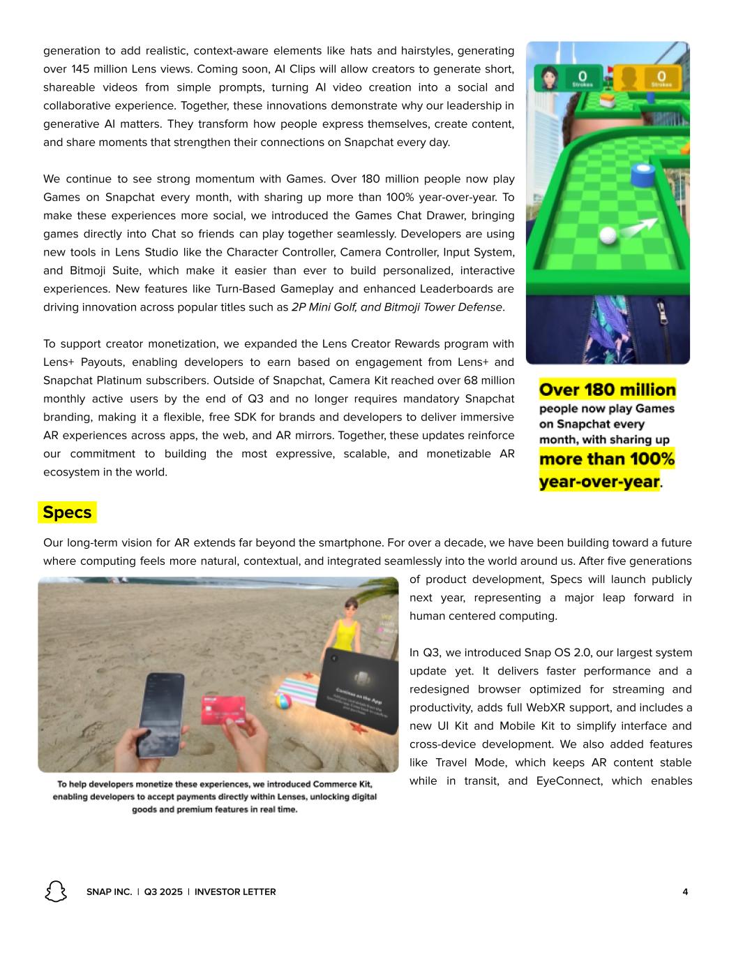generation to add realistic, context-aware elements like hats and hairstyles, generating over 145 million Lens views. Coming soon, AI Clips will allow creators to generate short, shareable videos from simple prompts, turning AI video creation into a social and collaborative experience. Together, these innovations demonstrate why our leadership in generative AI matters. They transform how people express themselves, create content, and share moments that strengthen their connections on Snapchat every day. We continue to see strong momentum with Games. Over 180 million people now play Games on Snapchat every month, with sharing up more than 100% year-over-year. To make these experiences more social, we introduced the Games Chat Drawer, bringing games directly into Chat so friends can play together seamlessly. Developers are using new tools in Lens Studio like the Character Controller, Camera Controller, Input System, and Bitmoji Suite, which make it easier than ever to build personalized, interactive experiences. New features like Turn-Based Gameplay and enhanced Leaderboards are driving innovation across popular titles such as 2P Mini Golf, and Bitmoji Tower Defense. To support creator monetization, we expanded the Lens Creator Rewards program with Lens+ Payouts, enabling developers to earn based on engagement from Lens+ and Snapchat Platinum subscribers. Outside of Snapchat, Camera Kit reached over 68 million monthly active users by the end of Q3 and no longer requires mandatory Snapchat branding, making it a flexible, free SDK for brands and developers to deliver immersive AR experiences across apps, the web, and AR mirrors. Together, these updates reinforce our commitment to building the most expressive, scalable, and monetizable AR ecosystem in the world.  Specs  Our long-term vision for AR extends far beyond the smartphone. For over a decade, we have been building toward a future where computing feels more natural, contextual, and integrated seamlessly into the world around us. After five generations of product development, Specs will launch publicly next year, representing a major leap forward in human centered computing. In Q3, we introduced Snap OS 2.0, our largest system update yet. It delivers faster performance and a redesigned browser optimized for streaming and productivity, adds full WebXR support, and includes a new UI Kit and Mobile Kit to simplify interface and cross-device development. We also added features like Travel Mode, which keeps AR content stable while in transit, and EyeConnect, which enables SNAP INC. | Q3 2025 | INVESTOR LETTER 4