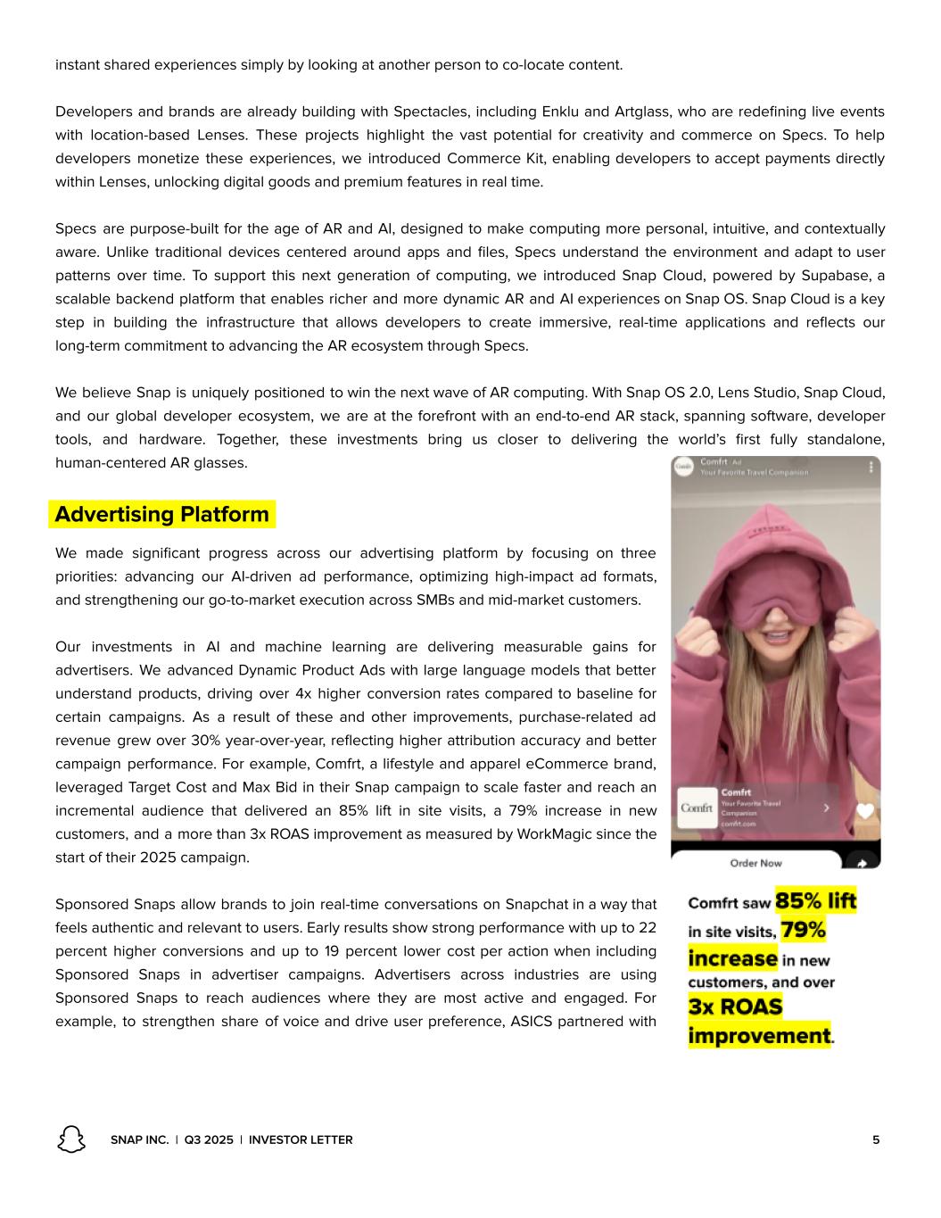 instant shared experiences simply by looking at another person to co-locate content. Developers and brands are already building with Spectacles, including Enklu and Artglass, who are redefining live events with location-based Lenses. These projects highlight the vast potential for creativity and commerce on Specs. To help developers monetize these experiences, we introduced Commerce Kit, enabling developers to accept payments directly within Lenses, unlocking digital goods and premium features in real time. Specs are purpose-built for the age of AR and AI, designed to make computing more personal, intuitive, and contextually aware. Unlike traditional devices centered around apps and files, Specs understand the environment and adapt to user patterns over time. To support this next generation of computing, we introduced Snap Cloud, powered by Supabase, a scalable backend platform that enables richer and more dynamic AR and AI experiences on Snap OS. Snap Cloud is a key step in building the infrastructure that allows developers to create immersive, real-time applications and reflects our long-term commitment to advancing the AR ecosystem through Specs. We believe Snap is uniquely positioned to win the next wave of AR computing. With Snap OS 2.0, Lens Studio, Snap Cloud, and our global developer ecosystem, we are at the forefront with an end-to-end AR stack, spanning software, developer tools, and hardware. Together, these investments bring us closer to delivering the world’s first fully standalone, human-centered AR glasses.  Advertising Platform  We made significant progress across our advertising platform by focusing on three priorities: advancing our AI-driven ad performance, optimizing high-impact ad formats, and strengthening our go-to-market execution across SMBs and mid-market customers. Our investments in AI and machine learning are delivering measurable gains for advertisers. We advanced Dynamic Product Ads with large language models that better understand products, driving over 4x higher conversion rates compared to baseline for certain campaigns. As a result of these and other improvements, purchase-related ad revenue grew over 30% year-over-year, reflecting higher attribution accuracy and better campaign performance. For example, Comfrt, a lifestyle and apparel eCommerce brand, leveraged Target Cost and Max Bid in their Snap campaign to scale faster and reach an incremental audience that delivered an 85% lift in site visits, a 79% increase in new customers, and a more than 3x ROAS improvement as measured by WorkMagic since the start of their 2025 campaign. Sponsored Snaps allow brands to join real-time conversations on Snapchat in a way that feels authentic and relevant to users. Early results show strong performance with up to 22 percent higher conversions and up to 19 percent lower cost per action when including Sponsored Snaps in advertiser campaigns. Advertisers across industries are using Sponsored Snaps to reach audiences where they are most active and engaged. For example, to strengthen share of voice and drive user preference, ASICS partnered with SNAP INC. | Q3 2025 | INVESTOR LETTER 5