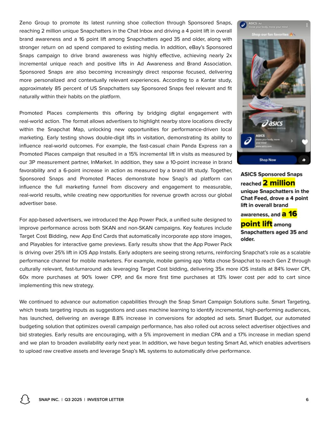 Zeno Group to promote its latest running shoe collection through Sponsored Snaps, reaching 2 million unique Snapchatters in the Chat Inbox and driving a 4 point lift in overall brand awareness and a 16 point lift among Snapchatters aged 35 and older, along with stronger return on ad spend compared to existing media. In addition, eBay’s Sponsored Snaps campaign to drive brand awareness was highly effective, achieving nearly 2x incremental unique reach and positive lifts in Ad Awareness and Brand Association. Sponsored Snaps are also becoming increasingly direct response focused, delivering more personalized and contextually relevant experiences. According to a Kantar study, approximately 85 percent of US Snapchatters say Sponsored Snaps feel relevant and fit naturally within their habits on the platform. Promoted Places complements this offering by bridging digital engagement with real-world action. The format allows advertisers to highlight nearby store locations directly within the Snapchat Map, unlocking new opportunities for performance-driven local marketing. Early testing shows double-digit lifts in visitation, demonstrating its ability to influence real-world outcomes. For example, the fast-casual chain Panda Express ran a Promoted Places campaign that resulted in a 15% incremental lift in visits as measured by our 3P measurement partner, InMarket. In addition, they saw a 10-point increase in brand favorability and a 6-point increase in action as measured by a brand lift study. Together, Sponsored Snaps and Promoted Places demonstrate how Snap’s ad platform can influence the full marketing funnel from discovery and engagement to measurable, real-world results, while creating new opportunities for revenue growth across our global advertiser base. For app-based advertisers, we introduced the App Power Pack, a unified suite designed to improve performance across both SKAN and non-SKAN campaigns. Key features include Target Cost Bidding, new App End Cards that automatically incorporate app store images, and Playables for interactive game previews. Early results show that the App Power Pack is driving over 25% lift in iOS App Installs. Early adopters are seeing strong returns, reinforcing Snapchat’s role as a scalable performance channel for mobile marketers. For example, mobile gaming app Yotta chose Snapchat to reach Gen Z through culturally relevant, fast-turnaround ads leveraging Target Cost bidding, delivering 35x more iOS installs at 84% lower CPI, 60x more purchases at 90% lower CPP, and 6x more first time purchases at 13% lower cost per add to cart since implementing this new strategy. We continued to advance our automation capabilities through the Snap Smart Campaign Solutions suite. Smart Targeting, which treats targeting inputs as suggestions and uses machine learning to identify incremental, high-performing audiences, has launched, delivering an average 8.8% increase in conversions for adopted ad sets. Smart Budget, our automated budgeting solution that optimizes overall campaign performance, has also rolled out across select advertiser objectives and bid strategies. Early results are encouraging, with a 5% improvement in median CPA and a 17% increase in median spend and we plan to broaden availability early next year. In addition, we have begun testing Smart Ad, which enables advertisers to upload raw creative assets and leverage Snap’s ML systems to automatically drive performance. SNAP INC. | Q3 2025 | INVESTOR LETTER 6
