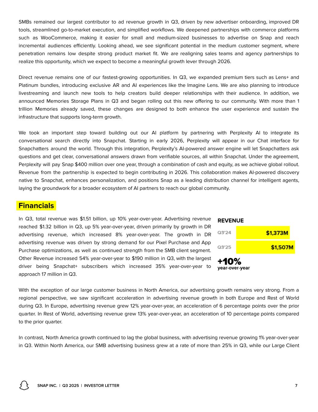 SMBs remained our largest contributor to ad revenue growth in Q3, driven by new advertiser onboarding, improved DR tools, streamlined go-to-market execution, and simplified workflows. We deepened partnerships with commerce platforms such as WooCommerce, making it easier for small and medium-sized businesses to advertise on Snap and reach incremental audiences efficiently. Looking ahead, we see significant potential in the medium customer segment, where penetration remains low despite strong product market fit. We are realigning sales teams and agency partnerships to realize this opportunity, which we expect to become a meaningful growth lever through 2026. Direct revenue remains one of our fastest-growing opportunities. In Q3, we expanded premium tiers such as Lens+ and Platinum bundles, introducing exclusive AR and AI experiences like the Imagine Lens. We are also planning to introduce livestreaming and launch new tools to help creators build deeper relationships with their audience. In addition, we announced Memories Storage Plans in Q3 and began rolling out this new offering to our community. With more than 1 trillion Memories already saved, these changes are designed to both enhance the user experience and sustain the infrastructure that supports long-term growth. We took an important step toward building out our AI platform by partnering with Perplexity AI to integrate its conversational search directly into Snapchat. Starting in early 2026, Perplexity will appear in our Chat interface for Snapchatters around the world. Through this integration, Perplexity’s AI-powered answer engine will let Snapchatters ask questions and get clear, conversational answers drawn from verifiable sources, all within Snapchat. Under the agreement, Perplexity will pay Snap $400 million over one year, through a combination of cash and equity, as we achieve global rollout. Revenue from the partnership is expected to begin contributing in 2026. This collaboration makes AI-powered discovery native to Snapchat, enhances personalization, and positions Snap as a leading distribution channel for intelligent agents, laying the groundwork for a broader ecosystem of AI partners to reach our global community.  Financials  In Q3, total revenue was $1.51 billion, up 10% year-over-year. Advertising revenue reached $1.32 billion in Q3, up 5% year-over-year, driven primarily by growth in DR advertising revenue, which increased 8% year-over-year. The growth in DR advertising revenue was driven by strong demand for our Pixel Purchase and App Purchase optimizations, as well as continued strength from the SMB client segment. Other Revenue increased 54% year-over-year to $190 million in Q3, with the largest driver being Snapchat+ subscribers which increased 35% year-over-year to approach 17 million in Q3. With the exception of our large customer business in North America, our advertising growth remains very strong. From a regional perspective, we saw significant acceleration in advertising revenue growth in both Europe and Rest of World during Q3. In Europe, advertising revenue grew 12% year-over-year, an acceleration of 6 percentage points over the prior quarter. In Rest of World, advertising revenue grew 13% year-over-year, an acceleration of 10 percentage points compared to the prior quarter. In contrast, North America growth continued to lag the global business, with advertising revenue growing 1% year-over-year in Q3. Within North America, our SMB advertising business grew at a rate of more than 25% in Q3, while our Large Client SNAP INC. | Q3 2025 | INVESTOR LETTER 7