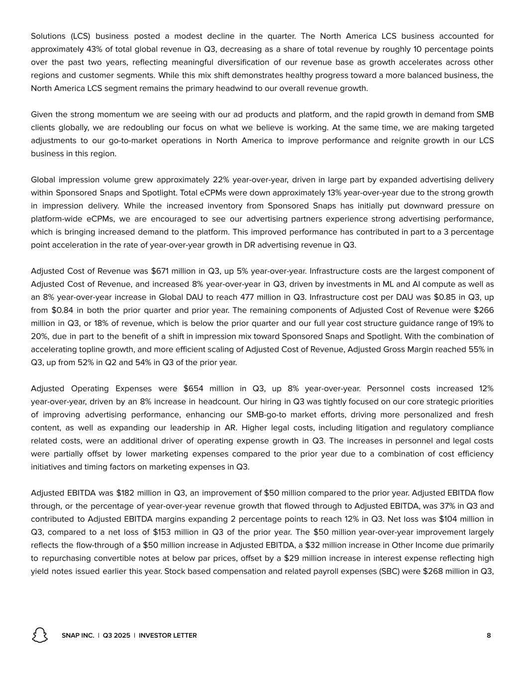 Solutions (LCS) business posted a modest decline in the quarter. The North America LCS business accounted for approximately 43% of total global revenue in Q3, decreasing as a share of total revenue by roughly 10 percentage points over the past two years, reflecting meaningful diversification of our revenue base as growth accelerates across other regions and customer segments. While this mix shift demonstrates healthy progress toward a more balanced business, the North America LCS segment remains the primary headwind to our overall revenue growth. Given the strong momentum we are seeing with our ad products and platform, and the rapid growth in demand from SMB clients globally, we are redoubling our focus on what we believe is working. At the same time, we are making targeted adjustments to our go-to-market operations in North America to improve performance and reignite growth in our LCS business in this region. Global impression volume grew approximately 22% year-over-year, driven in large part by expanded advertising delivery within Sponsored Snaps and Spotlight. Total eCPMs were down approximately 13% year-over-year due to the strong growth in impression delivery. While the increased inventory from Sponsored Snaps has initially put downward pressure on platform-wide eCPMs, we are encouraged to see our advertising partners experience strong advertising performance, which is bringing increased demand to the platform. This improved performance has contributed in part to a 3 percentage point acceleration in the rate of year-over-year growth in DR advertising revenue in Q3. Adjusted Cost of Revenue was $671 million in Q3, up 5% year-over-year. Infrastructure costs are the largest component of Adjusted Cost of Revenue, and increased 8% year-over-year in Q3, driven by investments in ML and AI compute as well as an 8% year-over-year increase in Global DAU to reach 477 million in Q3. Infrastructure cost per DAU was $0.85 in Q3, up from $0.84 in both the prior quarter and prior year. The remaining components of Adjusted Cost of Revenue were $266 million in Q3, or 18% of revenue, which is below the prior quarter and our full year cost structure guidance range of 19% to 20%, due in part to the benefit of a shift in impression mix toward Sponsored Snaps and Spotlight. With the combination of accelerating topline growth, and more efficient scaling of Adjusted Cost of Revenue, Adjusted Gross Margin reached 55% in Q3, up from 52% in Q2 and 54% in Q3 of the prior year. Adjusted Operating Expenses were $654 million in Q3, up 8% year-over-year. Personnel costs increased 12% year-over-year, driven by an 8% increase in headcount. Our hiring in Q3 was tightly focused on our core strategic priorities of improving advertising performance, enhancing our SMB-go-to market efforts, driving more personalized and fresh content, as well as expanding our leadership in AR. Higher legal costs, including litigation and regulatory compliance related costs, were an additional driver of operating expense growth in Q3. The increases in personnel and legal costs were partially offset by lower marketing expenses compared to the prior year due to a combination of cost efficiency initiatives and timing factors on marketing expenses in Q3. Adjusted EBITDA was $182 million in Q3, an improvement of $50 million compared to the prior year. Adjusted EBITDA flow through, or the percentage of year-over-year revenue growth that flowed through to Adjusted EBITDA, was 37% in Q3 and contributed to Adjusted EBITDA margins expanding 2 percentage points to reach 12% in Q3. Net loss was $104 million in Q3, compared to a net loss of $153 million in Q3 of the prior year. The $50 million year-over-year improvement largely reflects the flow-through of a $50 million increase in Adjusted EBITDA, a $32 million increase in Other Income due primarily to repurchasing convertible notes at below par prices, offset by a $29 million increase in interest expense reflecting high yield notes issued earlier this year. Stock based compensation and related payroll expenses (SBC) were $268 million in Q3, SNAP INC. | Q3 2025 | INVESTOR LETTER 8