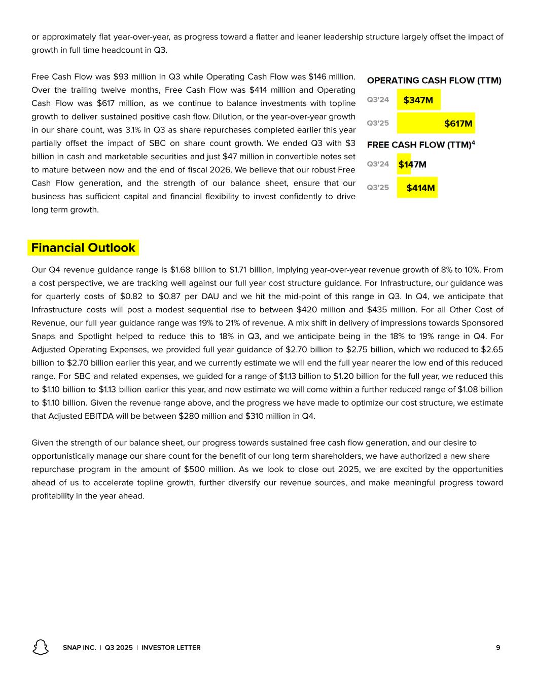 or approximately flat year-over-year, as progress toward a flatter and leaner leadership structure largely offset the impact of growth in full time headcount in Q3. Free Cash Flow was $93 million in Q3 while Operating Cash Flow was $146 million. Over the trailing twelve months, Free Cash Flow was $414 million and Operating Cash Flow was $617 million, as we continue to balance investments with topline growth to deliver sustained positive cash flow. Dilution, or the year-over-year growth in our share count, was 3.1% in Q3 as share repurchases completed earlier this year partially offset the impact of SBC on share count growth. We ended Q3 with $3 billion in cash and marketable securities and just $47 million in convertible notes set to mature between now and the end of fiscal 2026. We believe that our robust Free Cash Flow generation, and the strength of our balance sheet, ensure that our business has sufficient capital and financial flexibility to invest confidently to drive long term growth.  Financial Outlook  Our Q4 revenue guidance range is $1.68 billion to $1.71 billion, implying year-over-year revenue growth of 8% to 10%. From a cost perspective, we are tracking well against our full year cost structure guidance. For Infrastructure, our guidance was for quarterly costs of $0.82 to $0.87 per DAU and we hit the mid-point of this range in Q3. In Q4, we anticipate that Infrastructure costs will post a modest sequential rise to between $420 million and $435 million. For all Other Cost of Revenue, our full year guidance range was 19% to 21% of revenue. A mix shift in delivery of impressions towards Sponsored Snaps and Spotlight helped to reduce this to 18% in Q3, and we anticipate being in the 18% to 19% range in Q4. For Adjusted Operating Expenses, we provided full year guidance of $2.70 billion to $2.75 billion, which we reduced to $2.65 billion to $2.70 billion earlier this year, and we currently estimate we will end the full year nearer the low end of this reduced range. For SBC and related expenses, we guided for a range of $1.13 billion to $1.20 billion for the full year, we reduced this to $1.10 billion to $1.13 billion earlier this year, and now estimate we will come within a further reduced range of $1.08 billion to $1.10 billion. Given the revenue range above, and the progress we have made to optimize our cost structure, we estimate that Adjusted EBITDA will be between $280 million and $310 million in Q4. Given the strength of our balance sheet, our progress towards sustained free cash flow generation, and our desire to opportunistically manage our share count for the benefit of our long term shareholders, we have authorized a new share repurchase program in the amount of $500 million. As we look to close out 2025, we are excited by the opportunities ahead of us to accelerate topline growth, further diversify our revenue sources, and make meaningful progress toward profitability in the year ahead. SNAP INC. | Q3 2025 | INVESTOR LETTER 9