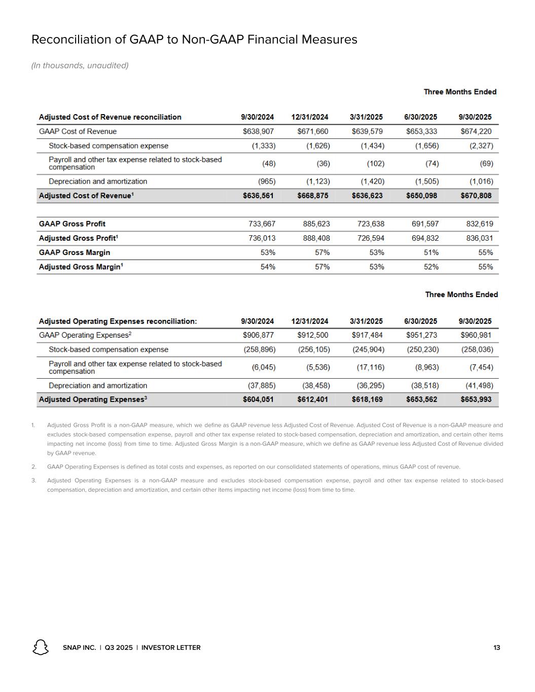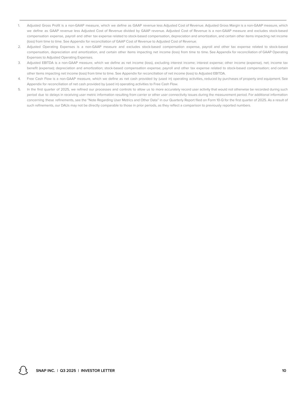 1.​ Adjusted Gross Profit is a non-GAAP measure, which we define as GAAP revenue less Adjusted Cost of Revenue. Adjusted Gross Margin is a non-GAAP measure, which we define as GAAP revenue less Adjusted Cost of Revenue divided by GAAP revenue. Adjusted Cost of Revenue is a non-GAAP measure and excludes stock-based compensation expense, payroll and other tax expense related to stock-based compensation, depreciation and amortization, and certain other items impacting net income (loss) from time to time. See Appendix for reconciliation of GAAP Cost of Revenue to Adjusted Cost of Revenue. 2.​ Adjusted Operating Expenses is a non-GAAP measure and excludes stock-based compensation expense, payroll and other tax expense related to stock-based compensation, depreciation and amortization, and certain other items impacting net income (loss) from time to time. See Appendix for reconciliation of GAAP Operating Expenses to Adjusted Operating Expenses. 3.​ Adjusted EBITDA is a non-GAAP measure, which we define as net income (loss), excluding interest income; interest expense; other income (expense), net; income tax benefit (expense); depreciation and amortization; stock-based compensation expense; payroll and other tax expense related to stock-based compensation; and certain other items impacting net income (loss) from time to time. See Appendix for reconciliation of net income (loss) to Adjusted EBITDA. 4.​ Free Cash Flow is a non-GAAP measure, which we define as net cash provided by (used in) operating activities, reduced by purchases of property and equipment. See Appendix for reconciliation of net cash provided by (used in) operating activities to Free Cash Flow. 5.​ In the first quarter of 2025, we refined our processes and controls to allow us to more accurately record user activity that would not otherwise be recorded during such period due to delays in receiving user metric information resulting from carrier or other user connectivity issues during the measurement period. For additional information concerning these refinements, see the “Note Regarding User Metrics and Other Data” in our Quarterly Report filed on Form 10-Q for the first quarter of 2025. As a result of such refinements, our DAUs may not be directly comparable to those in prior periods, as they reflect a comparison to previously reported numbers. SNAP INC. | Q3 2025 | INVESTOR LETTER 10
