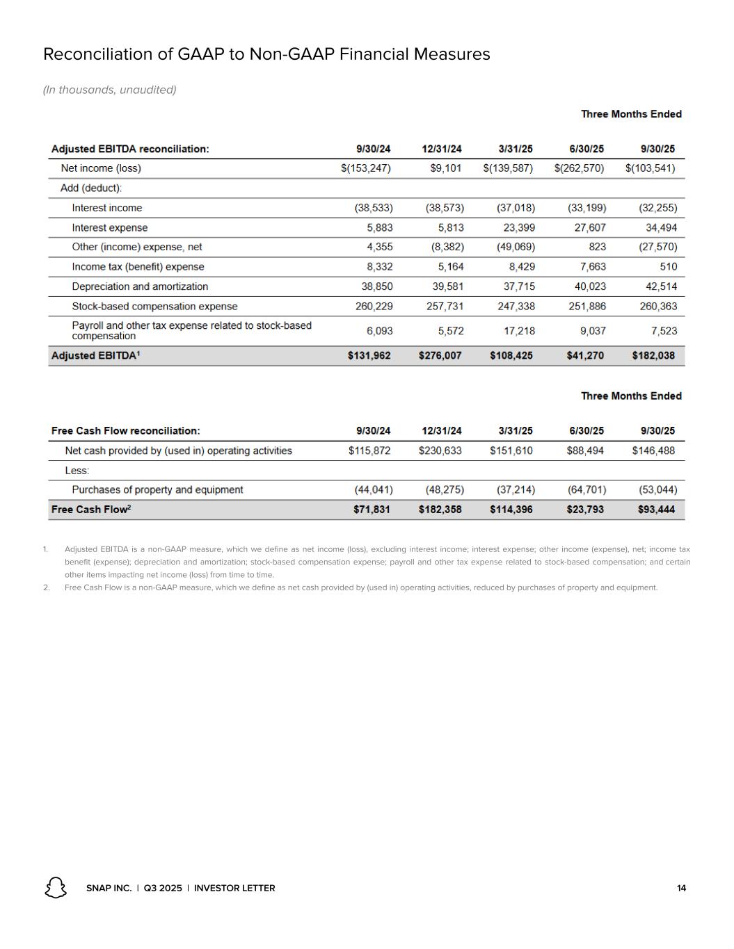 Reconciliation of GAAP to Non-GAAP Financial Measures (In thousands, unaudited) 1.​ Adjusted Gross Profit is a non-GAAP measure, which we define as GAAP revenue less Adjusted Cost of Revenue. Adjusted Cost of Revenue is a non-GAAP measure and excludes stock-based compensation expense, payroll and other tax expense related to stock-based compensation, depreciation and amortization, and certain other items impacting net income (loss) from time to time. Adjusted Gross Margin is a non-GAAP measure, which we define as GAAP revenue less Adjusted Cost of Revenue divided by GAAP revenue. 2.​ GAAP Operating Expenses is defined as total costs and expenses, as reported on our consolidated statements of operations, minus GAAP cost of revenue. 3.​ Adjusted Operating Expenses is a non-GAAP measure and excludes stock-based compensation expense, payroll and other tax expense related to stock-based compensation, depreciation and amortization, and certain other items impacting net income (loss) from time to time. SNAP INC. | Q3 2025 | INVESTOR LETTER 13