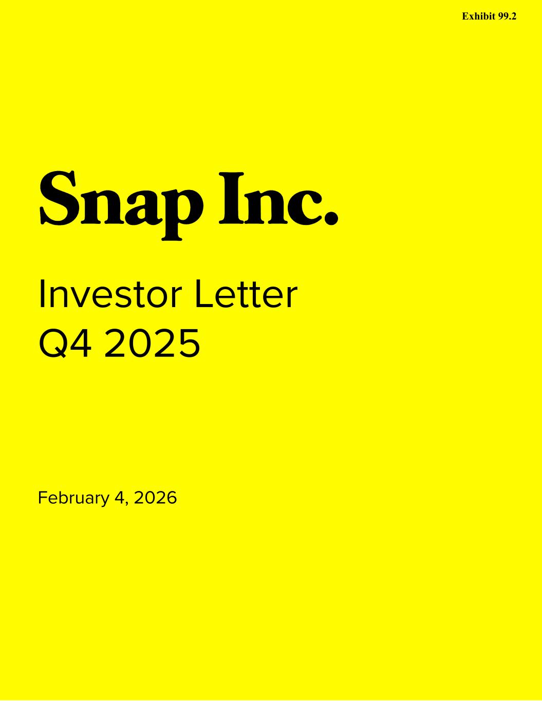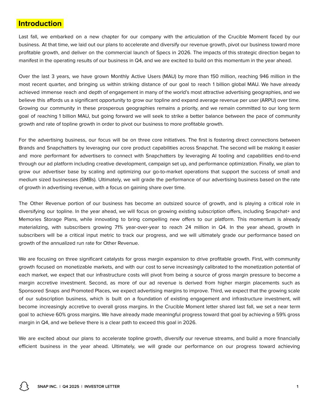 ​ Introduction ​ ​Last​ ​fall,​ ​we​ ​embarked​ ​on​ ​a​ ​new​ ​chapter​ ​for​ ​our​ ​company​ ​with​ ​the​ ​articulation​ ​of​ ​the​ ​Crucible​ ​Moment​ ​faced​ ​by​ ​our​ ​business.​​At​​that​​time,​​we​​laid​​out​​our​​plans​​to​​accelerate​​and​​diversify​​our​​revenue​​growth,​​pivot​​our​​business​​toward​​more​ ​profitable​​growth,​​and​​deliver​​on​​the​​commercial​​launch​​of​​Specs​​in​​2026.​​The​​impacts​​of​​this​​strategic​​direction​​began​​to​ ​manifest in the operating results of our business in Q4, and we are excited to build on this momentum in the year ahead.​ ​Over​ ​the​ ​last​ ​3​ ​years,​ ​we​ ​have​ ​grown​ ​Monthly​ ​Active​ ​Users​​(MAU)​​by​​more​​than​​150​​million,​​reaching​​946​​million​​in​​the​ ​most​ ​recent​ ​quarter,​ ​and​ ​bringing​ ​us​ ​within​ ​striking​ ​distance​ ​of​ ​our​ ​goal​ ​to​ ​reach​ ​1​​billion​​global​​MAU.​​We​​have​​already​ ​achieved​​immense​​reach​​and​​depth​​of​​engagement​​in​​many​​of​​the​​world’s​​most​​attractive​​advertising​​geographies,​​and​​we​ ​believe​​this​​affords​​us​​a​​significant​​opportunity​​to​​grow​​our​​topline​​and​​expand​​average​​revenue​​per​​user​​(ARPU)​​over​​time.​ ​Growing​ ​our​ ​community​ ​in​ ​these​ ​prosperous​ ​geographies​ ​remains​ ​a​​priority,​​and​​we​​remain​​committed​​to​​our​​long​​term​ ​goal​ ​of​ ​reaching​​1​​billion​​MAU,​​but​​going​​forward​​we​​will​​seek​​to​​strike​​a​​better​​balance​​between​​the​​pace​​of​​community​ ​growth and rate of topline growth in order to pivot our business to more profitable growth.​ ​For​ ​the​ ​advertising​ ​business,​ ​our​ ​focus​ ​will​ ​be​ ​on​ ​three​​core​​initiatives.​​The​​first​​is​​fostering​​direct​​connections​​between​ ​Brands​​and​​Snapchatters​​by​​leveraging​​our​​core​​product​​capabilities​​across​​Snapchat.​​The​​second​​will​​be​​making​​it​​easier​ ​and​ ​more​ ​performant​ ​for​ ​advertisers​ ​to​ ​connect​ ​with​ ​Snapchatters​ ​by​ ​leveraging​ ​AI​ ​tooling​ ​and​ ​capabilities​ ​end-to-end​ ​through​​our​​ad​​platform​​including​​creative​​development,​​campaign​​set​​up,​​and​​performance​​optimization.​​Finally,​​we​​plan​​to​ ​grow​ ​our​ ​advertiser​ ​base​ ​by​ ​scaling​ ​and​ ​optimizing​ ​our​ ​go-to-market​ ​operations​ ​that​ ​support​ ​the​ ​success​ ​of​ ​small​ ​and​ ​medium​​sized​​businesses​​(SMBs).​​Ultimately,​​we​​will​​grade​​the​​performance​​of​​our​​advertising​​business​​based​​on​​the​​rate​ ​of growth in advertising revenue, with a focus on gaining share over time.​ ​The​ ​Other​ ​Revenue​ ​portion​ ​of​ ​our​ ​business​ ​has​ ​become​ ​an​ ​outsized​ ​source​ ​of​ ​growth,​ ​and​ ​is​ ​playing​ ​a​ ​critical​ ​role​ ​in​ ​diversifying​ ​our​ ​topline.​​In​​the​​year​​ahead,​​we​​will​​focus​​on​​growing​​existing​​subscription​​offers,​​including​​Snapchat+​​and​ ​Memories​ ​Storage​ ​Plans,​ ​while​ ​innovating​ ​to​ ​bring​ ​compelling​ ​new​ ​offers​ ​to​ ​our​ ​platform.​ ​This​ ​momentum​ ​is​ ​already​ ​materializing,​ ​with​ ​subscribers​ ​growing​ ​71%​ ​year-over-year​ ​to​ ​reach​ ​24​ ​million​ ​in​ ​Q4.​ ​In​ ​the​ ​year​ ​ahead,​ ​growth​ ​in​ ​subscribers​ ​will​ ​be​ ​a​ ​critical​ ​input​ ​metric​ ​to​ ​track​ ​our​ ​progress,​ ​and​ ​we​ ​will​ ​ultimately​ ​grade​ ​our​​performance​​based​​on​ ​growth of the annualized run rate for Other Revenue.​ ​We​​are​​focusing​​on​​three​​significant​​catalysts​​for​​gross​​margin​​expansion​​to​​drive​​profitable​​growth.​​First,​​with​​community​ ​growth​​focused​​on​​monetizable​​markets,​​and​​with​​our​​cost​​to​​serve​​increasingly​​calibrated​​to​​the​​monetization​​potential​​of​ ​each​​market,​​we​​expect​​that​​our​​infrastructure​​costs​​will​​pivot​​from​​being​​a​​source​​of​​gross​​margin​​pressure​​to​​become​​a​ ​margin​ ​accretive​ ​investment.​ ​Second,​ ​as​ ​more​ ​of​ ​our​ ​ad​ ​revenue​ ​is​ ​derived​ ​from​ ​higher​ ​margin​ ​placements​ ​such​ ​as​ ​Sponsored​​Snaps​​and​​Promoted​​Places,​​we​​expect​​advertising​​margins​​to​​improve.​​Third,​​we​​expect​​that​​the​​growing​​scale​ ​of​ ​our​ ​subscr