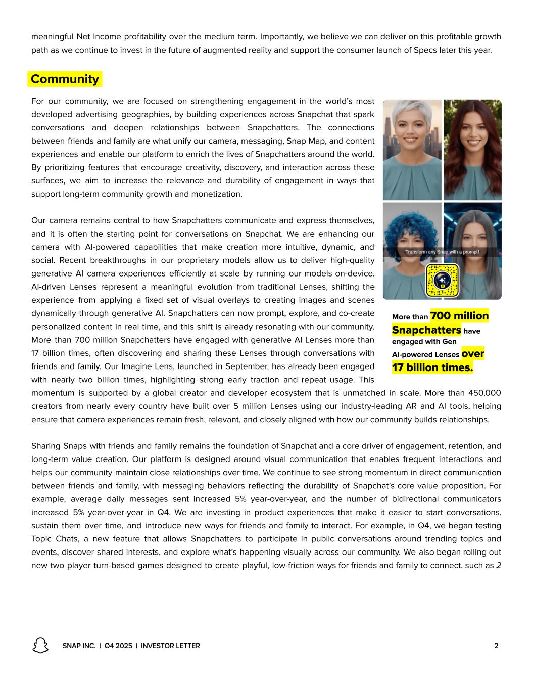 ​meaningful​​Net​​Income​​profitability​​over​​the​​medium​​term.​​Importantly,​​we​​believe​​we​​can​​deliver​​on​​this​​profitable​​growth​ ​path as we continue to invest in the future of augmented reality and support the consumer launch of Specs later this year.​ ​ Community ​ ​For​ ​our​ ​community,​ ​we​ ​are​ ​focused​ ​on​ ​strengthening​ ​engagement​ ​in​ ​the​ ​world’s​ ​most​ ​developed​ ​advertising​ ​geographies,​​by​​building​​experiences​​across​​Snapchat​​that​​spark​ ​conversations​ ​and​ ​deepen​ ​relationships​ ​between​ ​Snapchatters.​ ​The​ ​connections​ ​between​​friends​​and​​family​​are​​what​​unify​​our​​camera,​​messaging,​​Snap​​Map,​​and​​content​ ​experiences​​and​​enable​​our​​platform​​to​​enrich​​the​​lives​​of​​Snapchatters​​around​​the​​world.​ ​By​ ​prioritizing​ ​features​ ​that​ ​encourage​ ​creativity,​​discovery,​​and​​interaction​​across​​these​ ​surfaces,​ ​we​ ​aim​ ​to​ ​increase​ ​the​ ​relevance​ ​and​ ​durability​ ​of​ ​engagement​ ​in​ ​ways​ ​that​ ​support long-term community growth and monetization.​ ​Our​ ​camera​​remains​​central​​to​​how​​Snapchatters​​communicate​​and​​express​​themselves,​ ​and​ ​it​ ​is​ ​often​ ​the​ ​starting​ ​point​ ​for​ ​conversations​ ​on​ ​Snapchat.​ ​We​ ​are​ ​enhancing​ ​our​ ​camera​ ​with​ ​AI-powered​ ​capabilities​ ​that​ ​make​ ​creation​ ​more​ ​intuitive,​ ​dynamic,​ ​and​ ​social.​ ​Recent​ ​breakthroughs​ ​in​ ​our​ ​proprietary​ ​models​ ​allow​ ​us​ ​to​ ​deliver​ ​high-quality​ ​generative​ ​AI​ ​camera​ ​experiences​ ​efficiently​ ​at​ ​scale​ ​by​ ​running​ ​our​​models​​on-device.​ ​AI-driven​ ​Lenses​ ​represent​ ​a​ ​meaningful​ ​evolution​ ​from​ ​traditional​ ​Lenses,​ ​shifting​ ​the​ ​experience​ ​from​ ​applying​ ​a​ ​fixed​ ​set​ ​of​ ​visual​ ​overlays​ ​to​ ​creating​ ​images​ ​and​ ​scenes​ ​dynamically​​through​​generative​​AI.​​Snapchatters​​can​​now​​prompt,​​explore,​​and​​co-create​ ​personalized​​content​​in​​real​​time,​​and​​this​​shift​​is​​already​​resonating​​with​​our​​community.​ ​More​ ​than​ ​700​​million​​Snapchatters​​have​​engaged​​with​​generative​​AI​​Lenses​​more​​than​ ​17​ ​billion​ ​times,​ ​often​ ​discovering​ ​and​ ​sharing​ ​these​ ​Lenses​ ​through​​conversations​​with​ ​friends​​and​​family.​​Our​​Imagine​​Lens,​​launched​​in​​September,​​has​​already​​been​​engaged​ ​with​ ​nearly​ ​two​ ​billion​ ​times,​ ​highlighting​ ​strong​ ​early​ ​traction​ ​and​ ​repeat​ ​usage.​ ​This​ ​momentum​ ​is​ ​supported​ ​by​ ​a​ ​global​ ​creator​ ​and​ ​developer​ ​ecosystem​ ​that​ ​is​ ​unmatched​ ​in​ ​scale.​ ​More​ ​than​ ​450,000​ ​creators​ ​from​ ​nearly​ ​every​ ​country​ ​have​ ​built​ ​over​ ​5​ ​million​ ​Lenses​ ​using​ ​our​ ​industry-leading​ ​AR​ ​and​ ​AI​ ​tools,​​helping​ ​ensure that camera experiences remain fresh, relevant, and closely aligned with how our community builds relationships.​ ​Sharing​​Snaps​​with​​friends​​and​​family​​remains​​the​​foundation​​of​​Snapchat​​and​​a​​core​​driver​​of​​engagement,​​retention,​​and​ ​long-term​ ​value​ ​creation.​ ​Our​ ​platform​ ​is​ ​designed​ ​around​ ​visual​ ​communication​ ​that​ ​enables​ ​frequent​ ​interactions​ ​and​ ​helps​​our​​community​​maintain​​close​​relationships​​over​​time.​​We​​continue​​to​​see​​strong​​momentum​​in​​direct​​communication​ ​between​ ​friends​ ​and​ ​family,​ ​with​ ​messaging​ ​behaviors​ ​reflecting​ ​the​ ​durability​ ​of​ ​Snapchat’s​​core​​value​​proposition.​​For​ ​example,​ ​average​ ​daily​ ​messages​ ​sent​ ​increased​ ​5%​ ​year-over-year,​ ​and​ ​the​ ​number​ ​of​ ​bidirectional​ ​communicators​ ​increased​ ​5%​ ​year-over-year​ ​in​ ​Q4.​ ​We​ ​are​ ​investing​ ​in​ ​product​ ​experiences​ ​that​ ​make​ ​it​ ​easier​ ​to​ ​start​ ​conversations,​ ​sustain​ ​them​ ​over​ ​time,​ ​and​ ​introduce​ ​new​ ​ways​​for​​friends​​and​​family​​to​​interact.​​For​​example,​​in​​Q4,​​we​​began​​testing​ ​Topic​ ​Chats,​ ​a​ ​new​ ​feature​ ​that​ ​allows​ ​Snapchatters​ ​to​ ​participate​ ​in​ ​public​ ​conversations​ ​around​ ​trending​ ​topics​ ​and​ ​events,​​discover​​shared​​interests,​​and​​explore​​what’s​​happening​​visually​​across​​our​​community.​​We​