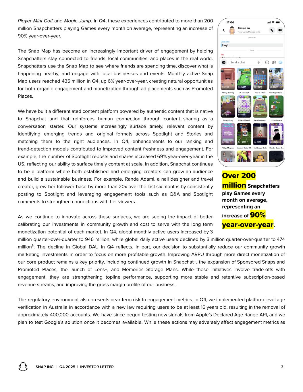 ​Player​​Mini​​Golf​​and​​Magic​​Jump​​.​​In​​Q4,​​these​​experiences​​contributed​​to​​more​​than​​200​ ​million​​Snapchatters​​playing​​Games​​every​​month​​on​​average,​​representing​​an​​increase​​of​ ​90% year-over-year.​ ​The​ ​Snap​ ​Map​ ​has​ ​become​ ​an​ ​increasingly​ ​important​ ​driver​ ​of​ ​engagement​​by​​helping​ ​Snapchatters​ ​stay​ ​connected​ ​to​ ​friends,​​local​​communities,​​and​​places​​in​​the​​real​​world.​ ​Snapchatters​​use​​the​​Snap​​Map​​to​​see​​where​​friends​​are​​spending​​time,​​discover​​what​​is​ ​happening​ ​nearby,​ ​and​ ​engage​ ​with​ ​local​ ​businesses​ ​and​ ​events.​ ​Monthly​ ​active​ ​Snap​ ​Map​​users​​reached​​435​​million​​in​​Q4,​​up​​6%​​year-over-year,​​creating​​natural​​opportunities​ ​for​​both​​organic​​engagement​​and​​monetization​​through​​ad​​placements​​such​​as​​Promoted​ ​Places.​ ​We​​have​​built​​a​​differentiated​​content​​platform​​powered​​by​​authentic​​content​​that​​is​​native​ ​to​ ​Snapchat​ ​and​ ​that​ ​reinforces​ ​human​ ​connection​ ​through​ ​content​ ​sharing​ ​as​ ​a​ ​conversation​ ​starter.​ ​Our​ ​systems​ ​increasingly​ ​surface​ ​timely,​ ​relevant​ ​content​ ​by​ ​identifying​ ​emerging​ ​trends​ ​and​ ​original​ ​formats​ ​across​ ​Spotlight​ ​and​ ​Stories​ ​and​ ​matching​ ​them​ ​to​ ​the​ ​right​ ​audiences.​ ​In​ ​Q4,​ ​enhancements​ ​to​ ​our​ ​ranking​ ​and​ ​trend-detection​​models​​contributed​​to​​improved​​content​​freshness​​and​​engagement.​​For​ ​example,​​the​​number​​of​​Spotlight​​reposts​​and​​shares​​increased​​69%​​year-over-year​​in​​the​ ​US,​​reflecting​​our​​ability​​to​​surface​​timely​​content​​at​​scale.​​In​​addition,​​Snapchat​​continues​ ​to​ ​be​ ​a​ ​platform​ ​where​ ​both​ ​established​ ​and​ ​emerging​ ​creators​ ​can​ ​grow​​an​​audience​ ​and​ ​build​ ​a​ ​sustainable​ ​business.​ ​For​ ​example,​ ​Randa​​Adami,​​a​​nail​​designer​​and​​travel​ ​creator,​​grew​​her​​follower​​base​​by​​more​​than​​20x​​over​​the​​last​​six​​months​​by​​consistently​ ​posting​ ​to​ ​Spotlight​ ​and​ ​leveraging​ ​engagement​ ​tools​ ​such​ ​as​ ​Q&A​ ​and​ ​Spotlight​ ​comments to strengthen connections with her viewers.​ ​As​ ​we​ ​continue​ ​to​ ​innovate​ ​across​ ​these​ ​surfaces,​ ​we​ ​are​ ​seeing​ ​the​ ​impact​ ​of​ ​better​ ​calibrating​ ​our​ ​investments​ ​in​ ​community​ ​growth​ ​and​ ​cost​ ​to​ ​serve​ ​with​ ​the​ ​long​ ​term​ ​monetization​​potential​​of​​each​​market.​​In​​Q4,​​global​​monthly​​active​​users​​increased​​by​​3​ ​million​​quarter-over-quarter​​to​​946​​million,​​while​​global​​daily​​active​​users​​declined​​by​​3​​million​​quarter-over-quarter​​to​​474​ ​million​​5​​.​ ​The​ ​decline​ ​in​ ​Global​ ​DAU​ ​in​ ​Q4​ ​reflects,​ ​in​ ​part,​ ​our​ ​decision​ ​to​ ​substantially​ ​reduce​ ​our​ ​community​ ​growth​ ​marketing​ ​investments​ ​in​​order​​to​​focus​​on​​more​​profitable​​growth.​​Improving​​ARPU​​through​​more​​direct​​monetization​​of​ ​our​​core​​product​​remains​​a​​key​​priority,​​including​​continued​​growth​​in​​Snapchat+,​​the​​expansion​​of​​Sponsored​​Snaps​​and​ ​Promoted​ ​Places,​ ​the​ ​launch​ ​of​ ​Lens+,​ ​and​ ​Memories​ ​Storage​ ​Plans.​ ​While​ ​these​ ​initiatives​ ​involve​ ​trade-offs​ ​with​ ​engagement,​ ​they​ ​are​ ​strengthening​ ​topline​ ​performance,​ ​supporting​ ​more​ ​stable​ ​and​ ​retentive​ ​subscription-based​ ​revenue streams, and improving the gross margin profile of our business.​ ​The​​regulatory​​environment​​also​​presents​​near-term​​risk​​to​​engagement​​metrics.​​In​​Q4,​​we​​implemented​​platform-level​​age​ ​verification​​in​​Australia​​in​​accordance​​with​​a​​new​​law​​requiring​​users​​to​​be​​at​​least​​16​​years​​old,​​resulting​​in​​the​​removal​​of​ ​approximately​​400,000​​accounts.​​We​​have​​since​​begun​​testing​​new​​signals​​from​​Apple’s​​Declared​​Age​​Range​​API,​​and​​we​ ​plan​​to​​test​​Google’s​​solution​​once​​it​​becomes​​available.​​While​​these​​actions​​may​​adversely​​affect​​engagement​​metrics​​as​ ​SNAP INC. | Q4 2025 | INVESTOR LETTER​ ​3​