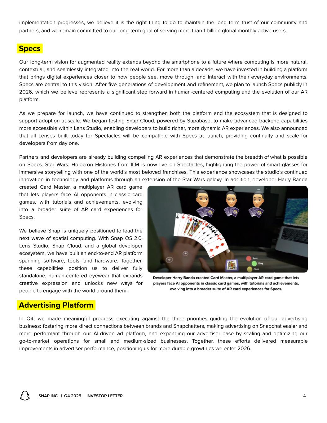 ​implementation​ ​progresses,​ ​we​ ​believe​ ​it​ ​is​ ​the​ ​right​ ​thing​ ​to​ ​do​ ​to​ ​maintain​ ​the​ ​long​ ​term​ ​trust​ ​of​ ​our​ ​community​ ​and​ ​partners, and we remain committed to our long-term goal of serving more than 1 billion global monthly active users.​ ​ Specs ​ ​Our​ ​long-term​​vision​​for​​augmented​​reality​​extends​​beyond​​the​​smartphone​​to​​a​​future​​where​​computing​​is​​more​​natural,​ ​contextual,​​and​​seamlessly​​integrated​​into​​the​​real​​world.​​For​​more​​than​​a​​decade,​​we​​have​​invested​​in​​building​​a​​platform​ ​that​ ​brings​ ​digital​ ​experiences​ ​closer​ ​to​ ​how​ ​people​ ​see,​ ​move​ ​through,​ ​and​ ​interact​ ​with​​their​​everyday​​environments.​ ​Specs​​are​​central​​to​​this​​vision.​​After​​five​​generations​​of​​development​​and​​refinement,​​we​​plan​​to​​launch​​Specs​​publicly​​in​ ​2026,​ ​which​ ​we​ ​believe​ ​represents​ ​a​ ​significant​​step​​forward​​in​​human-centered​​computing​​and​​the​​evolution​​of​​our​​AR​ ​platform.​ ​As​ ​we​ ​prepare​ ​for​ ​launch,​ ​we​ ​have​ ​continued​ ​to​ ​strengthen​ ​both​ ​the​ ​platform​ ​and​ ​the​ ​ecosystem​ ​that​ ​is​ ​designed​ ​to​ ​support​​adoption​​at​​scale.​​We​​began​​testing​​Snap​​Cloud,​​powered​​by​​Supabase,​​to​​make​​advanced​​backend​​capabilities​ ​more​​accessible​​within​​Lens​​Studio,​​enabling​​developers​​to​​build​​richer,​​more​​dynamic​​AR​​experiences.​​We​​also​​announced​ ​that​ ​all​ ​Lenses​ ​built​ ​today​ ​for​ ​Spectacles​ ​will​ ​be​ ​compatible​ ​with​ ​Specs​ ​at​ ​launch,​ ​providing​ ​continuity​ ​and​ ​scale​ ​for​ ​developers from day one.​ ​Partners​​and​​developers​​are​​already​​building​​compelling​​AR​​experiences​​that​​demonstrate​​the​​breadth​​of​​what​​is​​possible​ ​on​ ​Specs.​ ​Star​ ​Wars:​ ​Holocron​ ​Histories​ ​from​ ​ILM​ ​is​ ​now​ ​live​ ​on​​Spectacles,​​highlighting​​the​​power​​of​​smart​​glasses​​for​ ​immersive​​storytelling​​with​​one​​of​​the​​world’s​​most​​beloved​​franchises.​​This​​experience​​showcases​​the​​studio’s​​continued​ ​innovation​ ​in​ ​technology​ ​and​​platforms​​through​​an​​extension​​of​​the​​Star​​Wars​​galaxy.​​In​​addition,​​developer​​Harry​​Banda​ ​created​ ​Card​ ​Master,​ ​a​ ​multiplayer​ ​AR​ ​card​ ​game​ ​that​ ​lets​ ​players​ ​face​ ​AI​ ​opponents​ ​in​ ​classic​ ​card​ ​games,​ ​with​ ​tutorials​ ​and​ ​achievements,​ ​evolving​ ​into​ ​a​ ​broader​ ​suite​ ​of​ ​AR​ ​card​ ​experiences​ ​for​ ​Specs.​ ​We​ ​believe​ ​Snap​ ​is​ ​uniquely​ ​positioned​​to​​lead​​the​ ​next​ ​wave​ ​of​ ​spatial​ ​computing.​ ​With​ ​Snap​ ​OS​​2.0,​ ​Lens​ ​Studio,​ ​Snap​ ​Cloud,​ ​and​ ​a​ ​global​ ​developer​ ​ecosystem,​​we​​have​​built​​an​​end-to-end​​AR​​platform​ ​spanning​ ​software,​ ​tools,​ ​and​ ​hardware.​ ​Together,​ ​these​ ​capabilities​ ​position​ ​us​ ​to​ ​deliver​ ​fully​ ​standalone,​ ​human-centered​ ​eyewear​ ​that​ ​expands​ ​creative​ ​expression​ ​and​ ​unlocks​ ​new​ ​ways​ ​for​ ​people to engage with the world around them.​ ​ Advertising Platform ​ ​In​ ​Q4,​ ​we​ ​made​ ​meaningful​ ​progress​ ​executing​ ​against​ ​the​ ​three​ ​priorities​ ​guiding​ ​the​ ​evolution​ ​of​ ​our​ ​advertising​ ​business:​​fostering​​more​​direct​​connections​​between​​brands​​and​​Snapchatters,​​making​​advertising​​on​​Snapchat​​easier​​and​ ​more​ ​performant​ ​through​ ​our​ ​AI-driven​ ​ad​ ​platform,​ ​and​ ​expanding​ ​our​ ​advertiser​ ​base​ ​by​ ​scaling​ ​and​ ​optimizing​ ​our​ ​go-to-market​ ​operations​ ​for​ ​small​ ​and​ ​medium-sized​ ​businesses.​ ​Together,​ ​these​ ​efforts​ ​delivered​ ​measurable​ ​improvements in advertiser performance, positioning us for more durable growth as we enter 2026.​ ​SNAP INC. | Q4 2025 | INVESTOR LETTER​ ​4​