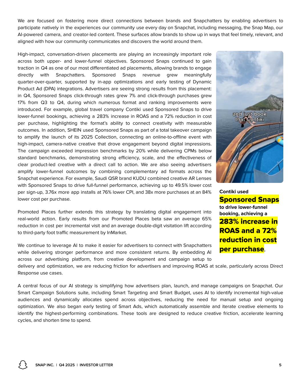 ​We​ ​are​ ​focused​ ​on​ ​fostering​ ​more​ ​direct​ ​connections​ ​between​ ​brands​ ​and​ ​Snapchatters​ ​by​ ​enabling​ ​advertisers​ ​to​ ​participate​​natively​​in​​the​​experiences​​our​​community​​use​​every​​day​​on​​Snapchat,​​including​​messaging,​​the​​Snap​​Map,​​our​ ​AI-powered​​camera,​​and​​creator-led​​content.​​These​​surfaces​​allow​​brands​​to​​show​​up​​in​​ways​​that​​feel​​timely,​​relevant,​​and​ ​aligned with how our community communicates and discovers the world around them.​ ​High-impact,​ ​conversation-driven​ ​placements​ ​are​ ​playing​ ​an​ ​increasingly​ ​important​ ​role​ ​across​ ​both​ ​upper-​ ​and​ ​lower-funnel​ ​objectives.​ ​Sponsored​ ​Snaps​ ​continued​ ​to​ ​gain​ ​traction​​in​​Q4​​as​​one​​of​​our​​most​​differentiated​​ad​​placements,​​allowing​​brands​​to​​engage​ ​directly​ ​with​ ​Snapchatters.​ ​Sponsored​ ​Snaps​ ​revenue​ ​grew​ ​meaningfully​ ​quarter-over-quarter,​ ​supported​ ​by​ ​in-app​ ​optimizations​ ​and​ ​early​ ​testing​ ​of​ ​Dynamic​ ​Product​​Ad​​(DPA)​​integrations.​​Advertisers​​are​​seeing​​strong​​results​​from​​this​​placement:​ ​in​ ​Q4,​ ​Sponsored​ ​Snaps​ ​click-through​ ​rates​ ​grew​ ​7%​ ​and​ ​click-through​​purchases​​grew​ ​17%​ ​from​ ​Q3​ ​to​ ​Q4,​ ​during​ ​which​ ​numerous​ ​format​ ​and​ ​ranking​ ​improvements​ ​were​ ​introduced.​ ​For​ ​example,​ ​global​ ​travel​ ​company​ ​Contiki​ ​used​​Sponsored​​Snaps​​to​​drive​ ​lower-funnel​ ​bookings,​ ​achieving​ ​a​ ​283%​ ​increase​​in​​ROAS​​and​​a​​72%​​reduction​​in​​cost​ ​per​ ​purchase,​ ​highlighting​ ​the​ ​format’s​ ​ability​ ​to​ ​connect​ ​creativity​ ​with​ ​measurable​ ​outcomes.​​In​​addition,​​SHEIN​​used​​Sponsored​​Snaps​​as​​part​​of​​a​​total​​takeover​​campaign​ ​to​ ​amplify​ ​the​ ​launch​ ​of​ ​its​ ​2025​ ​Collection,​ ​connecting​ ​an​ ​online-to-offline​ ​event​ ​with​ ​high-impact,​ ​camera-native​ ​creative​ ​that​ ​drove​ ​engagement​ ​beyond​ ​digital​​impressions.​ ​The​ ​campaign​ ​exceeded​ ​impression​ ​benchmarks​ ​by​ ​20%​ ​while​ ​delivering​ ​CPMs​ ​below​ ​standard​ ​benchmarks,​ ​demonstrating​ ​strong​ ​efficiency,​ ​scale,​ ​and​ ​the​ ​effectiveness​ ​of​ ​clear​ ​product-led​ ​creative​ ​with​ ​a​ ​direct​ ​call​ ​to​ ​action.​ ​We​ ​are​ ​also​ ​seeing​ ​advertisers​ ​amplify​ ​lower-funnel​ ​outcomes​ ​by​ ​combining​ ​complementary​ ​ad​ ​formats​ ​across​ ​the​ ​Snapchat​​experience.​​For​​example,​​Saudi​​QSR​​brand​​KUDU​​combined​​creative​​AR​​Lenses​ ​with​​Sponsored​​Snaps​​to​​drive​​full-funnel​​performance,​​achieving​​up​​to​​49.5%​​lower​​cost​ ​per​​sign-up,​​3.76x​​more​​app​​installs​​at​​76%​​lower​​CPI,​​and​​38x​​more​​purchases​​at​​an​​84%​ ​lower cost per purchase.​ ​Promoted​ ​Places​ ​further​ ​extends​ ​this​ ​strategy​ ​by​ ​translating​ ​digital​ ​engagement​ ​into​ ​real-world​ ​action.​ ​Early​ ​results​ ​from​ ​our​ ​Promoted​ ​Places​ ​beta​ ​saw​ ​an​ ​average​ ​65%​ ​reduction​​in​​cost​​per​​incremental​​visit​​and​​an​​average​​double-digit​​visitation​​lift​​according​ ​to third-party foot traffic measurement by InMarket.​ ​We​​continue​​to​​leverage​​AI​​to​​make​​it​​easier​​for​​advertisers​​to​​connect​​with​​Snapchatters​ ​while​ ​delivering​ ​stronger​ ​performance​ ​and​ ​more​ ​consistent​ ​returns.​ ​By​ ​embedding​ ​AI​ ​across​ ​our​ ​advertising​ ​platform,​ ​from​ ​creative​ ​development​ ​and​ ​campaign​ ​setup​ ​to​ ​delivery​ ​and​ ​optimization,​ ​we​​are​​reducing​​friction​​for​​advertisers​​and​​improving​​ROAS​​at​​scale,​​particularly​​across​​Direct​ ​Response use cases.​ ​A​ ​central​ ​focus​ ​of​ ​our​ ​AI​ ​strategy​ ​is​ ​simplifying​ ​how​ ​advertisers​ ​plan,​ ​launch,​​and​​manage​​campaigns​​on​​Snapchat.​​Our​ ​Smart​ ​Campaign​ ​Solutions​ ​suite,​ ​including​ ​Smart​ ​Targeting​ ​and​ ​Smart​ ​Budget,​​uses​​AI​​to​​identify​​incremental​​high-value​ ​audiences​ ​and​ ​dynamically​ ​allocates​ ​spend​ ​across​ ​objectives,​ ​reducing​ ​the​ ​need​ ​for​ ​manual​ ​setup​ ​and​ ​ongoing​ ​optimization.​ ​We​ ​also​ ​began​ ​early​ ​testing​ ​of​ ​Smart​ ​Ads,​ ​which​ ​automatically​ ​assemble​ ​and​ ​iterate​ ​creative​ 