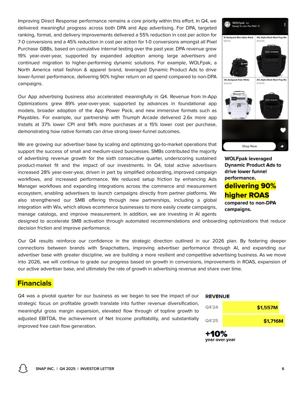 ​Improving​​Direct​​Response​​performance​​remains​​a​​core​​priority​​within​​this​​effort.​​In​​Q4,​​we​ ​delivered​ ​meaningful​ ​progress​ ​across​ ​both​ ​DPA​ ​and​ ​App​ ​advertising.​ ​For​ ​DPA,​ ​targeted​ ​ranking,​​format,​​and​​delivery​​improvements​​delivered​​a​​55%​​reduction​​in​​cost​​per​​action​​for​ ​7-0​​conversions​​and​​a​​45%​​reduction​​in​​cost​​per​​action​​for​​1-0​​conversions​​amongst​​all​​Pixel​ ​Purchase​​GBBs,​​based​​on​​cumulative​​internal​​testing​​over​​the​​past​​year.​​DPA​​revenue​​grew​ ​19%​ ​year-over-year,​ ​supported​ ​by​ ​expanded​ ​adoption​ ​among​ ​large​ ​advertisers​ ​and​ ​continued​ ​migration​ ​to​ ​higher-performing​ ​dynamic​ ​solutions.​ ​For​ ​example,​ ​WOLFpak,​ ​a​ ​North​ ​America​ ​retail​ ​fashion​ ​&​ ​apparel​ ​brand,​ ​leveraged​ ​Dynamic​ ​Product​ ​Ads​ ​to​ ​drive​ ​lower-funnel​​performance,​​delivering​​90%​​higher​​return​​on​​ad​​spend​​compared​​to​​non-DPA​ ​campaigns.​ ​Our​ ​App​ ​advertising​ ​business​ ​also​ ​accelerated​ ​meaningfully​ ​in​ ​Q4.​ ​Revenue​​from​​In-App​ ​Optimizations​ ​grew​ ​89%​ ​year-over-year,​ ​supported​ ​by​ ​advances​ ​in​ ​foundational​ ​app​ ​models,​ ​broader​ ​adoption​ ​of​ ​the​ ​App​ ​Power​ ​Pack,​ ​and​ ​new​ ​immersive​ ​formats​ ​such​ ​as​ ​Playables.​ ​For​ ​example,​ ​our​ ​partnership​ ​with​ ​Triumph​ ​Arcade​ ​delivered​ ​2.6x​ ​more​ ​app​ ​installs​ ​at​ ​37%​ ​lower​ ​CPI​ ​and​ ​94%​ ​more​ ​purchases​ ​at​ ​a​ ​15%​ ​lower​ ​cost​ ​per​ ​purchase,​ ​demonstrating how native formats can drive strong lower-funnel outcomes.​ ​We​​are​​growing​​our​​advertiser​​base​​by​​scaling​​and​​optimizing​​go-to-market​​operations​​that​ ​support​​the​​success​​of​​small​​and​​medium-sized​​businesses.​​SMBs​​contributed​​the​​majority​ ​of​ ​advertising​ ​revenue​ ​growth​ ​for​ ​the​ ​sixth​ ​consecutive​ ​quarter,​ ​underscoring​ ​sustained​ ​product-market​ ​fit​ ​and​ ​the​ ​impact​ ​of​ ​our​ ​investments.​ ​In​ ​Q4,​ ​total​ ​active​ ​advertisers​ ​increased​​28%​​year-over-year,​​driven​​in​​part​​by​​simplified​​onboarding,​​improved​​campaign​ ​workflows,​ ​and​ ​increased​ ​performance.​ ​We​ ​reduced​ ​setup​ ​friction​ ​by​ ​enhancing​ ​Ads​ ​Manager​ ​workflows​ ​and​ ​expanding​ ​integrations​ ​across​ ​the​ ​commerce​ ​and​ ​measurement​ ​ecosystem,​ ​enabling​ ​advertisers​ ​to​ ​launch​ ​campaigns​ ​directly​ ​from​​partner​​platforms.​​We​ ​also​ ​strengthened​ ​our​ ​SMB​ ​offering​ ​through​ ​new​ ​partnerships,​ ​including​ ​a​ ​global​ ​integration​​with​​Wix,​​which​​allows​​ecommerce​​businesses​​to​​more​​easily​​create​​campaigns,​ ​manage​ ​catalogs,​ ​and​ ​improve​ ​measurement.​ ​In​ ​addition,​ ​we​ ​are​ ​investing​ ​in​ ​AI​ ​agents​ ​designed​ ​to​ ​accelerate​ ​SMB​ ​activation​ ​through​ ​automated​ ​recommendations​ ​and​ ​onboarding​ ​optimizations​ ​that​ ​reduce​ ​decision friction and improve performance.​ ​Our​ ​Q4​ ​results​ ​reinforce​ ​our​ ​confidence​ ​in​ ​the​ ​strategic​ ​direction​ ​outlined​ ​in​ ​our​ ​2026​ ​plan.​ ​By​ ​fostering​ ​deeper​ ​connections​ ​between​ ​brands​ ​with​ ​Snapchatters,​ ​improving​ ​advertiser​ ​performance​ ​through​ ​AI,​ ​and​ ​expanding​ ​our​ ​advertiser​​base​​with​​greater​​discipline,​​we​​are​​building​​a​​more​​resilient​​and​​competitive​​advertising​​business.​​As​​we​​move​ ​into​ ​2026,​ ​we​​will​​continue​​to​​grade​​our​​progress​​based​​on​​growth​​in​​conversions,​​improvements​​in​​ROAS,​​expansion​​of​ ​our active advertiser base, and ultimately the rate of growth in advertising revenue and share over time.​ ​ Financials ​ ​Q4​ ​was​ ​a​ ​pivotal​ ​quarter​ ​for​ ​our​ ​business​ ​as​ ​we​ ​began​​to​​see​​the​​impact​​of​​our​ ​strategic​ ​focus​ ​on​ ​profitable​ ​growth​ ​translate​ ​into​ ​further​ ​revenue​ ​diversification,​ ​meaningful​ ​gross​ ​margin​ ​expansion,​ ​elevated​ ​flow​ ​through​ ​of​ ​topline​ ​growth​ ​to​ ​adjusted​ ​EBITDA,​ ​the​ ​achievement​ ​of​ ​Net​ ​Income​ ​profitability,​ ​and​ ​substantially​ ​improved free cash flow generation.​ ​SNAP INC. | Q4 2025 | INVESTOR LETTER​ ​6​