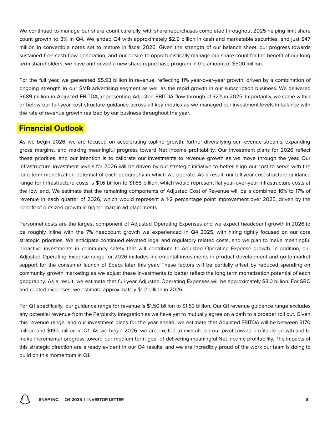 ​We​​continued​​to​​manage​​our​​share​​count​​carefully,​​with​​share​​repurchases​​completed​​throughout​​2025​​helping​​limit​​share​ ​count​ ​growth​ ​to​ ​3%​ ​in​ ​Q4.​ ​We​ ​ended​​Q4​​with​​approximately​​$2.9​​billion​​in​​cash​​and​​marketable​​securities,​​and​​just​​$47​ ​million​ ​in​ ​convertible​ ​notes​ ​set​ ​to​ ​mature​ ​in​ ​fiscal​ ​2026.​ ​Given​ ​the​ ​strength​ ​of​ ​our​​balance​​sheet,​​our​​progress​​towards​ ​sustained​​free​​cash​​flow​​generation,​​and​​our​​desire​​to​​opportunistically​​manage​​our​​share​​count​​for​​the​​benefit​​of​​our​​long​ ​term shareholders, we have authorized a new share repurchase program in the amount of $500 million.​ ​For​ ​the​ ​full​ ​year,​ ​we​ ​generated​ ​$5.93​​billion​​in​​revenue,​​reflecting​​11%​​year-over-year​​growth,​​driven​​by​​a​​combination​​of​ ​ongoing​ ​strength​ ​in​ ​our​ ​SMB​​advertising​​segment​​as​​well​​as​​the​​rapid​​growth​​in​​our​​subscription​​business.​​We​​delivered​ ​$689​​million​​in​​Adjusted​​EBITDA,​​representing​​Adjusted​​EBITDA​​flow-through​​of​​32%​​in​​2025.​​Importantly,​​we​​came​​within​ ​or​​below​​our​​full-year​​cost​​structure​​guidance​​across​​all​​key​​metrics​​as​​we​​managed​​our​​investment​​levels​​in​​balance​​with​ ​the rate of revenue growth realized by our business throughout the year.​ ​ Financial Outlook ​ ​As​ ​we​ ​begin​ ​2026,​ ​we​ ​are​ ​focused​ ​on​ ​accelerating​ ​topline​ ​growth,​ ​further​​diversifying​​our​​revenue​​streams,​​expanding​ ​gross​ ​margins,​ ​and​ ​making​ ​meaningful​ ​progress​ ​toward​ ​Net​ ​Income​ ​profitability.​ ​Our​ ​investment​ ​plans​ ​for​ ​2026​ ​reflect​ ​these​ ​priorities,​ ​and​ ​our​ ​intention​ ​is​ ​to​ ​calibrate​ ​our​ ​investments​ ​to​ ​revenue​ ​growth​ ​as​ ​we​ ​move​ ​through​ ​the​ ​year.​ ​Our​ ​Infrastructure​ ​investment​​levels​​for​​2026​​will​​be​​driven​​by​​our​​strategic​​initiative​​to​​better​​align​​our​​cost​​to​​serve​​with​​the​ ​long​​term​​monetization​​potential​​of​​each​​geography​​in​​which​​we​​operate.​​As​​a​​result,​​our​​full​​year​​cost​​structure​​guidance​ ​range​​for​​Infrastructure​​costs​​is​​$1.6​​billion​​to​​$1.65​​billion,​​which​​would​​represent​​flat​​year-over-year​​infrastructure​​costs​​at​ ​the​ ​low​ ​end.​ ​We​​estimate​​that​​the​​remaining​​components​​of​​Adjusted​​Cost​​of​​Revenue​​will​​be​​a​​combined​​16%​​to​​17%​​of​ ​revenue​ ​in​ ​each​ ​quarter​ ​of​ ​2026,​ ​which​ ​would​ ​represent​ ​a​ ​1-2​ ​percentage​​point​​improvement​​over​​2025,​​driven​​by​​the​ ​benefit of outsized growth in higher margin ad placements.​ ​Personnel​​costs​​are​​the​​largest​​component​​of​​Adjusted​​Operating​​Expenses​​and​​we​​expect​​headcount​​growth​​in​​2026​​to​ ​be​ ​roughly​ ​inline​ ​with​ ​the​ ​7%​ ​headcount​ ​growth​ ​we​ ​experienced​ ​in​ ​Q4​ ​2025,​ ​with​ ​hiring​ ​tightly​ ​focused​ ​on​ ​our​ ​core​ ​strategic​ ​priorities.​ ​We​ ​anticipate​​continued​​elevated​​legal​​and​​regulatory​​related​​costs,​​and​​we​​plan​​to​​make​​meaningful​ ​proactive​ ​investments​ ​in​ ​community​ ​safety​ ​that​ ​will​ ​contribute​ ​to​ ​Adjusted​ ​Operating​ ​Expense​ ​growth.​ ​In​ ​addition,​ ​our​ ​Adjusted​ ​Operating​ ​Expense​​range​​for​​2026​​includes​​incremental​​investments​​in​​product​​development​​and​​go-to-market​ ​support​ ​for​ ​the​ ​consumer​ ​launch​ ​of​ ​Specs​ ​later​ ​this​ ​year.​ ​These​ ​factors​ ​will​ ​be​ ​partially​ ​offset​ ​by​ ​reduced​ ​spending​​on​ ​community​​growth​​marketing​​as​​we​​adjust​​these​​investments​​to​​better​​reflect​​the​​long​​term​​monetization​​potential​​of​​each​ ​geography.​​As​​a​​result,​​we​​estimate​​that​​full-year​​Adjusted​​Operating​​Expenses​​will​​be​​approximately​​$3.0​​billion.​​For​​SBC​ ​and related expenses, we estimate approximately $1.2 billion in 2026.​ ​For​​Q1​​specifically,​​our​​guidance​​range​​for​​revenue​​is​​$1.50​​billion​​to​​$1.53​​billion.​​Our​​Q1​​revenue​​guidance​​range​​excludes​ ​any​​potential​​revenue​​from​​the​​Perplexity​​integration​​as​​we​​have​​yet​​to