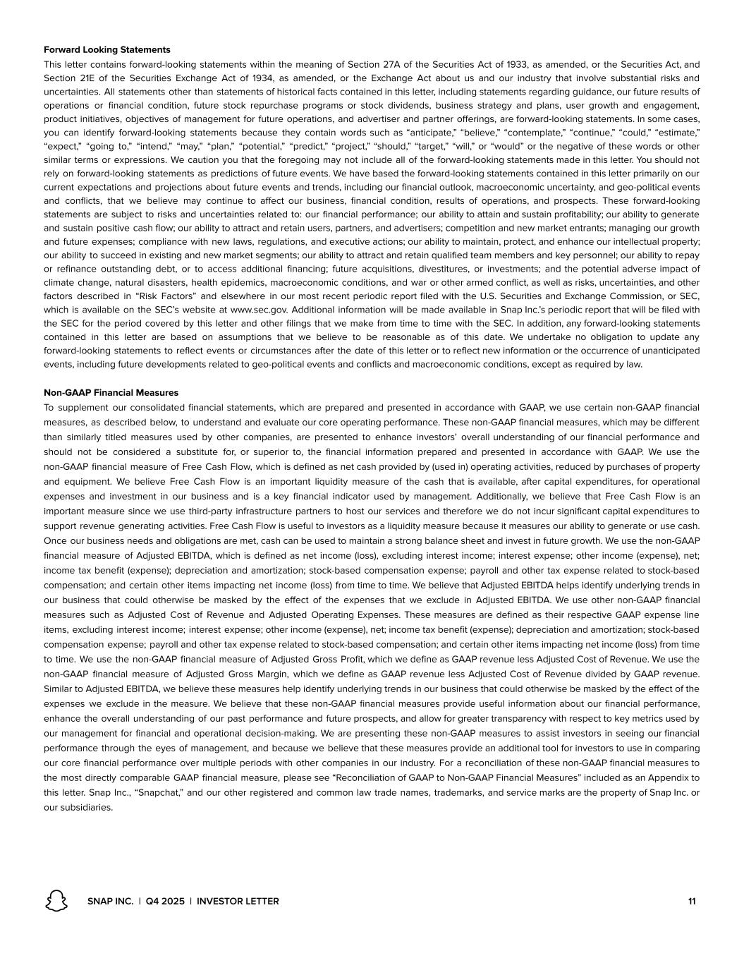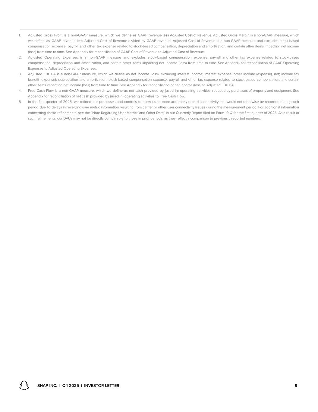 ​1.​ ​Adjusted​ ​Gross​ ​Profit​ ​is​ ​a​ ​non-GAAP​ ​measure,​ ​which​ ​we​ ​define​ ​as​ ​GAAP​ ​revenue​​less​​Adjusted​​Cost​​of​​Revenue.​​Adjusted​​Gross​​Margin​​is​​a​​non-GAAP​​measure,​​which​ ​we​ ​define​ ​as​ ​GAAP​ ​revenue​ ​less​ ​Adjusted​ ​Cost​ ​of​ ​Revenue​ ​divided​ ​by​ ​GAAP​ ​revenue.​ ​Adjusted​ ​Cost​ ​of​ ​Revenue​ ​is​ ​a​ ​non-GAAP​ ​measure​ ​and​ ​excludes​ ​stock-based​ ​compensation​ ​expense,​ ​payroll​ ​and​ ​other​ ​tax​​expense​​related​​to​​stock-based​​compensation,​​depreciation​​and​​amortization,​​and​​certain​​other​​items​​impacting​​net​​income​ ​(loss) from time to time. See Appendix for reconciliation of GAAP Cost of Revenue to Adjusted Cost of Revenue.​ ​2.​ ​Adjusted​ ​Operating​ ​Expenses​ ​is​ ​a​ ​non-GAAP​ ​measure​ ​and​ ​excludes​ ​stock-based​ ​compensation​ ​expense,​ ​payroll​ ​and​ ​other​ ​tax​ ​expense​ ​related​ ​to​ ​stock-based​ ​compensation,​ ​depreciation​ ​and​ ​amortization,​ ​and​ ​certain​ ​other​ ​items​ ​impacting​ ​net​ ​income​ ​(loss)​ ​from​ ​time​ ​to​ ​time.​​See​​Appendix​​for​​reconciliation​​of​​GAAP​​Operating​ ​Expenses to Adjusted Operating Expenses.​ ​3.​ ​Adjusted​ ​EBITDA​ ​is​ ​a​ ​non-GAAP​ ​measure,​ ​which​ ​we​ ​define​ ​as​ ​net​ ​income​ ​(loss),​ ​excluding​ ​interest​ ​income;​ ​interest​ ​expense;​ ​other​ ​income​ ​(expense),​ ​net;​ ​income​ ​tax​ ​benefit​ ​(expense);​ ​depreciation​ ​and​ ​amortization;​ ​stock-based​ ​compensation​ ​expense;​ ​payroll​ ​and​ ​other​ ​tax​ ​expense​ ​related​ ​to​ ​stock-based​ ​compensation;​ ​and​​certain​ ​other items impacting net income (loss) from time to time. See Appendix for reconciliation of net income (loss) to Adjusted EBITDA.​ ​4.​ ​Free​ ​Cash​ ​Flow​ ​is​ ​a​ ​non-GAAP​ ​measure,​ ​which​ ​we​ ​define​ ​as​ ​net​ ​cash​ ​provided​ ​by​ ​(used​ ​in)​ ​operating​ ​activities,​​reduced​​by​​purchases​​of​​property​​and​​equipment.​​See​ ​Appendix for reconciliation of net cash provided by (used in) operating activities to Free Cash Flow.​ ​5.​ ​In​ ​the​ ​first​ ​quarter​ ​of​ ​2025,​ ​we​ ​refined​ ​our​ ​processes​ ​and​ ​controls​ ​to​ ​allow​ ​us​ ​to​ ​more​​accurately​​record​​user​​activity​​that​​would​​not​​otherwise​​be​​recorded​​during​​such​ ​period​ ​due​ ​to​ ​delays​​in​​receiving​​user​​metric​​information​​resulting​​from​​carrier​​or​​other​​user​​connectivity​​issues​​during​​the​​measurement​​period.​​For​​additional​​information​ ​concerning​ ​these​ ​refinements,​​see​​the​​“Note​​Regarding​​User​​Metrics​​and​​Other​​Data”​​in​​our​​Quarterly​​Report​​filed​​on​​Form​​10-Q​​for​​the​​first​​quarter​​of​​2025.​​As​​a​​result​​of​ ​such refinements, our DAUs may not be directly comparable to those in prior periods, as they reflect a comparison to previously reported numbers.​ ​SNAP INC. | Q4 2025 | INVESTOR LETTER​ ​9​