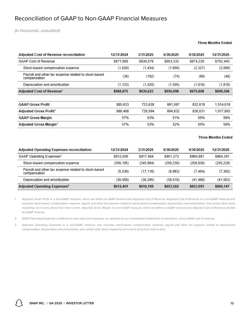 ​Reconciliation of GAAP to Non-GAAP Financial Measures​ ​(In thousands, unaudited)​ ​1.​ ​Adjusted​ ​Gross​ ​Profit​ ​is​ ​a​ ​non-GAAP​ ​measure,​ ​which​ ​we​ ​define​​as​​GAAP​​revenue​​less​​Adjusted​​Cost​​of​​Revenue.​​Adjusted​​Cost​​of​​Revenue​​is​​a​​non-GAAP​​measure​​and​ ​excludes​ ​stock-based​ ​compensation​ ​expense,​ ​payroll​ ​and​​other​​tax​​expense​​related​​to​​stock-based​​compensation,​​depreciation​​and​​amortization,​​and​​certain​​other​​items​ ​impacting​ ​net​ ​income​ ​(loss)​ ​from​ ​time​ ​to​ ​time.​ ​Adjusted​ ​Gross​ ​Margin​ ​is​​a​​non-GAAP​​measure,​​which​​we​​define​​as​​GAAP​​revenue​​less​​Adjusted​​Cost​​of​​Revenue​​divided​ ​by GAAP revenue.​ ​2.​ ​GAAP Operating Expenses is defined as total costs and expenses, as reported on our consolidated statements of operations, minus GAAP cost of revenue.​ ​3.​ ​Adjusted​ ​Operating​ ​Expenses​ ​is​ ​a​ ​non-GAAP​ ​measure​ ​and​ ​excludes​ ​stock-based​ ​compensation​ ​expense,​ ​payroll​ ​and​ ​other​ ​tax​ ​expense​ ​related​ ​to​ ​stock-based​ ​compensation, depreciation and amortization, and certain other items impacting net income (loss) from time to time.​ ​SNAP INC. | Q4 2025 | INVESTOR LETTER​ ​12​