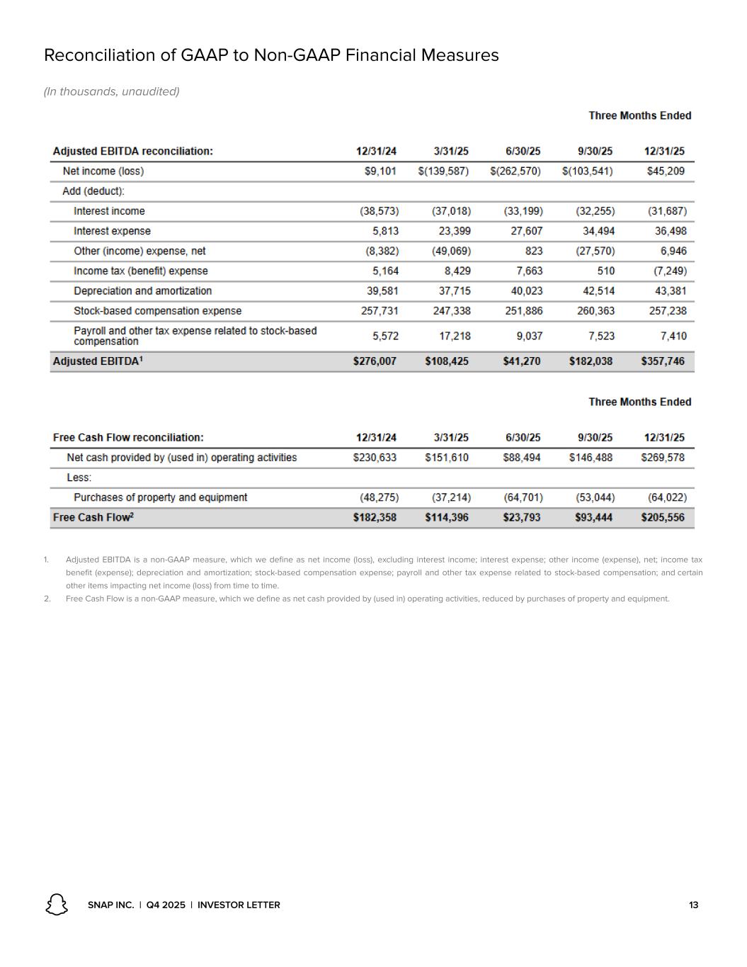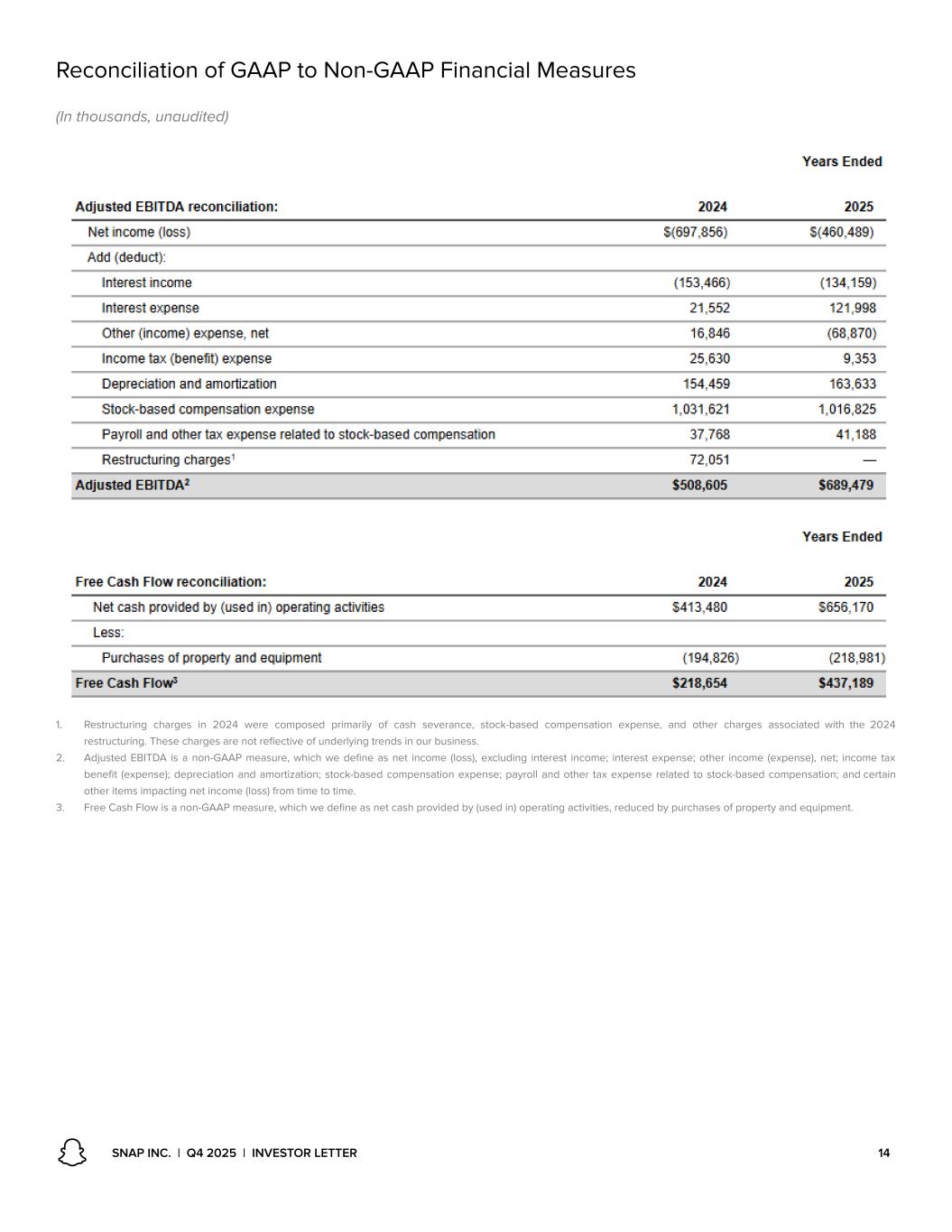 ​Reconciliation of GAAP to Non-GAAP Financial Measures​ ​(In thousands, unaudited)​ ​1.​ ​Restructuring​ ​charges​ ​in​ ​2024​ ​were​ ​composed​ ​primarily​ ​of​ ​cash​ ​severance,​ ​stock-based​ ​compensation​ ​expense,​ ​and​ ​other​ ​charges​ ​associated​ ​with​ ​the​ ​2024​ ​restructuring. These charges are not reflective of underlying trends in our business.​ ​2.​ ​Adjusted​ ​EBITDA​ ​is​ ​a​ ​non-GAAP​ ​measure,​ ​which​ ​we​ ​define​ ​as​ ​net​ ​income​ ​(loss),​ ​excluding​ ​interest​ ​income;​ ​interest​ ​expense;​ ​other​ ​income​ ​(expense),​ ​net;​ ​income​ ​tax​ ​benefit​ ​(expense);​ ​depreciation​ ​and​ ​amortization;​ ​stock-based​ ​compensation​ ​expense;​ ​payroll​ ​and​ ​other​ ​tax​ ​expense​ ​related​ ​to​ ​stock-based​ ​compensation;​ ​and​​certain​ ​other items impacting net income (loss) from time to time.​ ​3.​ ​Free Cash Flow is a non-GAAP measure, which we define as net cash provided by (used in) operating activities, reduced by purchases of property and equipment.​ ​SNAP INC. | Q4 2025 | INVESTOR LETTER​ ​14​
