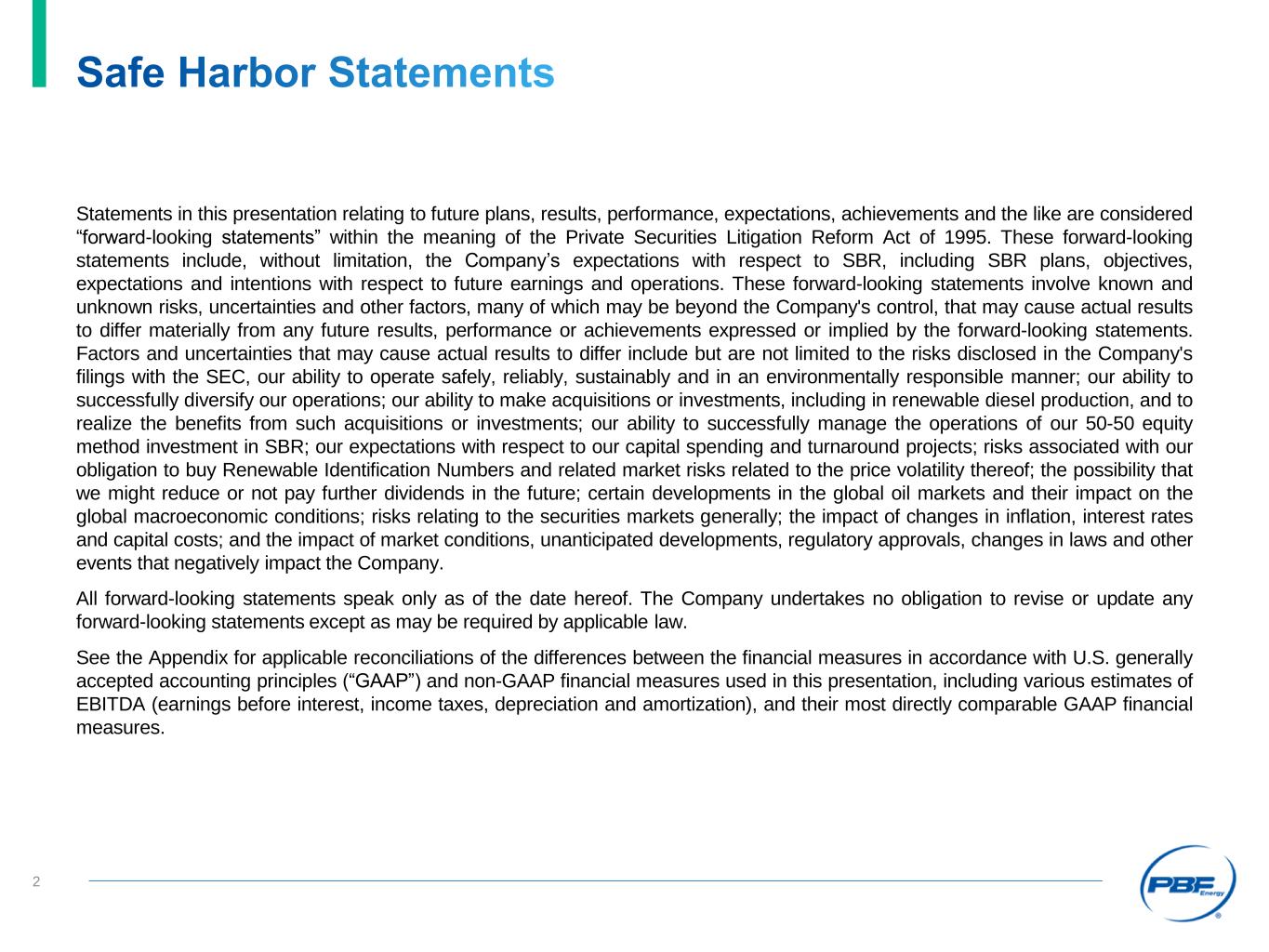 Safe Harbor Statements Statements in this presentation relating to future plans, results, performance, expectations, achievements and the like are considered “forward-looking statements” within the meaning of the Private Securities Litigation Reform Act of 1995. These forward-looking statements include, without limitation, the Company’s expectations with respect to SBR, including SBR plans, objectives, expectations and intentions with respect to future earnings and operations. These forward-looking statements involve known and unknown risks, uncertainties and other factors, many of which may be beyond the Company's control, that may cause actual results to differ materially from any future results, performance or achievements expressed or implied by the forward-looking statements. Factors and uncertainties that may cause actual results to differ include but are not limited to the risks disclosed in the Company's filings with the SEC, our ability to operate safely, reliably, sustainably and in an environmentally responsible manner; our ability to successfully diversify our operations; our ability to make acquisitions or investments, including in renewable diesel production, and to realize the benefits from such acquisitions or investments; our ability to successfully manage the operations of our 50-50 equity method investment in SBR; our expectations with respect to our capital spending and turnaround projects; risks associated with our obligation to buy Renewable Identification Numbers and related market risks related to the price volatility thereof; the possibility that we might reduce or not pay further dividends in the future; certain developments in the global oil markets and their impact on the global macroeconomic conditions; risks relating to the securities markets generally; the impact of changes in inflation, interest rates and capital costs; and the impact of market conditions, unanticipated developments, regulatory approvals, changes in laws and other events that negatively impact the Company. All forward-looking statements speak only as of the date hereof. The Company undertakes no obligation to revise or update any forward-looking statements except as may be required by applicable law. See the Appendix for applicable reconciliations of the differences between the financial measures in accordance with U.S. generally accepted accounting principles (“GAAP”) and non-GAAP financial measures used in this presentation, including various estimates of EBITDA (earnings before interest, income taxes, depreciation and amortization), and their most directly comparable GAAP financial measures. 2