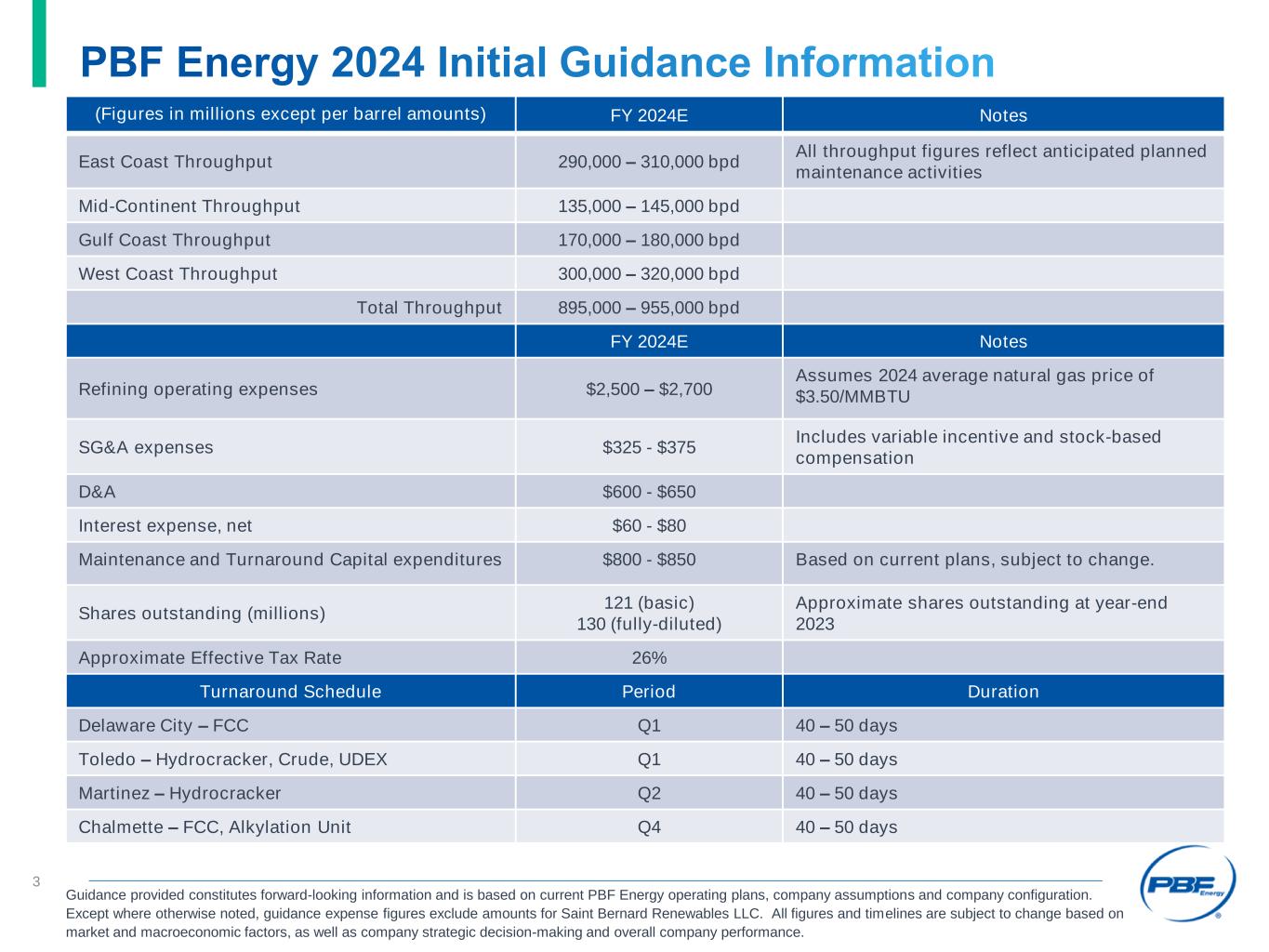 PBF Energy 2024 Guidance Information January 2024