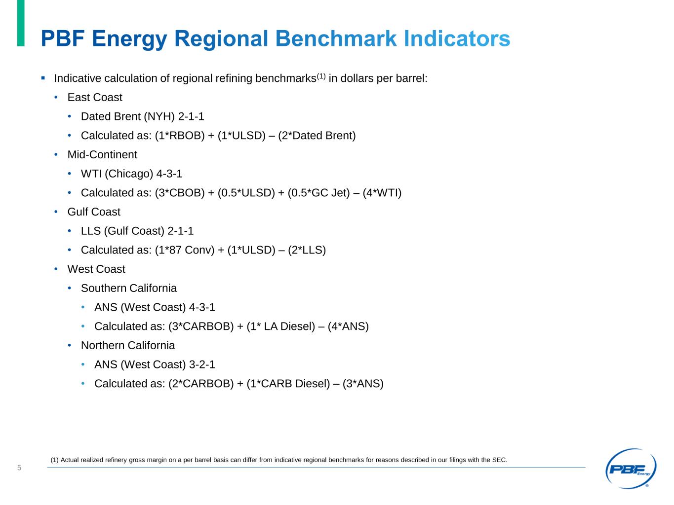 PBF Energy 2020 Guidance Guidance provided constitutes forward-looking information and is based on current PBF Energy operating plans, company assumptions and company configuration. Except where otherwise noted, guidance expense figures exclude amounts for Saint Bernard Renewables LLC. All figures and timelines are subject to change based on market and macroeconomic factors, as well as company strategic decision-making and overall company performance. (Figures in millions except per barrel amounts) FY 2024E Notes East Coast Throughput 290,000 – 310,000 bpd All throughput figures reflect anticipated planned maintenance activities Mid-Continent Throughput 135,000 – 145,000 bpd Gulf Coast Throughput 170,000 – 180,000 bpd West Coast Throughput 300,000 – 320,000 bpd Total Throughput 895,000 – 955,000 bpd FY 2024E Notes Refining operating expenses $2,500 – $2,700 Assumes 2024 average natural gas price of $3.50/MMBTU SG&A expenses $325 - $375 Includes variable incentive and stock-based compensation D&A $600 - $650 Interest expense, net $60 - $80 Maintenance and Turnaround Capital expenditures $800 - $850 Based on current plans, subject to change. Shares outstanding (millions) 121 (basic) 130 (fully-diluted) Approximate shares outstanding at year-end 2023 Approximate Effective Tax Rate 26% Turnaround Schedule Period Duration Delaware City – FCC Q1 40 – 50 days Toledo – Hydrocracker, Crude, UDEX Q1 40 – 50 days Martinez – Hydrocracker Q2 40 – 50 days Chalmette – FCC, Alkylation Unit Q4 40 – 50 days P F Energy 2024 Initial Guidance Information 3