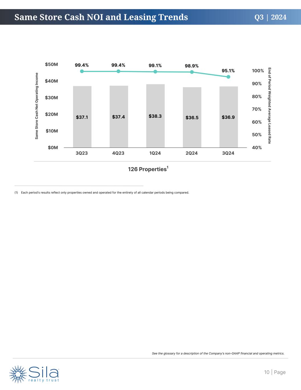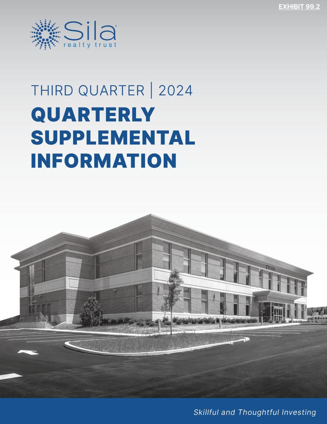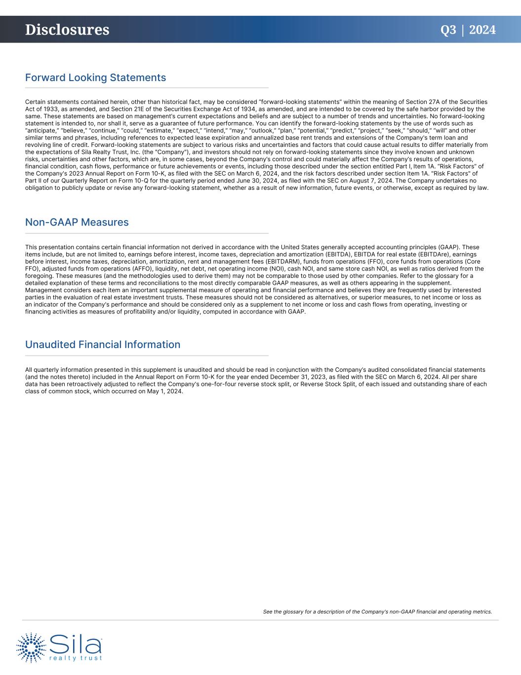 Q3 | 2024 This presentation contains certain financial information not derived in accordance with the United States generally accepted accounting principles (GAAP). These items include, but are not limited to, earnings before interest, income taxes, depreciation and amortization (EBITDA), EBITDA for real estate (EBITDAre), earnings before interest, income taxes, depreciation, amortization, rent and management fees (EBITDARM), funds from operations (FFO), core funds from operations (Core FFO), adjusted funds from operations (AFFO), liquidity, net debt, net operating income (NOI), cash NOI, and same store cash NOI, as well as ratios derived from the foregoing. These measures (and the methodologies used to derive them) may not be comparable to those used by other companies. Refer to the glossary for a detailed explanation of these terms and reconciliations to the most directly comparable GAAP measures, as well as others appearing in the supplement. Management considers each item an important supplemental measure of operating and financial performance and believes they are frequently used by interested parties in the evaluation of real estate investment trusts. These measures should not be considered as alternatives, or superior measures, to net income or loss as an indicator of the Company's performance and should be considered only as a supplement to net income or loss and cash flows from operating, investing or financing activities as measures of profitability and/or liquidity, computed in accordance with GAAP. Certain statements contained herein, other than historical fact, may be considered “forward-looking statements” within the meaning of Section 27A of the Securities Act of 1933, as amended, and Section 21E of the Securities Exchange Act of 1934, as amended, and are intended to be covered by the safe harbor provided by the same. These statements are based on management’s current expectations and beliefs and are subject to a number of trends and uncertainties. No forward-looking statement is intended to, nor shall it, serve as a guarantee of future performance. You can identify the forward-looking statements by the use of words such as “anticipate,” “believe,” “continue,” “could,” “estimate,” “expect,” “intend,” “may,” “outlook,” “plan,” “potential,” “predict,” “project,” “seek,” “should,” “will” and other similar terms and phrases, including references to expected lease expiration and annualized base rent trends and extensions of the Company's term loan and revolving line of credit. Forward-looking statements are subject to various risks and uncertainties and factors that could cause actual results to differ materially from the expectations of Sila Realty Trust, Inc. (the "Company"), and investors should not rely on forward-looking statements since they involve known and unknown risks, uncertainties and other factors, which are, in some cases, beyond the Company’s control and could materially affect the Company’s results of operations, financial condition, cash flows, performance or future achievements or events, including those described under the section entitled Part I, Item 1A. “Risk Factors” of the Company's 2023 Annual Report on Form 10-K, as filed with the SEC on March 6, 2024, and the risk factors described under section Item 1A. "Risk Factors" of Part II of our Quarterly Report on Form 10-Q for the quarterly period ended June 30, 2024, as filed with the SEC on August 7, 2024. The Company undertakes no obligation to publicly update or revise any forward-looking statement, whether as a result of new information, future events, or otherwise, except as required by law. Forward Looking Statements Non-GAAP Measures Unaudited Financial Information Disclosures All quarterly information presented in this supplement is unaudited and should be read in conjunction with the Company’s audited consolidated financial statements (and the notes thereto) included in the Annual Report on Form 10-K for the year ended December 31, 2023, as filed with the SEC on March 6, 2024. All per share data has been retroactively adjusted to reflect the Company's one-for-four reverse stock split, or Reverse Stock Split, of each issued and outstanding share of each class of common stock, which occurred on May 1, 2024. See the glossary for a description of the Company's non-GAAP financial and operating metrics.