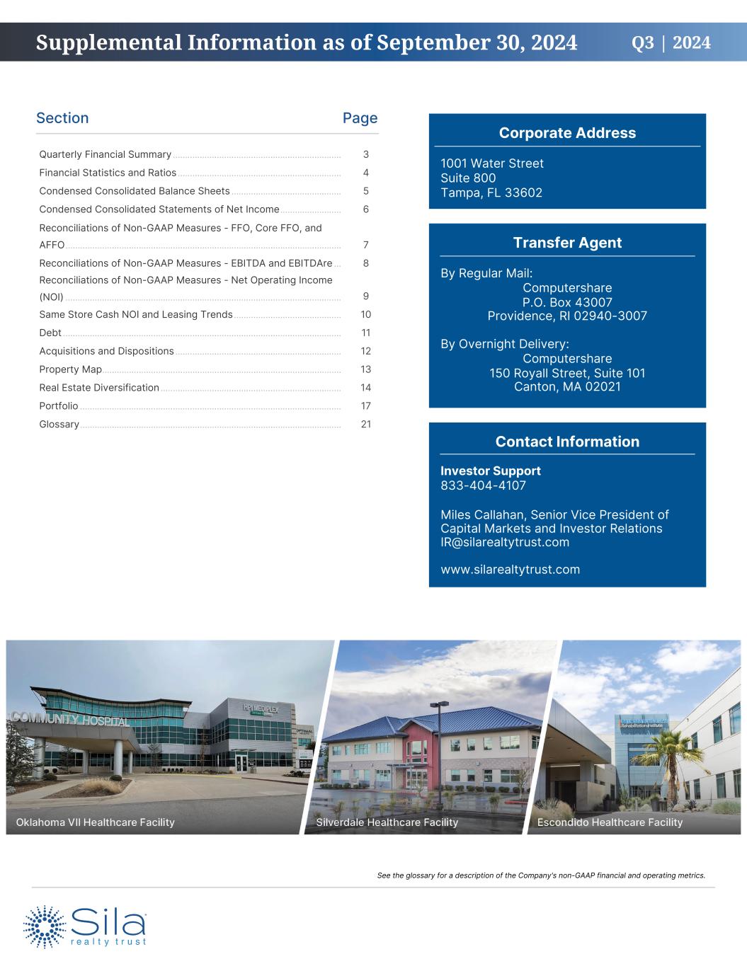 Q3 | 2024 Section Page Corporate Address 1001 Water Street Suite 800 Tampa, FL 33602 Transfer Agent By Regular Mail: Computershare P.O. Box 43007 Providence, RI 02940-3007 By Overnight Delivery: Computershare 150 Royall Street, Suite 101 Canton, MA 02021 Contact Information Investor Support 833-404-4107 Miles Callahan, Senior Vice President of Capital Markets and Investor Relations IR@silarealtytrust.com www.silarealtytrust.com Quarterly Financial Summary ..................................................................... 3 Financial Statistics and Ratios ................................................................... 4 Condensed Consolidated Balance Sheets ............................................. 5 Condensed Consolidated Statements of Net Income ......................... 6 Reconciliations of Non-GAAP Measures - FFO, Core FFO, and AFFO ................................................................................................................. 7 Reconciliations of Non-GAAP Measures - EBITDA and EBITDAre ... 8 Reconciliations of Non-GAAP Measures - Net Operating Income (NOI) ................................................................................................................. 9 Same Store Cash NOI and Leasing Trends ............................................ 10 Debt .................................................................................................................. 11 Acquisitions and Dispositions .................................................................... 12 Property Map .................................................................................................. 13 Real Estate Diversification .......................................................................... 14 Portfolio ........................................................................................................... 17 Glossary ........................................................................................................... 21 Supplemental Information as of September 30, 2024 See the glossary for a description of the Company's non-GAAP financial and operating metrics.