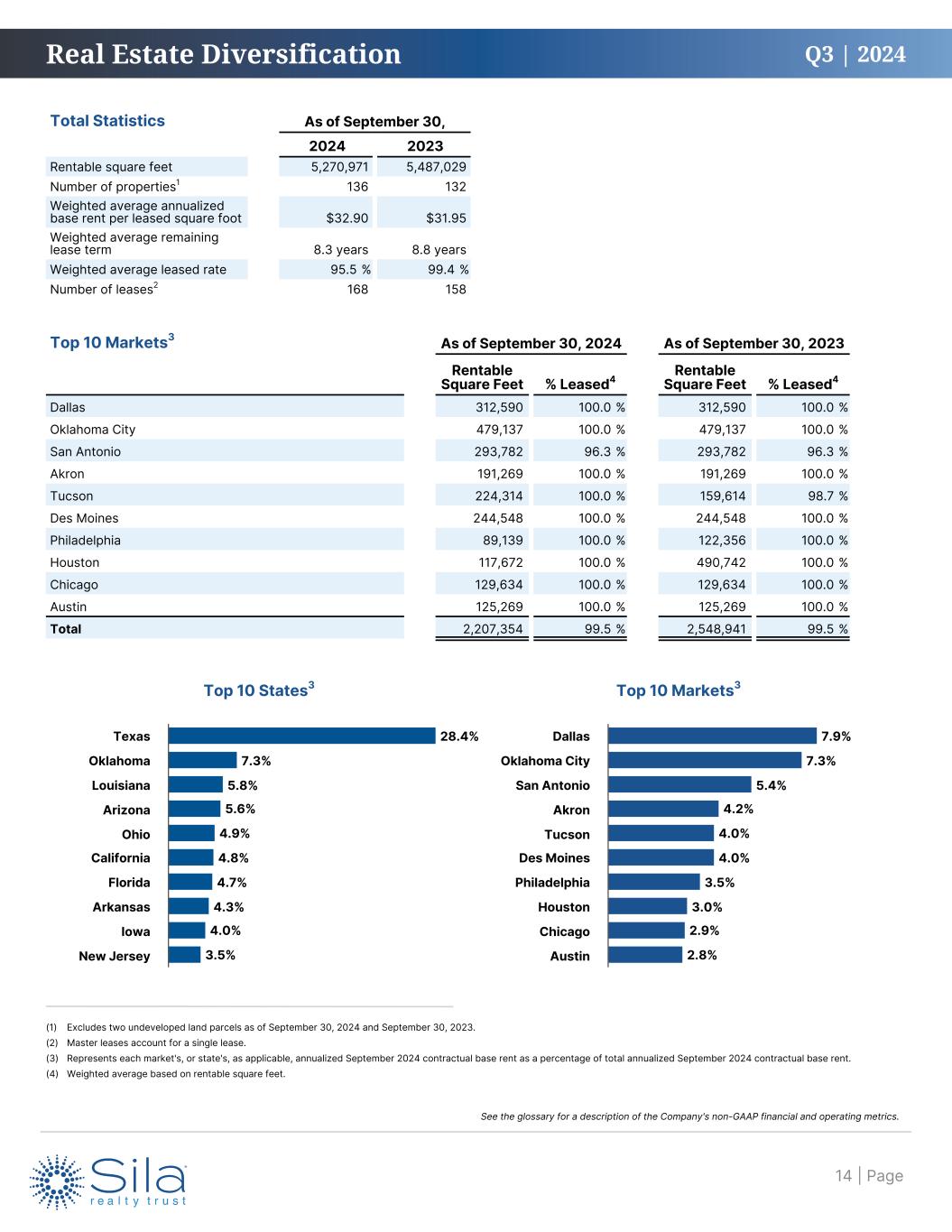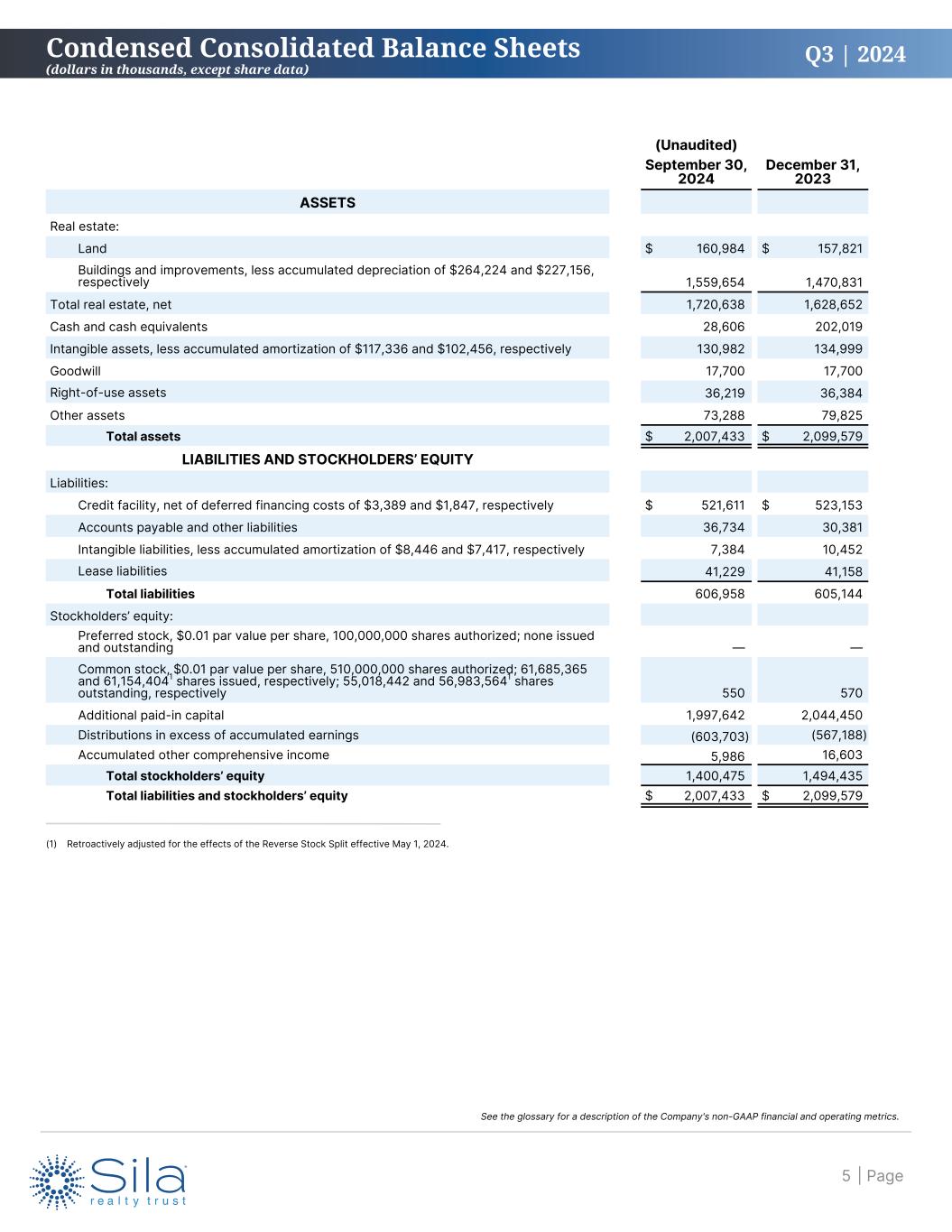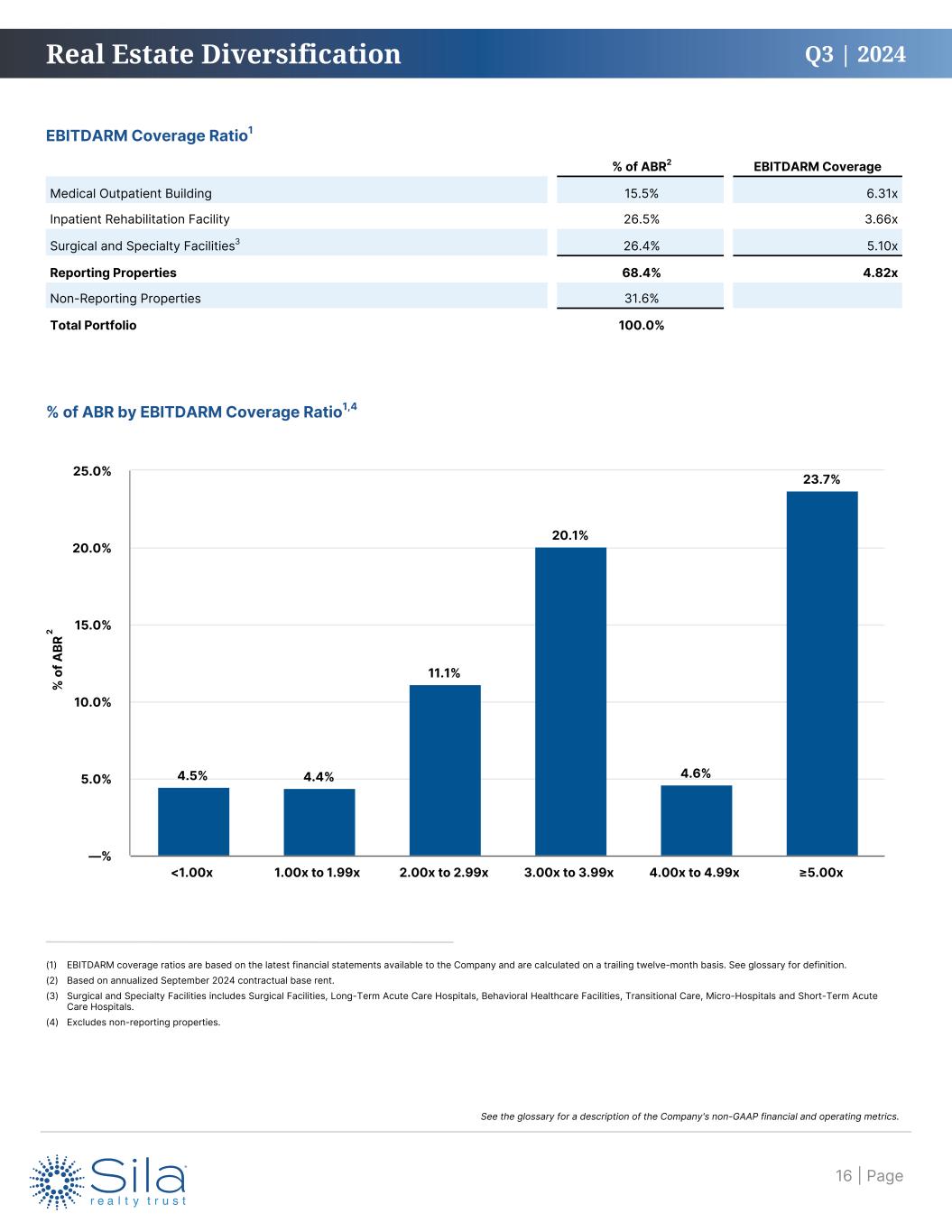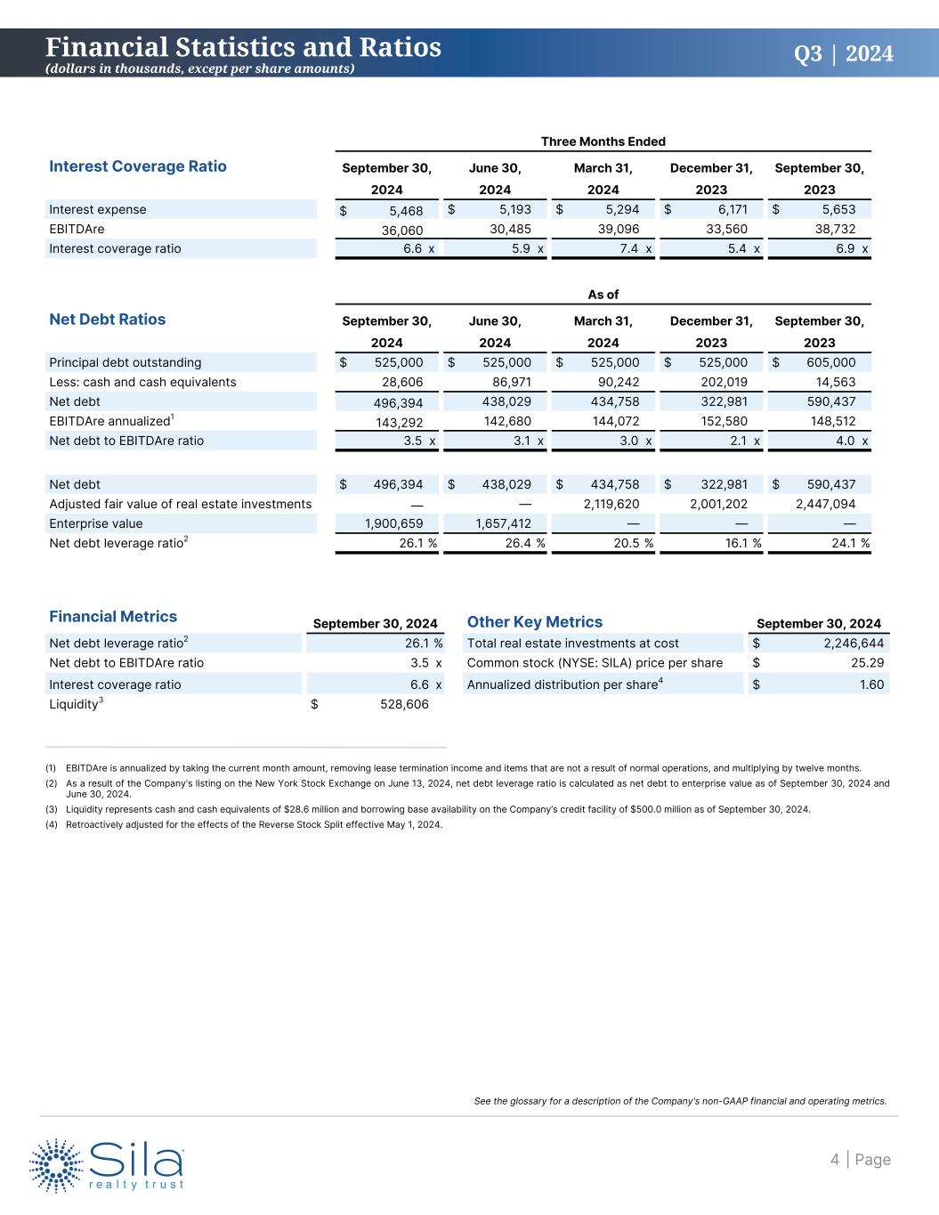 Q3 | 2024 Three Months Ended Interest Coverage Ratio September 30, June 30, March 31, December 31, September 30, 2024 2024 2024 2023 2023 Interest expense $ 5,468 $ 5,193 $ 5,294 $ 6,171 $ 5,653 EBITDAre 36,060 30,485 39,096 33,560 38,732 Interest coverage ratio 6.6 x 5.9 x 7.4 x 5.4 x 6.9 x As of Net Debt Ratios September 30, June 30, March 31, December 31, September 30, 2024 2024 2024 2023 2023 Principal debt outstanding $ 525,000 $ 525,000 $ 525,000 $ 525,000 $ 605,000 Less: cash and cash equivalents 28,606 86,971 90,242 202,019 14,563 Net debt 496,394 438,029 434,758 322,981 590,437 EBITDAre annualized1 143,292 142,680 144,072 152,580 148,512 Net debt to EBITDAre ratio 3.5 x 3.1 x 3.0 x 2.1 x 4.0 x Net debt $ 496,394 $ 438,029 $ 434,758 $ 322,981 $ 590,437 Adjusted fair value of real estate investments — — 2,119,620 2,001,202 2,447,094 Enterprise value 1,900,659 1,657,412 — — — Net debt leverage ratio2 26.1 % 26.4 % 20.5 % 16.1 % 24.1 % Financial Metrics September 30, 2024 Other Key Metrics September 30, 2024 Net debt leverage ratio2 26.1 % Total real estate investments at cost $ 2,246,644 Net debt to EBITDAre ratio 3.5 x Common stock (NYSE: SILA) price per share $ 25.29 Interest coverage ratio 6.6 x Annualized distribution per share4 $ 1.60 Liquidity3 $ 528,606 (1) EBITDAre is annualized by taking the current month amount, removing lease termination income and items that are not a result of normal operations, and multiplying by twelve months. (2) As a result of the Company's listing on the New York Stock Exchange on June 13, 2024, net debt leverage ratio is calculated as net debt to enterprise value as of September 30, 2024 and June 30, 2024. (3) Liquidity represents cash and cash equivalents of $28.6 million and borrowing base availability on the Company’s credit facility of $500.0 million as of September 30, 2024. (4) Retroactively adjusted for the effects of the Reverse Stock Split effective May 1, 2024. Financial Statistics and Ratios (dollars in thousands, except per share amounts) | Page4 See the glossary for a description of the Company's non-GAAP financial and operating metrics.